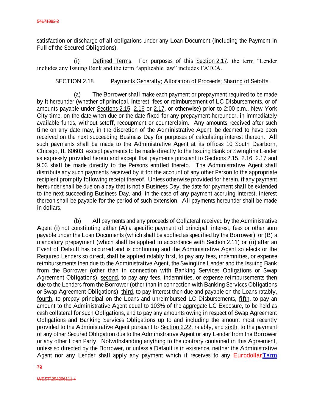 54171882.2 79 WEST\294266111.4 satisfaction or discharge of all obligations under any Loan Document (including the Payment in Full of the Secured Obligations). (i) Defined Terms. For purposes of this Section 2.17, the term “Lender includes any Issuing Bank and the term “applicable law” includes FATCA. SECTION 2.18 Payments Generally; Allocation of Proceeds; Sharing of Setoffs. (a) The Borrower shall make each payment or prepayment required to be made by it hereunder (whether of principal, interest, fees or reimbursement of LC Disbursements, or of amounts payable under Sections 2.15, 2.16 or 2.17, or otherwise) prior to 2:00 p.m., New York City time, on the date when due or the date fixed for any prepayment hereunder, in immediately available funds, without setoff, recoupment or counterclaim. Any amounts received after such time on any date may, in the discretion of the Administrative Agent, be deemed to have been received on the next succeeding Business Day for purposes of calculating interest thereon. All such payments shall be made to the Administrative Agent at its offices 10 South Dearborn, Chicago, IL 60603, except payments to be made directly to the Issuing Bank or Swingline Lender as expressly provided herein and except that payments pursuant to Sections 2.15, 2.16, 2.17 and 9.03 shall be made directly to the Persons entitled thereto. The Administrative Agent shall distribute any such payments received by it for the account of any other Person to the appropriate recipient promptly following receipt thereof. Unless otherwise provided for herein, if any payment hereunder shall be due on a day that is not a Business Day, the date for payment shall be extended to the next succeeding Business Day, and, in the case of any payment accruing interest, interest thereon shall be payable for the period of such extension. All payments hereunder shall be made in dollars. (b) All payments and any proceeds of Collateral received by the Administrative Agent (i) not constituting either (A) a specific payment of principal, interest, fees or other sum payable under the Loan Documents (which shall be applied as specified by the Borrower), or (B) a mandatory prepayment (which shall be applied in accordance with Section 2.11) or (ii) after an Event of Default has occurred and is continuing and the Administrative Agent so elects or the Required Lenders so direct, shall be applied ratably first, to pay any fees, indemnities, or expense reimbursements then due to the Administrative Agent, the Swingline Lender and the Issuing Bank from the Borrower (other than in connection with Banking Services Obligations or Swap Agreement Obligations), second, to pay any fees, indemnities, or expense reimbursements then due to the Lenders from the Borrower (other than in connection with Banking Services Obligations or Swap Agreement Obligations), third, to pay interest then due and payable on the Loans ratably, fourth, to prepay principal on the Loans and unreimbursed LC Disbursements, fifth, to pay an amount to the Administrative Agent equal to 103% of the aggregate LC Exposure, to be held as cash collateral for such Obligations, and to pay any amounts owing in respect of Swap Agreement Obligations and Banking Services Obligations up to and including the amount most recently provided to the Administrative Agent pursuant to Section 2.22, ratably, and sixth, to the payment of any other Secured Obligation due to the Administrative Agent or any Lender from the Borrower or any other Loan Party. Notwithstanding anything to the contrary contained in this Agreement, unless so directed by the Borrower, or unless a Default is in existence, neither the Administrative Agent nor any Lender shall apply any payment which it receives to any EurodollarTerm