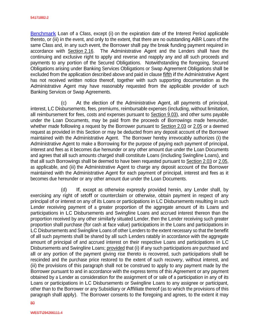 54171882.2 80 WEST\294266111.4 Benchmark Loan of a Class, except (i) on the expiration date of the Interest Period applicable thereto, or (ii) in the event, and only to the extent, that there are no outstanding ABR Loans of the same Class and, in any such event, the Borrower shall pay the break funding payment required in accordance with Section 2.16. The Administrative Agent and the Lenders shall have the continuing and exclusive right to apply and reverse and reapply any and all such proceeds and payments to any portion of the Secured Obligations. Notwithstanding the foregoing, Secured Obligations arising under Banking Services Obligations or Swap Agreement Obligations shall be excluded from the application described above and paid in clause fifth if the Administrative Agent has not received written notice thereof, together with such supporting documentation as the Administrative Agent may have reasonably requested from the applicable provider of such Banking Services or Swap Agreements. (c) At the election of the Administrative Agent, all payments of principal, interest, LC Disbursements, fees, premiums, reimbursable expenses (including, without limitation, all reimbursement for fees, costs and expenses pursuant to Section 9.03), and other sums payable under the Loan Documents, may be paid from the proceeds of Borrowings made hereunder, whether made following a request by the Borrower pursuant to Section 2.03 or 2.05 or a deemed request as provided in this Section or may be deducted from any deposit account of the Borrower maintained with the Administrative Agent. The Borrower hereby irrevocably authorizes (i) the Administrative Agent to make a Borrowing for the purpose of paying each payment of principal, interest and fees as it becomes due hereunder or any other amount due under the Loan Documents and agrees that all such amounts charged shall constitute Loans (including Swingline Loans), and that all such Borrowings shall be deemed to have been requested pursuant to Section 2.03 or 2.05, as applicable, and (ii) the Administrative Agent to charge any deposit account of the Borrower maintained with the Administrative Agent for each payment of principal, interest and fees as it becomes due hereunder or any other amount due under the Loan Documents. (d) If, except as otherwise expressly provided herein, any Lender shall, by exercising any right of setoff or counterclaim or otherwise, obtain payment in respect of any principal of or interest on any of its Loans or participations in LC Disbursements resulting in such Lender receiving payment of a greater proportion of the aggregate amount of its Loans and participations in LC Disbursements and Swingline Loans and accrued interest thereon than the proportion received by any other similarly situated Lender, then the Lender receiving such greater proportion shall purchase (for cash at face value) participations in the Loans and participations in LC Disbursements and Swingline Loans of other Lenders to the extent necessary so that the benefit of all such payments shall be shared by all such Lenders ratably in accordance with the aggregate amount of principal of and accrued interest on their respective Loans and participations in LC Disbursements and Swingline Loans; provided that (i) if any such participations are purchased and all or any portion of the payment giving rise thereto is recovered, such participations shall be rescinded and the purchase price restored to the extent of such recovery, without interest, and (ii) the provisions of this paragraph shall not be construed to apply to any payment made by the Borrower pursuant to and in accordance with the express terms of this Agreement or any payment obtained by a Lender as consideration for the assignment of or sale of a participation in any of its Loans or participations in LC Disbursements or Swingline Loans to any assignee or participant, other than to the Borrower or any Subsidiary or Affiliate thereof (as to which the provisions of this paragraph shall apply). The Borrower consents to the foregoing and agrees, to the extent it may