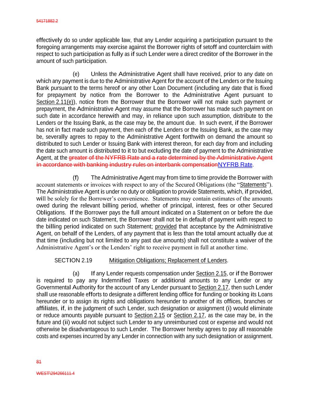 54171882.2 81 WEST\294266111.4 effectively do so under applicable law, that any Lender acquiring a participation pursuant to the foregoing arrangements may exercise against the Borrower rights of setoff and counterclaim with respect to such participation as fully as if such Lender were a direct creditor of the Borrower in the amount of such participation. (e) Unless the Administrative Agent shall have received, prior to any date on which any payment is due to the Administrative Agent for the account of the Lenders or the Issuing Bank pursuant to the terms hereof or any other Loan Document (including any date that is fixed for prepayment by notice from the Borrower to the Administrative Agent pursuant to Section 2.11(e)), notice from the Borrower that the Borrower will not make such payment or prepayment, the Administrative Agent may assume that the Borrower has made such payment on such date in accordance herewith and may, in reliance upon such assumption, distribute to the Lenders or the Issuing Bank, as the case may be, the amount due. In such event, if the Borrower has not in fact made such payment, then each of the Lenders or the Issuing Bank, as the case may be, severally agrees to repay to the Administrative Agent forthwith on demand the amount so distributed to such Lender or Issuing Bank with interest thereon, for each day from and including the date such amount is distributed to it to but excluding the date of payment to the Administrative Agent, at the greater of the NYFRB Rate and a rate determined by the Administrative Agent in accordance with banking industry rules on interbank compensationNYFRB Rate. (f) The Administrative Agent may from time to time provide the Borrower with account statements or invoices with respect to any of the Secured Obligations (the “Statements”). The Administrative Agent is under no duty or obligation to provide Statements, which, if provided, will be solely for the Borrower’s convenience. Statements may contain estimates of the amounts owed during the relevant billing period, whether of principal, interest, fees or other Secured Obligations. If the Borrower pays the full amount indicated on a Statement on or before the due date indicated on such Statement, the Borrower shall not be in default of payment with respect to the billing period indicated on such Statement; provided that acceptance by the Administrative Agent, on behalf of the Lenders, of any payment that is less than the total amount actually due at that time (including but not limited to any past due amounts) shall not constitute a waiver of the Administrative Agent’s or the Lenders’ right to receive payment in full at another time. SECTION 2.19 Mitigation Obligations; Replacement of Lenders. (a) If any Lender requests compensation under Section 2.15, or if the Borrower is required to pay any Indemnified Taxes or additional amounts to any Lender or any Governmental Authority for the account of any Lender pursuant to Section 2.17, then such Lender shall use reasonable efforts to designate a different lending office for funding or booking its Loans hereunder or to assign its rights and obligations hereunder to another of its offices, branches or affiliates, if, in the judgment of such Lender, such designation or assignment (i) would eliminate or reduce amounts payable pursuant to Section 2.15 or Section 2.17, as the case may be, in the future and (ii) would not subject such Lender to any unreimbursed cost or expense and would not otherwise be disadvantageous to such Lender. The Borrower hereby agrees to pay all reasonable costs and expenses incurred by any Lender in connection with any such designation or assignment.
