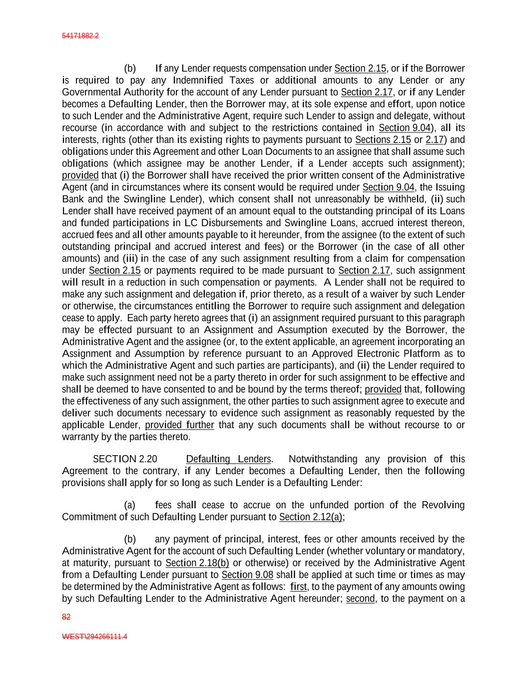 54171882.2 82 WEST\294266111.4 (b) If any Lender requests compensation under Section 2.15, or if the Borrower is required to pay any Indemnified Taxes or additional amounts to any Lender or any Governmental Authority for the account of any Lender pursuant to Section 2.17, or if any Lender becomes a Defaulting Lender, then the Borrower may, at its sole expense and effort, upon notice to such Lender and the Administrative Agent, require such Lender to assign and delegate, without recourse (in accordance with and subject to the restrictions contained in Section 9.04), all its interests, rights (other than its existing rights to payments pursuant to Sections 2.15 or 2.17) and obligations under this Agreement and other Loan Documents to an assignee that shall assume such obligations (which assignee may be another Lender, if a Lender accepts such assignment); provided that (i) the Borrower shall have received the prior written consent of the Administrative Agent (and in circumstances where its consent would be required under Section 9.04, the Issuing Bank and the Swingline Lender), which consent shall not unreasonably be withheld, (ii) such Lender shall have received payment of an amount equal to the outstanding principal of its Loans and funded participations in LC Disbursements and Swingline Loans, accrued interest thereon, accrued fees and all other amounts payable to it hereunder, from the assignee (to the extent of such outstanding principal and accrued interest and fees) or the Borrower (in the case of all other amounts) and (iii) in the case of any such assignment resulting from a claim for compensation under Section 2.15 or payments required to be made pursuant to Section 2.17, such assignment will result in a reduction in such compensation or payments. A Lender shall not be required to make any such assignment and delegation if, prior thereto, as a result of a waiver by such Lender or otherwise, the circumstances entitling the Borrower to require such assignment and delegation cease to apply. Each party hereto agrees that (i) an assignment required pursuant to this paragraph may be effected pursuant to an Assignment and Assumption executed by the Borrower, the Administrative Agent and the assignee (or, to the extent applicable, an agreement incorporating an Assignment and Assumption by reference pursuant to an Approved Electronic Platform as to which the Administrative Agent and such parties are participants), and (ii) the Lender required to make such assignment need not be a party thereto in order for such assignment to be effective and shall be deemed to have consented to and be bound by the terms thereof; provided that, following the effectiveness of any such assignment, the other parties to such assignment agree to execute and deliver such documents necessary to evidence such assignment as reasonably requested by the applicable Lender, provided further that any such documents shall be without recourse to or warranty by the parties thereto. SECTION 2.20 Defaulting Lenders. Notwithstanding any provision of this Agreement to the contrary, if any Lender becomes a Defaulting Lender, then the following provisions shall apply for so long as such Lender is a Defaulting Lender: (a) fees shall cease to accrue on the unfunded portion of the Revolving Commitment of such Defaulting Lender pursuant to Section 2.12(a); (b) any payment of principal, interest, fees or other amounts received by the Administrative Agent for the account of such Defaulting Lender (whether voluntary or mandatory, at maturity, pursuant to Section 2.18(b) or otherwise) or received by the Administrative Agent from a Defaulting Lender pursuant to Section 9.08 shall be applied at such time or times as may be determined by the Administrative Agent as follows: first, to the payment of any amounts owing by such Defaulting Lender to the Administrative Agent hereunder; second, to the payment on a