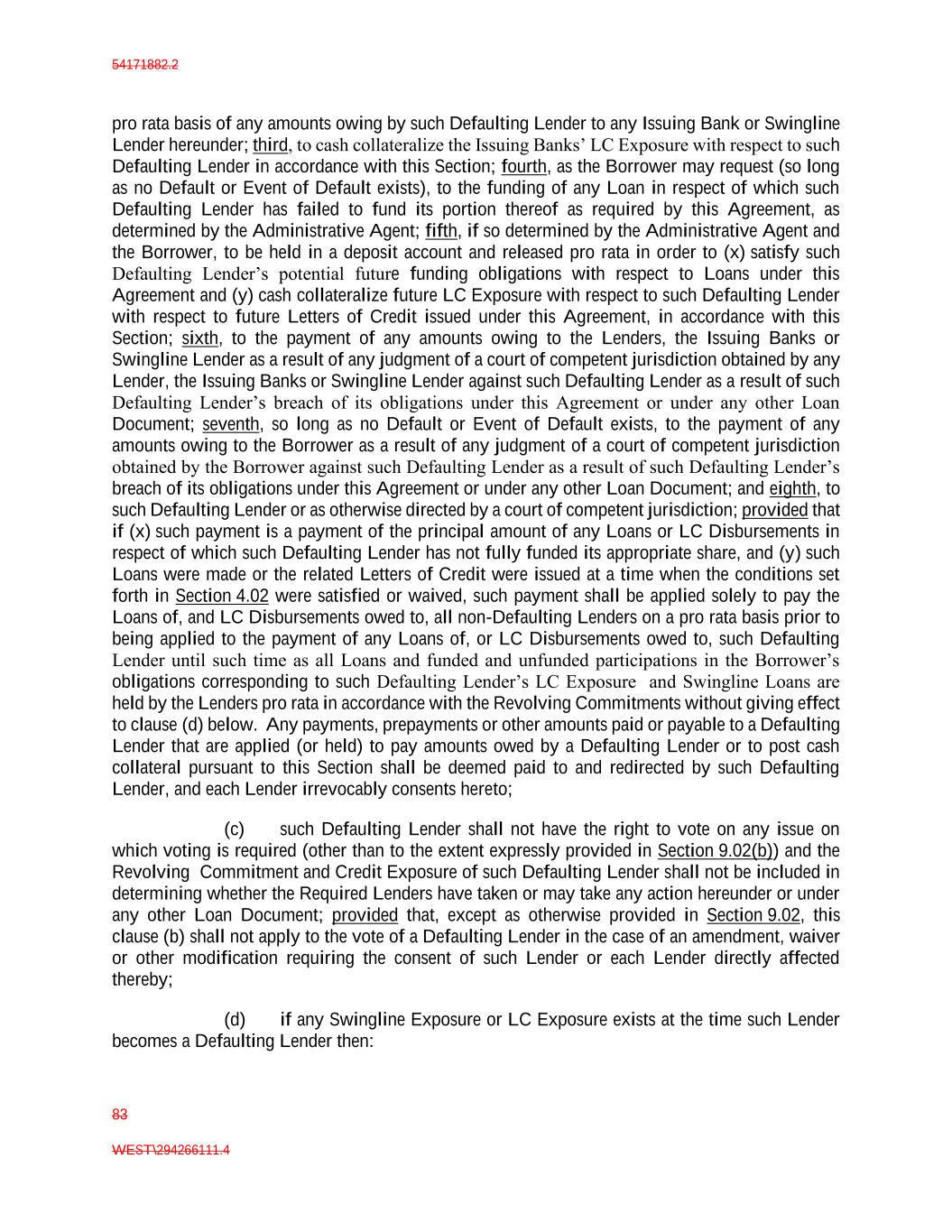 54171882.2 83 WEST\294266111.4 pro rata basis of any amounts owing by such Defaulting Lender to any Issuing Bank or Swingline Lender hereunder; third, to cash collateralize the Issuing Banks’ LC Exposure with respect to such Defaulting Lender in accordance with this Section; fourth, as the Borrower may request (so long as no Default or Event of Default exists), to the funding of any Loan in respect of which such Defaulting Lender has failed to fund its portion thereof as required by this Agreement, as determined by the Administrative Agent; fifth, if so determined by the Administrative Agent and the Borrower, to be held in a deposit account and released pro rata in order to (x) satisfy such Defaulting Lender’s potential future funding obligations with respect to Loans under this Agreement and (y) cash collateralize future LC Exposure with respect to such Defaulting Lender with respect to future Letters of Credit issued under this Agreement, in accordance with this Section; sixth, to the payment of any amounts owing to the Lenders, the Issuing Banks or Swingline Lender as a result of any judgment of a court of competent jurisdiction obtained by any Lender, the Issuing Banks or Swingline Lender against such Defaulting Lender as a result of such Defaulting Lender’s breach of its obligations under this Agreement or under any other Loan Document; seventh, so long as no Default or Event of Default exists, to the payment of any amounts owing to the Borrower as a result of any judgment of a court of competent jurisdiction obtained by the Borrower against such Defaulting Lender as a result of such Defaulting Lender’s breach of its obligations under this Agreement or under any other Loan Document; and eighth, to such Defaulting Lender or as otherwise directed by a court of competent jurisdiction; provided that if (x) such payment is a payment of the principal amount of any Loans or LC Disbursements in respect of which such Defaulting Lender has not fully funded its appropriate share, and (y) such Loans were made or the related Letters of Credit were issued at a time when the conditions set forth in Section 4.02 were satisfied or waived, such payment shall be applied solely to pay the Loans of, and LC Disbursements owed to, all non-Defaulting Lenders on a pro rata basis prior to being applied to the payment of any Loans of, or LC Disbursements owed to, such Defaulting Lender until such time as all Loans and funded and unfunded participations in the Borrower’s obligations corresponding to such Defaulting Lender’s LC Exposure and Swingline Loans are held by the Lenders pro rata in accordance with the Revolving Commitments without giving effect to clause (d) below. Any payments, prepayments or other amounts paid or payable to a Defaulting Lender that are applied (or held) to pay amounts owed by a Defaulting Lender or to post cash collateral pursuant to this Section shall be deemed paid to and redirected by such Defaulting Lender, and each Lender irrevocably consents hereto; (c) such Defaulting Lender shall not have the right to vote on any issue on which voting is required (other than to the extent expressly provided in Section 9.02(b)) and the Revolving Commitment and Credit Exposure of such Defaulting Lender shall not be included in determining whether the Required Lenders have taken or may take any action hereunder or under any other Loan Document; provided that, except as otherwise provided in Section 9.02, this clause (b) shall not apply to the vote of a Defaulting Lender in the case of an amendment, waiver or other modification requiring the consent of such Lender or each Lender directly affected thereby; (d) if any Swingline Exposure or LC Exposure exists at the time such Lender becomes a Defaulting Lender then: