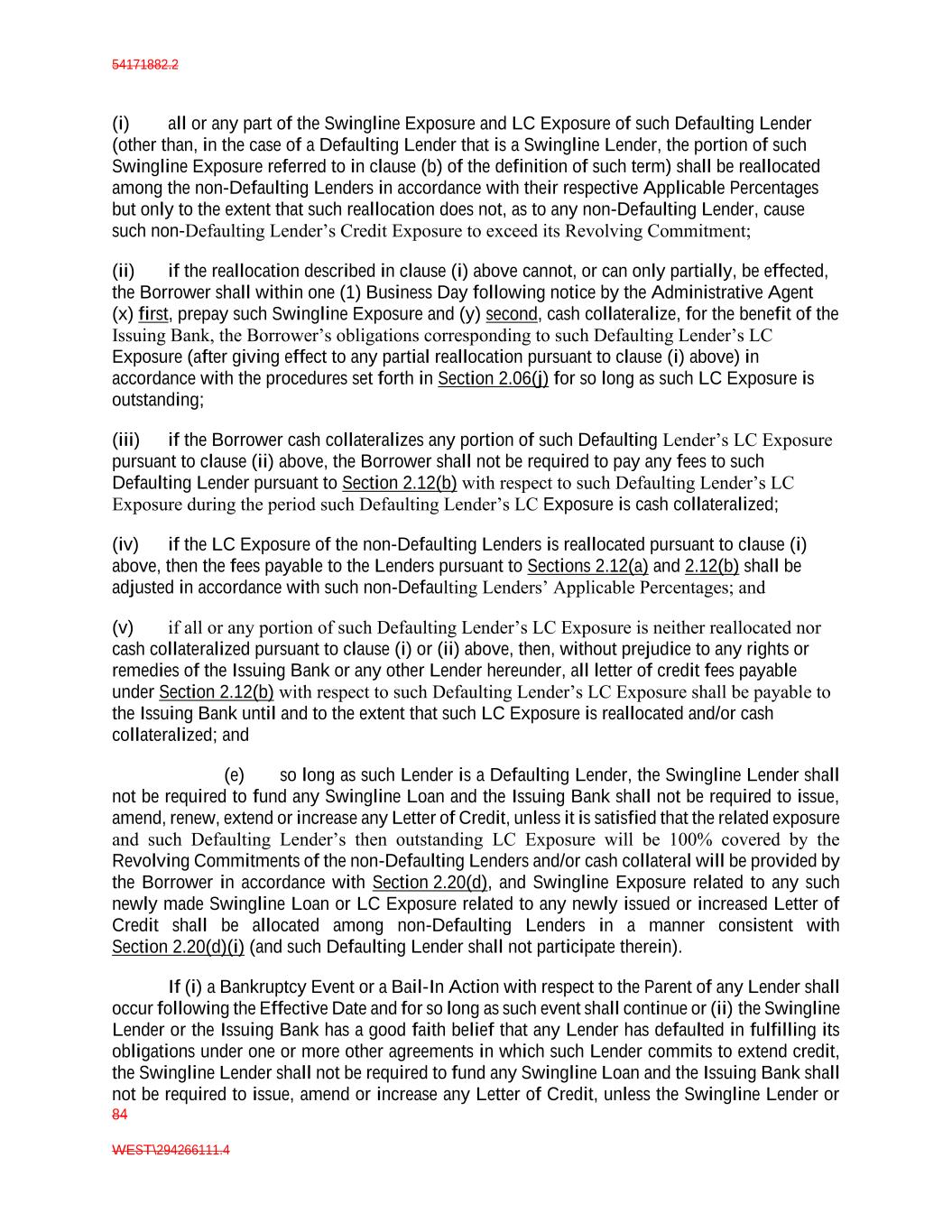 54171882.2 84 WEST\294266111.4 (i) all or any part of the Swingline Exposure and LC Exposure of such Defaulting Lender (other than, in the case of a Defaulting Lender that is a Swingline Lender, the portion of such Swingline Exposure referred to in clause (b) of the definition of such term) shall be reallocated among the non-Defaulting Lenders in accordance with their respective Applicable Percentages but only to the extent that such reallocation does not, as to any non-Defaulting Lender, cause such non-Defaulting Lender’s Credit Exposure to exceed its Revolving Commitment; (ii) if the reallocation described in clause (i) above cannot, or can only partially, be effected, the Borrower shall within one (1) Business Day following notice by the Administrative Agent (x) first, prepay such Swingline Exposure and (y) second, cash collateralize, for the benefit of the Issuing Bank, the Borrower’s obligations corresponding to such Defaulting Lender’s LC Exposure (after giving effect to any partial reallocation pursuant to clause (i) above) in accordance with the procedures set forth in Section 2.06(j) for so long as such LC Exposure is outstanding; (iii) if the Borrower cash collateralizes any portion of such Defaulting Lender’s LC Exposure pursuant to clause (ii) above, the Borrower shall not be required to pay any fees to such Defaulting Lender pursuant to Section 2.12(b) with respect to such Defaulting Lender’s LC Exposure during the period such Defaulting Lender’s LC Exposure is cash collateralized; (iv) if the LC Exposure of the non-Defaulting Lenders is reallocated pursuant to clause (i) above, then the fees payable to the Lenders pursuant to Sections 2.12(a) and 2.12(b) shall be adjusted in accordance with such non-Defaulting Lenders’ Applicable Percentages; and (v) if all or any portion of such Defaulting Lender’s LC Exposure is neither reallocated nor cash collateralized pursuant to clause (i) or (ii) above, then, without prejudice to any rights or remedies of the Issuing Bank or any other Lender hereunder, all letter of credit fees payable under Section 2.12(b) with respect to such Defaulting Lender’s LC Exposure shall be payable to the Issuing Bank until and to the extent that such LC Exposure is reallocated and/or cash collateralized; and (e) so long as such Lender is a Defaulting Lender, the Swingline Lender shall not be required to fund any Swingline Loan and the Issuing Bank shall not be required to issue, amend, renew, extend or increase any Letter of Credit, unless it is satisfied that the related exposure and such Defaulting Lender’s then outstanding LC Exposure will be 100% covered by the Revolving Commitments of the non-Defaulting Lenders and/or cash collateral will be provided by the Borrower in accordance with Section 2.20(d), and Swingline Exposure related to any such newly made Swingline Loan or LC Exposure related to any newly issued or increased Letter of Credit shall be allocated among non-Defaulting Lenders in a manner consistent with Section 2.20(d)(i) (and such Defaulting Lender shall not participate therein). If (i) a Bankruptcy Event or a Bail-In Action with respect to the Parent of any Lender shall occur following the Effective Date and for so long as such event shall continue or (ii) the Swingline Lender or the Issuing Bank has a good faith belief that any Lender has defaulted in fulfilling its obligations under one or more other agreements in which such Lender commits to extend credit, the Swingline Lender shall not be required to fund any Swingline Loan and the Issuing Bank shall not be required to issue, amend or increase any Letter of Credit, unless the Swingline Lender or