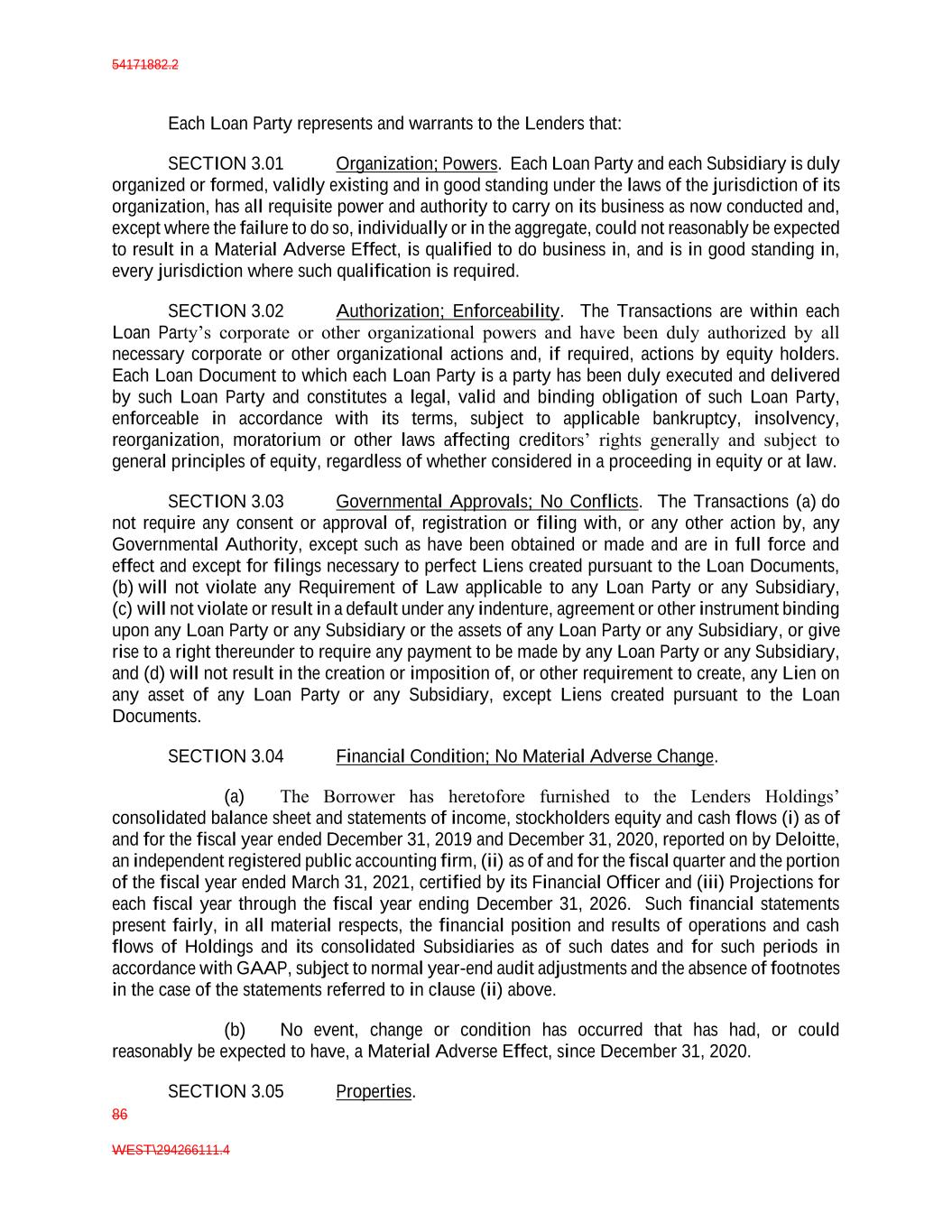 54171882.2 86 WEST\294266111.4 Each Loan Party represents and warrants to the Lenders that: SECTION 3.01 Organization; Powers. Each Loan Party and each Subsidiary is duly organized or formed, validly existing and in good standing under the laws of the jurisdiction of its organization, has all requisite power and authority to carry on its business as now conducted and, except where the failure to do so, individually or in the aggregate, could not reasonably be expected to result in a Material Adverse Effect, is qualified to do business in, and is in good standing in, every jurisdiction where such qualification is required. SECTION 3.02 Authorization; Enforceability. The Transactions are within each Loan Party’s corporate or other organizational powers and have been duly authorized by all necessary corporate or other organizational actions and, if required, actions by equity holders. Each Loan Document to which each Loan Party is a party has been duly executed and delivered by such Loan Party and constitutes a legal, valid and binding obligation of such Loan Party, enforceable in accordance with its terms, subject to applicable bankruptcy, insolvency, reorganization, moratorium or other laws affecting creditors’ rights generally and subject to general principles of equity, regardless of whether considered in a proceeding in equity or at law. SECTION 3.03 Governmental Approvals; No Conflicts. The Transactions (a) do not require any consent or approval of, registration or filing with, or any other action by, any Governmental Authority, except such as have been obtained or made and are in full force and effect and except for filings necessary to perfect Liens created pursuant to the Loan Documents, (b) will not violate any Requirement of Law applicable to any Loan Party or any Subsidiary, (c) will not violate or result in a default under any indenture, agreement or other instrument binding upon any Loan Party or any Subsidiary or the assets of any Loan Party or any Subsidiary, or give rise to a right thereunder to require any payment to be made by any Loan Party or any Subsidiary, and (d) will not result in the creation or imposition of, or other requirement to create, any Lien on any asset of any Loan Party or any Subsidiary, except Liens created pursuant to the Loan Documents. SECTION 3.04 Financial Condition; No Material Adverse Change. (a) The Borrower has heretofore furnished to the Lenders Holdings’ consolidated balance sheet and statements of income, stockholders equity and cash flows (i) as of and for the fiscal year ended December 31, 2019 and December 31, 2020, reported on by Deloitte, an independent registered public accounting firm, (ii) as of and for the fiscal quarter and the portion of the fiscal year ended March 31, 2021, certified by its Financial Officer and (iii) Projections for each fiscal year through the fiscal year ending December 31, 2026. Such financial statements present fairly, in all material respects, the financial position and results of operations and cash flows of Holdings and its consolidated Subsidiaries as of such dates and for such periods in accordance with GAAP, subject to normal year-end audit adjustments and the absence of footnotes in the case of the statements referred to in clause (ii) above. (b) No event, change or condition has occurred that has had, or could reasonably be expected to have, a Material Adverse Effect, since December 31, 2020. SECTION 3.05 Properties.