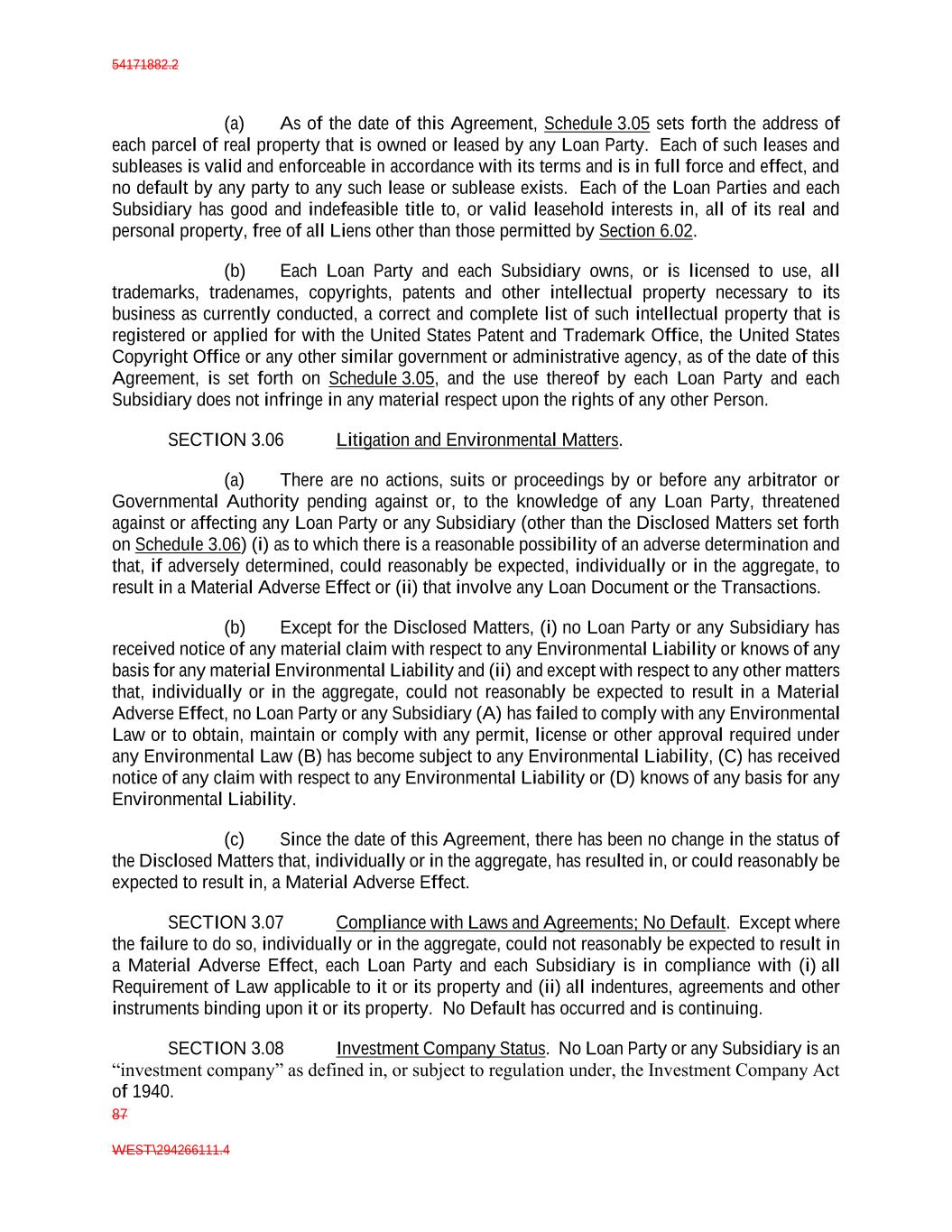 54171882.2 87 WEST\294266111.4 (a) As of the date of this Agreement, Schedule 3.05 sets forth the address of each parcel of real property that is owned or leased by any Loan Party. Each of such leases and subleases is valid and enforceable in accordance with its terms and is in full force and effect, and no default by any party to any such lease or sublease exists. Each of the Loan Parties and each Subsidiary has good and indefeasible title to, or valid leasehold interests in, all of its real and personal property, free of all Liens other than those permitted by Section 6.02. (b) Each Loan Party and each Subsidiary owns, or is licensed to use, all trademarks, tradenames, copyrights, patents and other intellectual property necessary to its business as currently conducted, a correct and complete list of such intellectual property that is registered or applied for with the United States Patent and Trademark Office, the United States Copyright Office or any other similar government or administrative agency, as of the date of this Agreement, is set forth on Schedule 3.05, and the use thereof by each Loan Party and each Subsidiary does not infringe in any material respect upon the rights of any other Person. SECTION 3.06 Litigation and Environmental Matters. (a) There are no actions, suits or proceedings by or before any arbitrator or Governmental Authority pending against or, to the knowledge of any Loan Party, threatened against or affecting any Loan Party or any Subsidiary (other than the Disclosed Matters set forth on Schedule 3.06) (i) as to which there is a reasonable possibility of an adverse determination and that, if adversely determined, could reasonably be expected, individually or in the aggregate, to result in a Material Adverse Effect or (ii) that involve any Loan Document or the Transactions. (b) Except for the Disclosed Matters, (i) no Loan Party or any Subsidiary has received notice of any material claim with respect to any Environmental Liability or knows of any basis for any material Environmental Liability and (ii) and except with respect to any other matters that, individually or in the aggregate, could not reasonably be expected to result in a Material Adverse Effect, no Loan Party or any Subsidiary (A) has failed to comply with any Environmental Law or to obtain, maintain or comply with any permit, license or other approval required under any Environmental Law (B) has become subject to any Environmental Liability, (C) has received notice of any claim with respect to any Environmental Liability or (D) knows of any basis for any Environmental Liability. (c) Since the date of this Agreement, there has been no change in the status of the Disclosed Matters that, individually or in the aggregate, has resulted in, or could reasonably be expected to result in, a Material Adverse Effect. SECTION 3.07 Compliance with Laws and Agreements; No Default. Except where the failure to do so, individually or in the aggregate, could not reasonably be expected to result in a Material Adverse Effect, each Loan Party and each Subsidiary is in compliance with (i) all Requirement of Law applicable to it or its property and (ii) all indentures, agreements and other instruments binding upon it or its property. No Default has occurred and is continuing. SECTION 3.08 Investment Company Status. No Loan Party or any Subsidiary is an “investment company” as defined in, or subject to regulation under, the Investment Company Act of 1940.