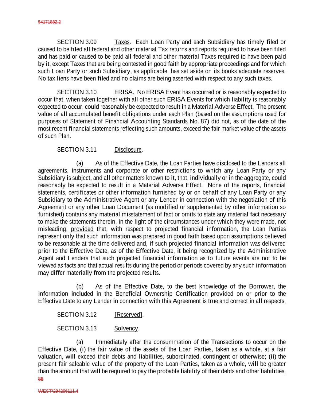 54171882.2 88 WEST\294266111.4 SECTION 3.09 Taxes. Each Loan Party and each Subsidiary has timely filed or caused to be filed all federal and other material Tax returns and reports required to have been filed and has paid or caused to be paid all federal and other material Taxes required to have been paid by it, except Taxes that are being contested in good faith by appropriate proceedings and for which such Loan Party or such Subsidiary, as applicable, has set aside on its books adequate reserves. No tax liens have been filed and no claims are being asserted with respect to any such taxes. SECTION 3.10 ERISA. No ERISA Event has occurred or is reasonably expected to occur that, when taken together with all other such ERISA Events for which liability is reasonably expected to occur, could reasonably be expected to result in a Material Adverse Effect. The present value of all accumulated benefit obligations under each Plan (based on the assumptions used for purposes of Statement of Financial Accounting Standards No. 87) did not, as of the date of the most recent financial statements reflecting such amounts, exceed the fair market value of the assets of such Plan. SECTION 3.11 Disclosure. (a) As of the Effective Date, the Loan Parties have disclosed to the Lenders all agreements, instruments and corporate or other restrictions to which any Loan Party or any Subsidiary is subject, and all other matters known to it, that, individually or in the aggregate, could reasonably be expected to result in a Material Adverse Effect. None of the reports, financial statements, certificates or other information furnished by or on behalf of any Loan Party or any Subsidiary to the Administrative Agent or any Lender in connection with the negotiation of this Agreement or any other Loan Document (as modified or supplemented by other information so furnished) contains any material misstatement of fact or omits to state any material fact necessary to make the statements therein, in the light of the circumstances under which they were made, not misleading; provided that, with respect to projected financial information, the Loan Parties represent only that such information was prepared in good faith based upon assumptions believed to be reasonable at the time delivered and, if such projected financial information was delivered prior to the Effective Date, as of the Effective Date, it being recognized by the Administrative Agent and Lenders that such projected financial information as to future events are not to be viewed as facts and that actual results during the period or periods covered by any such information may differ materially from the projected results. (b) As of the Effective Date, to the best knowledge of the Borrower, the information included in the Beneficial Ownership Certification provided on or prior to the Effective Date to any Lender in connection with this Agreement is true and correct in all respects. SECTION 3.12 [Reserved]. SECTION 3.13 Solvency. (a) Immediately after the consummation of the Transactions to occur on the Effective Date, (i) the fair value of the assets of the Loan Parties, taken as a whole, at a fair valuation, will exceed their debts and liabilities, subordinated, contingent or otherwise; (ii) the present fair saleable value of the property of the Loan Parties, taken as a whole, will be greater than the amount that will be required to pay the probable liability of their debts and other liabilities,