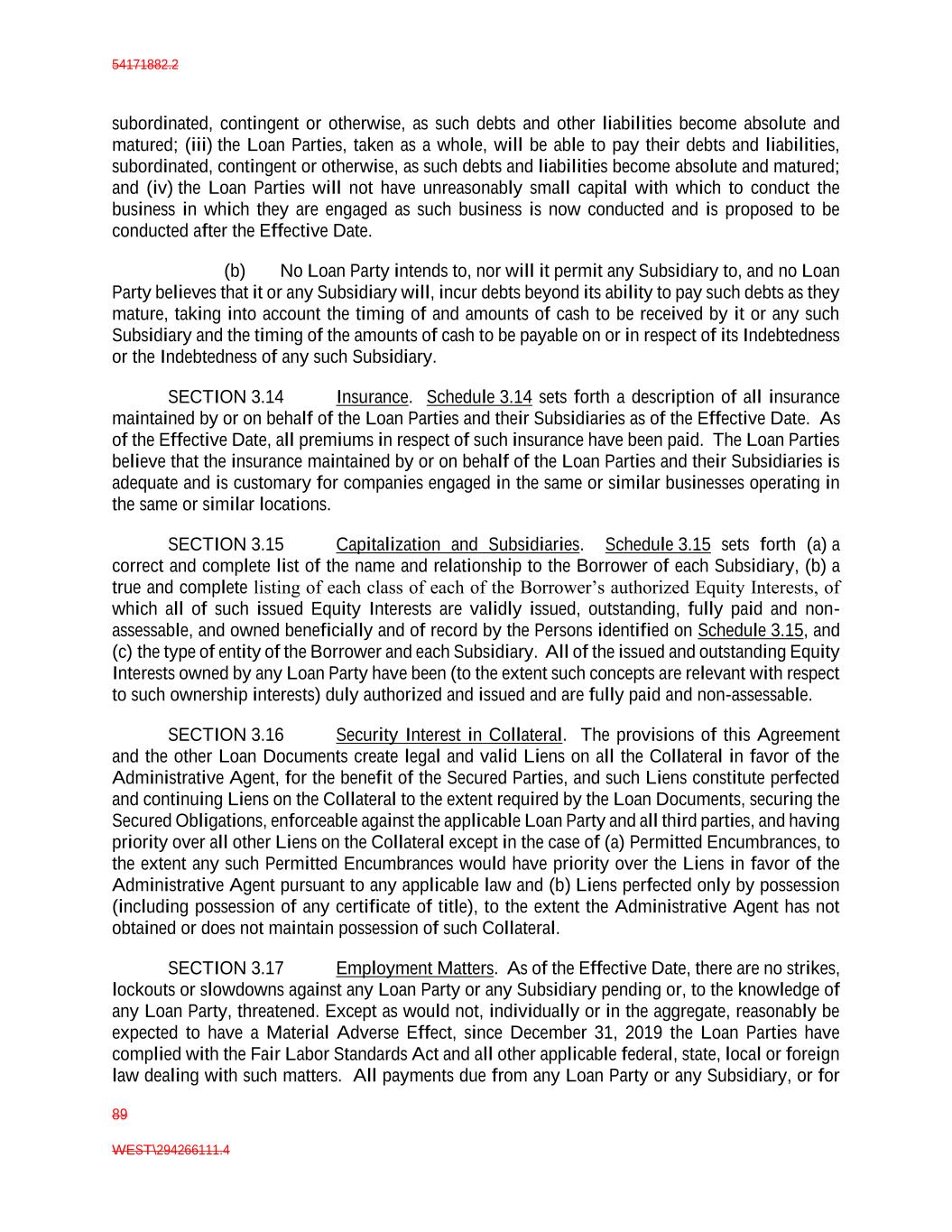 54171882.2 89 WEST\294266111.4 subordinated, contingent or otherwise, as such debts and other liabilities become absolute and matured; (iii) the Loan Parties, taken as a whole, will be able to pay their debts and liabilities, subordinated, contingent or otherwise, as such debts and liabilities become absolute and matured; and (iv) the Loan Parties will not have unreasonably small capital with which to conduct the business in which they are engaged as such business is now conducted and is proposed to be conducted after the Effective Date. (b) No Loan Party intends to, nor will it permit any Subsidiary to, and no Loan Party believes that it or any Subsidiary will, incur debts beyond its ability to pay such debts as they mature, taking into account the timing of and amounts of cash to be received by it or any such Subsidiary and the timing of the amounts of cash to be payable on or in respect of its Indebtedness or the Indebtedness of any such Subsidiary. SECTION 3.14 Insurance. Schedule 3.14 sets forth a description of all insurance maintained by or on behalf of the Loan Parties and their Subsidiaries as of the Effective Date. As of the Effective Date, all premiums in respect of such insurance have been paid. The Loan Parties believe that the insurance maintained by or on behalf of the Loan Parties and their Subsidiaries is adequate and is customary for companies engaged in the same or similar businesses operating in the same or similar locations. SECTION 3.15 Capitalization and Subsidiaries. Schedule 3.15 sets forth (a) a correct and complete list of the name and relationship to the Borrower of each Subsidiary, (b) a true and complete listing of each class of each of the Borrower’s authorized Equity Interests, of which all of such issued Equity Interests are validly issued, outstanding, fully paid and non- assessable, and owned beneficially and of record by the Persons identified on Schedule 3.15, and (c) the type of entity of the Borrower and each Subsidiary. All of the issued and outstanding Equity Interests owned by any Loan Party have been (to the extent such concepts are relevant with respect to such ownership interests) duly authorized and issued and are fully paid and non-assessable. SECTION 3.16 Security Interest in Collateral. The provisions of this Agreement and the other Loan Documents create legal and valid Liens on all the Collateral in favor of the Administrative Agent, for the benefit of the Secured Parties, and such Liens constitute perfected and continuing Liens on the Collateral to the extent required by the Loan Documents, securing the Secured Obligations, enforceable against the applicable Loan Party and all third parties, and having priority over all other Liens on the Collateral except in the case of (a) Permitted Encumbrances, to the extent any such Permitted Encumbrances would have priority over the Liens in favor of the Administrative Agent pursuant to any applicable law and (b) Liens perfected only by possession (including possession of any certificate of title), to the extent the Administrative Agent has not obtained or does not maintain possession of such Collateral. SECTION 3.17 Employment Matters. As of the Effective Date, there are no strikes, lockouts or slowdowns against any Loan Party or any Subsidiary pending or, to the knowledge of any Loan Party, threatened. Except as would not, individually or in the aggregate, reasonably be expected to have a Material Adverse Effect, since December 31, 2019 the Loan Parties have complied with the Fair Labor Standards Act and all other applicable federal, state, local or foreign law dealing with such matters. All payments due from any Loan Party or any Subsidiary, or for