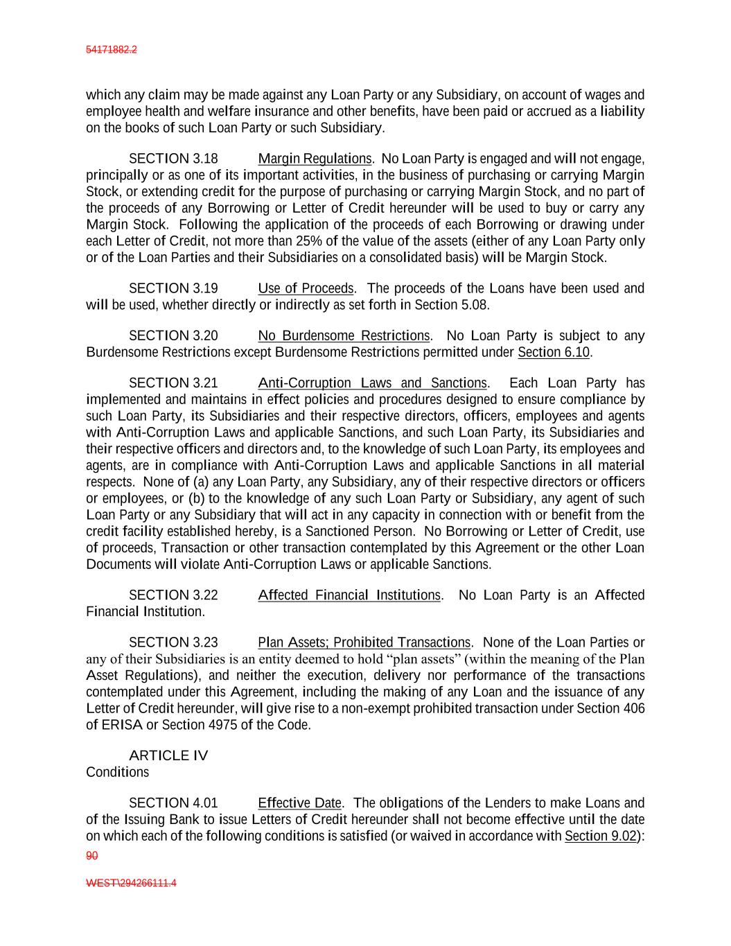 54171882.2 90 WEST\294266111.4 which any claim may be made against any Loan Party or any Subsidiary, on account of wages and employee health and welfare insurance and other benefits, have been paid or accrued as a liability on the books of such Loan Party or such Subsidiary. SECTION 3.18 Margin Regulations. No Loan Party is engaged and will not engage, principally or as one of its important activities, in the business of purchasing or carrying Margin Stock, or extending credit for the purpose of purchasing or carrying Margin Stock, and no part of the proceeds of any Borrowing or Letter of Credit hereunder will be used to buy or carry any Margin Stock. Following the application of the proceeds of each Borrowing or drawing under each Letter of Credit, not more than 25% of the value of the assets (either of any Loan Party only or of the Loan Parties and their Subsidiaries on a consolidated basis) will be Margin Stock. SECTION 3.19 Use of Proceeds. The proceeds of the Loans have been used and will be used, whether directly or indirectly as set forth in Section 5.08. SECTION 3.20 No Burdensome Restrictions. No Loan Party is subject to any Burdensome Restrictions except Burdensome Restrictions permitted under Section 6.10. SECTION 3.21 Anti-Corruption Laws and Sanctions. Each Loan Party has implemented and maintains in effect policies and procedures designed to ensure compliance by such Loan Party, its Subsidiaries and their respective directors, officers, employees and agents with Anti-Corruption Laws and applicable Sanctions, and such Loan Party, its Subsidiaries and their respective officers and directors and, to the knowledge of such Loan Party, its employees and agents, are in compliance with Anti-Corruption Laws and applicable Sanctions in all material respects. None of (a) any Loan Party, any Subsidiary, any of their respective directors or officers or employees, or (b) to the knowledge of any such Loan Party or Subsidiary, any agent of such Loan Party or any Subsidiary that will act in any capacity in connection with or benefit from the credit facility established hereby, is a Sanctioned Person. No Borrowing or Letter of Credit, use of proceeds, Transaction or other transaction contemplated by this Agreement or the other Loan Documents will violate Anti-Corruption Laws or applicable Sanctions. SECTION 3.22 Affected Financial Institutions. No Loan Party is an Affected Financial Institution. SECTION 3.23 Plan Assets; Prohibited Transactions. None of the Loan Parties or any of their Subsidiaries is an entity deemed to hold “plan assets” (within the meaning of the Plan Asset Regulations), and neither the execution, delivery nor performance of the transactions contemplated under this Agreement, including the making of any Loan and the issuance of any Letter of Credit hereunder, will give rise to a non-exempt prohibited transaction under Section 406 of ERISA or Section 4975 of the Code. ARTICLE IV Conditions SECTION 4.01 Effective Date. The obligations of the Lenders to make Loans and of the Issuing Bank to issue Letters of Credit hereunder shall not become effective until the date on which each of the following conditions is satisfied (or waived in accordance with Section 9.02):