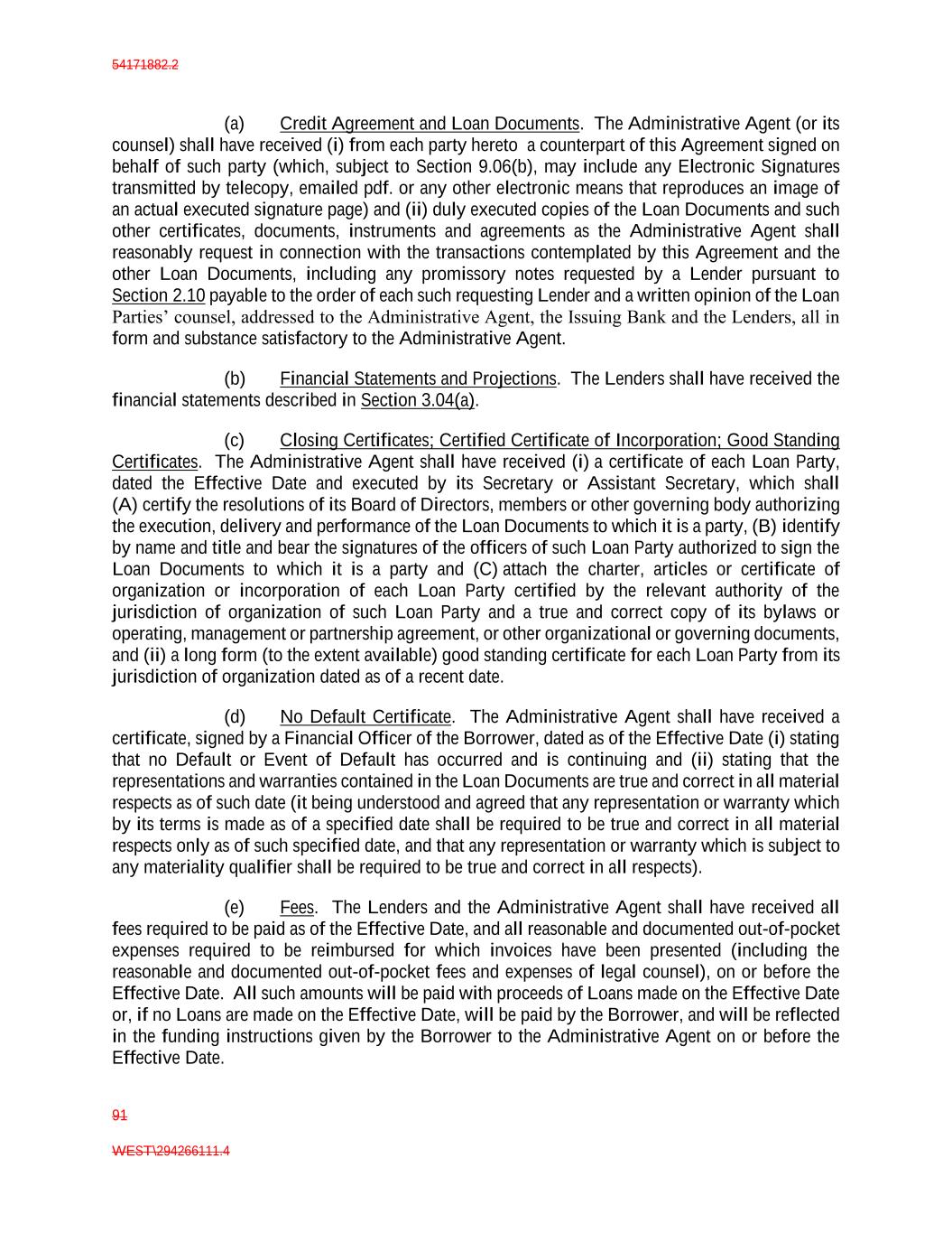 54171882.2 91 WEST\294266111.4 (a) Credit Agreement and Loan Documents. The Administrative Agent (or its counsel) shall have received (i) from each party hereto a counterpart of this Agreement signed on behalf of such party (which, subject to Section 9.06(b), may include any Electronic Signatures transmitted by telecopy, emailed pdf. or any other electronic means that reproduces an image of an actual executed signature page) and (ii) duly executed copies of the Loan Documents and such other certificates, documents, instruments and agreements as the Administrative Agent shall reasonably request in connection with the transactions contemplated by this Agreement and the other Loan Documents, including any promissory notes requested by a Lender pursuant to Section 2.10 payable to the order of each such requesting Lender and a written opinion of the Loan Parties’ counsel, addressed to the Administrative Agent, the Issuing Bank and the Lenders, all in form and substance satisfactory to the Administrative Agent. (b) Financial Statements and Projections. The Lenders shall have received the financial statements described in Section 3.04(a). (c) Closing Certificates; Certified Certificate of Incorporation; Good Standing Certificates. The Administrative Agent shall have received (i) a certificate of each Loan Party, dated the Effective Date and executed by its Secretary or Assistant Secretary, which shall (A) certify the resolutions of its Board of Directors, members or other governing body authorizing the execution, delivery and performance of the Loan Documents to which it is a party, (B) identify by name and title and bear the signatures of the officers of such Loan Party authorized to sign the Loan Documents to which it is a party and (C) attach the charter, articles or certificate of organization or incorporation of each Loan Party certified by the relevant authority of the jurisdiction of organization of such Loan Party and a true and correct copy of its bylaws or operating, management or partnership agreement, or other organizational or governing documents, and (ii) a long form (to the extent available) good standing certificate for each Loan Party from its jurisdiction of organization dated as of a recent date. (d) No Default Certificate. The Administrative Agent shall have received a certificate, signed by a Financial Officer of the Borrower, dated as of the Effective Date (i) stating that no Default or Event of Default has occurred and is continuing and (ii) stating that the representations and warranties contained in the Loan Documents are true and correct in all material respects as of such date (it being understood and agreed that any representation or warranty which by its terms is made as of a specified date shall be required to be true and correct in all material respects only as of such specified date, and that any representation or warranty which is subject to any materiality qualifier shall be required to be true and correct in all respects). (e) Fees. The Lenders and the Administrative Agent shall have received all fees required to be paid as of the Effective Date, and all reasonable and documented out-of-pocket expenses required to be reimbursed for which invoices have been presented (including the reasonable and documented out-of-pocket fees and expenses of legal counsel), on or before the Effective Date. All such amounts will be paid with proceeds of Loans made on the Effective Date or, if no Loans are made on the Effective Date, will be paid by the Borrower, and will be reflected in the funding instructions given by the Borrower to the Administrative Agent on or before the Effective Date.