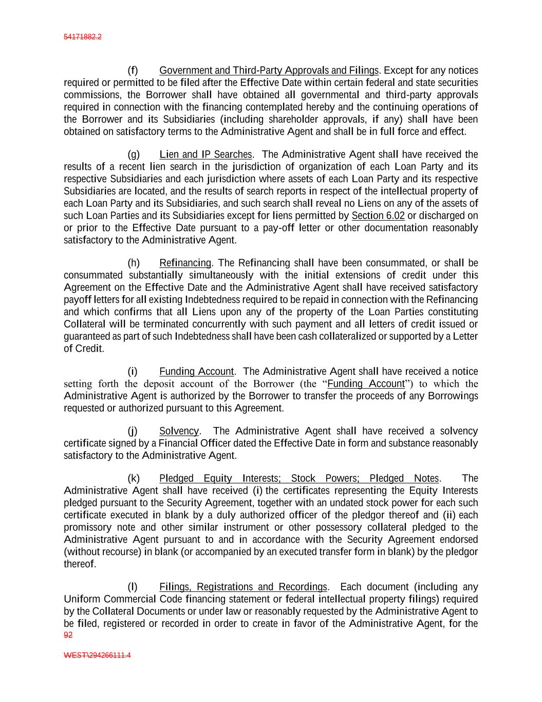 54171882.2 92 WEST\294266111.4 (f) Government and Third-Party Approvals and Filings. Except for any notices required or permitted to be filed after the Effective Date within certain federal and state securities commissions, the Borrower shall have obtained all governmental and third-party approvals required in connection with the financing contemplated hereby and the continuing operations of the Borrower and its Subsidiaries (including shareholder approvals, if any) shall have been obtained on satisfactory terms to the Administrative Agent and shall be in full force and effect. (g) Lien and IP Searches. The Administrative Agent shall have received the results of a recent lien search in the jurisdiction of organization of each Loan Party and its respective Subsidiaries and each jurisdiction where assets of each Loan Party and its respective Subsidiaries are located, and the results of search reports in respect of the intellectual property of each Loan Party and its Subsidiaries, and such search shall reveal no Liens on any of the assets of such Loan Parties and its Subsidiaries except for liens permitted by Section 6.02 or discharged on or prior to the Effective Date pursuant to a pay-off letter or other documentation reasonably satisfactory to the Administrative Agent. (h) Refinancing. The Refinancing shall have been consummated, or shall be consummated substantially simultaneously with the initial extensions of credit under this Agreement on the Effective Date and the Administrative Agent shall have received satisfactory payoff letters for all existing Indebtedness required to be repaid in connection with the Refinancing and which confirms that all Liens upon any of the property of the Loan Parties constituting Collateral will be terminated concurrently with such payment and all letters of credit issued or guaranteed as part of such Indebtedness shall have been cash collateralized or supported by a Letter of Credit. (i) Funding Account. The Administrative Agent shall have received a notice setting forth the deposit account of the Borrower (the “Funding Account”) to which the Administrative Agent is authorized by the Borrower to transfer the proceeds of any Borrowings requested or authorized pursuant to this Agreement. (j) Solvency. The Administrative Agent shall have received a solvency certificate signed by a Financial Officer dated the Effective Date in form and substance reasonably satisfactory to the Administrative Agent. (k) Pledged Equity Interests; Stock Powers; Pledged Notes. The Administrative Agent shall have received (i) the certificates representing the Equity Interests pledged pursuant to the Security Agreement, together with an undated stock power for each such certificate executed in blank by a duly authorized officer of the pledgor thereof and (ii) each promissory note and other similar instrument or other possessory collateral pledged to the Administrative Agent pursuant to and in accordance with the Security Agreement endorsed (without recourse) in blank (or accompanied by an executed transfer form in blank) by the pledgor thereof. (l) Filings, Registrations and Recordings. Each document (including any Uniform Commercial Code financing statement or federal intellectual property filings) required by the Collateral Documents or under law or reasonably requested by the Administrative Agent to be filed, registered or recorded in order to create in favor of the Administrative Agent, for the
