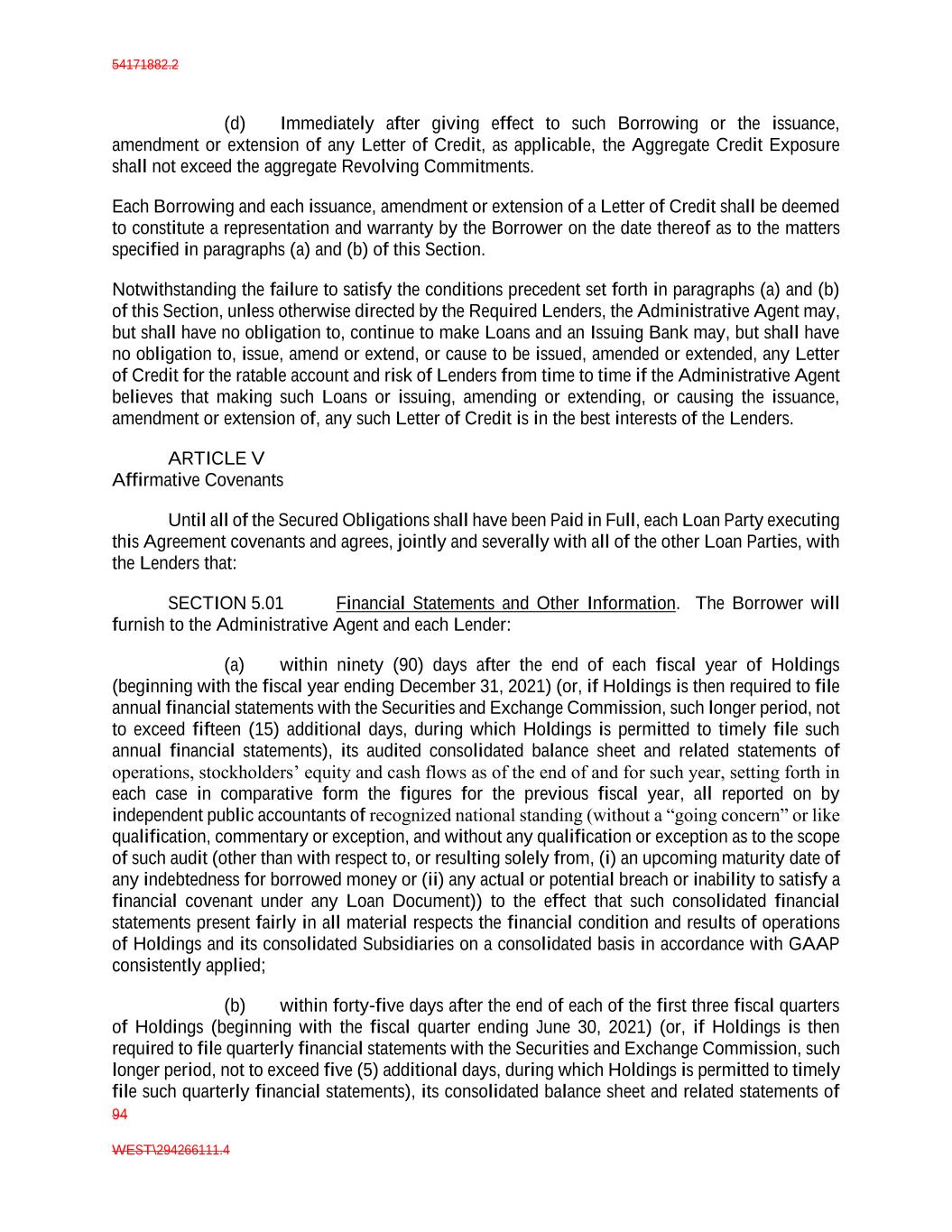 54171882.2 94 WEST\294266111.4 (d) Immediately after giving effect to such Borrowing or the issuance, amendment or extension of any Letter of Credit, as applicable, the Aggregate Credit Exposure shall not exceed the aggregate Revolving Commitments. Each Borrowing and each issuance, amendment or extension of a Letter of Credit shall be deemed to constitute a representation and warranty by the Borrower on the date thereof as to the matters specified in paragraphs (a) and (b) of this Section. Notwithstanding the failure to satisfy the conditions precedent set forth in paragraphs (a) and (b) of this Section, unless otherwise directed by the Required Lenders, the Administrative Agent may, but shall have no obligation to, continue to make Loans and an Issuing Bank may, but shall have no obligation to, issue, amend or extend, or cause to be issued, amended or extended, any Letter of Credit for the ratable account and risk of Lenders from time to time if the Administrative Agent believes that making such Loans or issuing, amending or extending, or causing the issuance, amendment or extension of, any such Letter of Credit is in the best interests of the Lenders. ARTICLE V Affirmative Covenants Until all of the Secured Obligations shall have been Paid in Full, each Loan Party executing this Agreement covenants and agrees, jointly and severally with all of the other Loan Parties, with the Lenders that: SECTION 5.01 Financial Statements and Other Information. The Borrower will furnish to the Administrative Agent and each Lender: (a) within ninety (90) days after the end of each fiscal year of Holdings (beginning with the fiscal year ending December 31, 2021) (or, if Holdings is then required to file annual financial statements with the Securities and Exchange Commission, such longer period, not to exceed fifteen (15) additional days, during which Holdings is permitted to timely file such annual financial statements), its audited consolidated balance sheet and related statements of operations, stockholders’ equity and cash flows as of the end of and for such year, setting forth in each case in comparative form the figures for the previous fiscal year, all reported on by independent public accountants of recognized national standing (without a “going concern” or like qualification, commentary or exception, and without any qualification or exception as to the scope of such audit (other than with respect to, or resulting solely from, (i) an upcoming maturity date of any indebtedness for borrowed money or (ii) any actual or potential breach or inability to satisfy a financial covenant under any Loan Document)) to the effect that such consolidated financial statements present fairly in all material respects the financial condition and results of operations of Holdings and its consolidated Subsidiaries on a consolidated basis in accordance with GAAP consistently applied; (b) within forty-five days after the end of each of the first three fiscal quarters of Holdings (beginning with the fiscal quarter ending June 30, 2021) (or, if Holdings is then required to file quarterly financial statements with the Securities and Exchange Commission, such longer period, not to exceed five (5) additional days, during which Holdings is permitted to timely file such quarterly financial statements), its consolidated balance sheet and related statements of