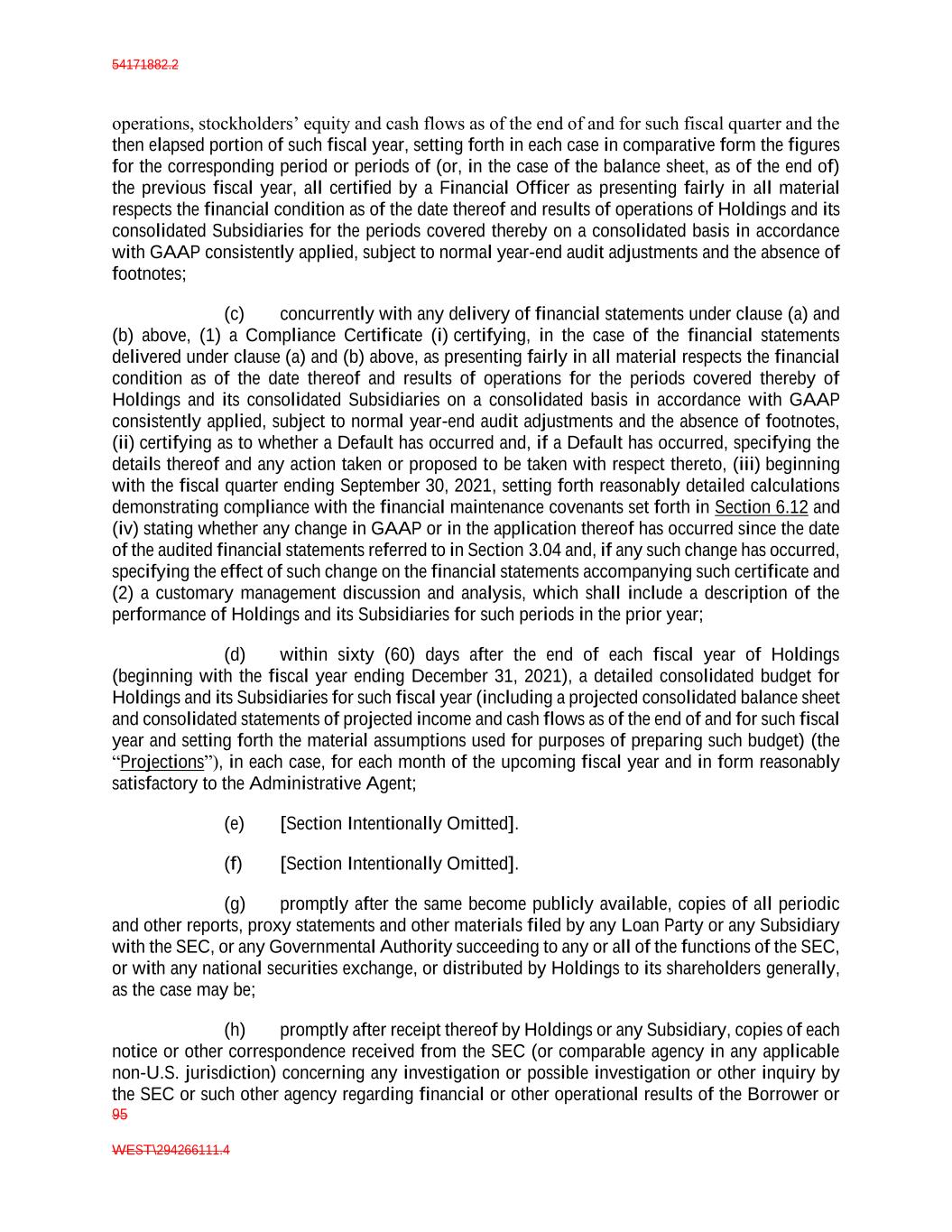 54171882.2 95 WEST\294266111.4 operations, stockholders’ equity and cash flows as of the end of and for such fiscal quarter and the then elapsed portion of such fiscal year, setting forth in each case in comparative form the figures for the corresponding period or periods of (or, in the case of the balance sheet, as of the end of) the previous fiscal year, all certified by a Financial Officer as presenting fairly in all material respects the financial condition as of the date thereof and results of operations of Holdings and its consolidated Subsidiaries for the periods covered thereby on a consolidated basis in accordance with GAAP consistently applied, subject to normal year-end audit adjustments and the absence of footnotes; (c) concurrently with any delivery of financial statements under clause (a) and (b) above, (1) a Compliance Certificate (i) certifying, in the case of the financial statements delivered under clause (a) and (b) above, as presenting fairly in all material respects the financial condition as of the date thereof and results of operations for the periods covered thereby of Holdings and its consolidated Subsidiaries on a consolidated basis in accordance with GAAP consistently applied, subject to normal year-end audit adjustments and the absence of footnotes, (ii) certifying as to whether a Default has occurred and, if a Default has occurred, specifying the details thereof and any action taken or proposed to be taken with respect thereto, (iii) beginning with the fiscal quarter ending September 30, 2021, setting forth reasonably detailed calculations demonstrating compliance with the financial maintenance covenants set forth in Section 6.12 and (iv) stating whether any change in GAAP or in the application thereof has occurred since the date of the audited financial statements referred to in Section 3.04 and, if any such change has occurred, specifying the effect of such change on the financial statements accompanying such certificate and (2) a customary management discussion and analysis, which shall include a description of the performance of Holdings and its Subsidiaries for such periods in the prior year; (d) within sixty (60) days after the end of each fiscal year of Holdings (beginning with the fiscal year ending December 31, 2021), a detailed consolidated budget for Holdings and its Subsidiaries for such fiscal year (including a projected consolidated balance sheet and consolidated statements of projected income and cash flows as of the end of and for such fiscal year and setting forth the material assumptions used for purposes of preparing such budget) (the “Projections”), in each case, for each month of the upcoming fiscal year and in form reasonably satisfactory to the Administrative Agent; (e) [Section Intentionally Omitted]. (f) [Section Intentionally Omitted]. (g) promptly after the same become publicly available, copies of all periodic and other reports, proxy statements and other materials filed by any Loan Party or any Subsidiary with the SEC, or any Governmental Authority succeeding to any or all of the functions of the SEC, or with any national securities exchange, or distributed by Holdings to its shareholders generally, as the case may be; (h) promptly after receipt thereof by Holdings or any Subsidiary, copies of each notice or other correspondence received from the SEC (or comparable agency in any applicable non-U.S. jurisdiction) concerning any investigation or possible investigation or other inquiry by the SEC or such other agency regarding financial or other operational results of the Borrower or