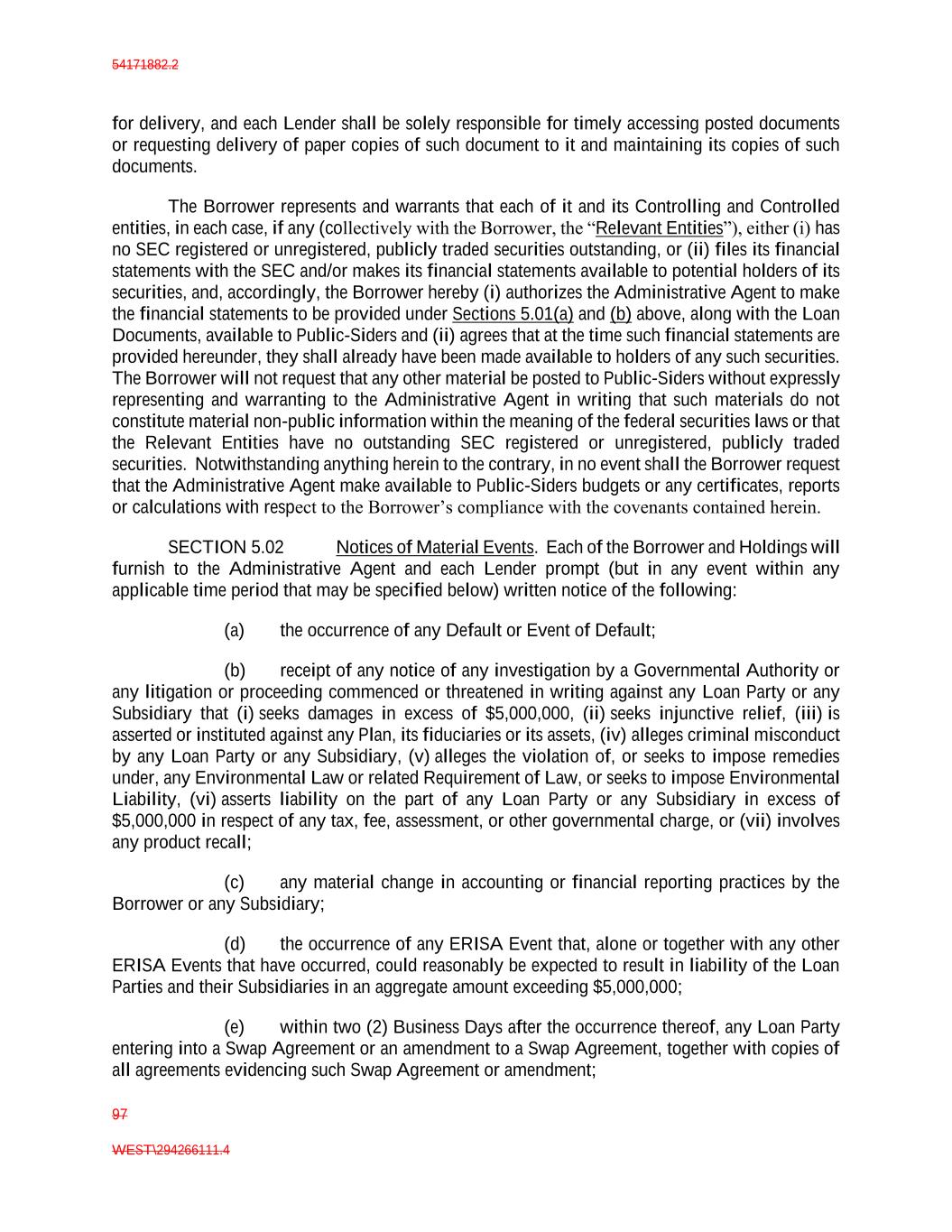 54171882.2 97 WEST\294266111.4 for delivery, and each Lender shall be solely responsible for timely accessing posted documents or requesting delivery of paper copies of such document to it and maintaining its copies of such documents. The Borrower represents and warrants that each of it and its Controlling and Controlled entities, in each case, if any (collectively with the Borrower, the “Relevant Entities”), either (i) has no SEC registered or unregistered, publicly traded securities outstanding, or (ii) files its financial statements with the SEC and/or makes its financial statements available to potential holders of its securities, and, accordingly, the Borrower hereby (i) authorizes the Administrative Agent to make the financial statements to be provided under Sections 5.01(a) and (b) above, along with the Loan Documents, available to Public-Siders and (ii) agrees that at the time such financial statements are provided hereunder, they shall already have been made available to holders of any such securities. The Borrower will not request that any other material be posted to Public-Siders without expressly representing and warranting to the Administrative Agent in writing that such materials do not constitute material non-public information within the meaning of the federal securities laws or that the Relevant Entities have no outstanding SEC registered or unregistered, publicly traded securities. Notwithstanding anything herein to the contrary, in no event shall the Borrower request that the Administrative Agent make available to Public-Siders budgets or any certificates, reports or calculations with respect to the Borrower’s compliance with the covenants contained herein. SECTION 5.02 Notices of Material Events. Each of the Borrower and Holdings will furnish to the Administrative Agent and each Lender prompt (but in any event within any applicable time period that may be specified below) written notice of the following: (a) the occurrence of any Default or Event of Default; (b) receipt of any notice of any investigation by a Governmental Authority or any litigation or proceeding commenced or threatened in writing against any Loan Party or any Subsidiary that (i) seeks damages in excess of $5,000,000, (ii) seeks injunctive relief, (iii) is asserted or instituted against any Plan, its fiduciaries or its assets, (iv) alleges criminal misconduct by any Loan Party or any Subsidiary, (v) alleges the violation of, or seeks to impose remedies under, any Environmental Law or related Requirement of Law, or seeks to impose Environmental Liability, (vi) asserts liability on the part of any Loan Party or any Subsidiary in excess of $5,000,000 in respect of any tax, fee, assessment, or other governmental charge, or (vii) involves any product recall; (c) any material change in accounting or financial reporting practices by the Borrower or any Subsidiary; (d) the occurrence of any ERISA Event that, alone or together with any other ERISA Events that have occurred, could reasonably be expected to result in liability of the Loan Parties and their Subsidiaries in an aggregate amount exceeding $5,000,000; (e) within two (2) Business Days after the occurrence thereof, any Loan Party entering into a Swap Agreement or an amendment to a Swap Agreement, together with copies of all agreements evidencing such Swap Agreement or amendment;
