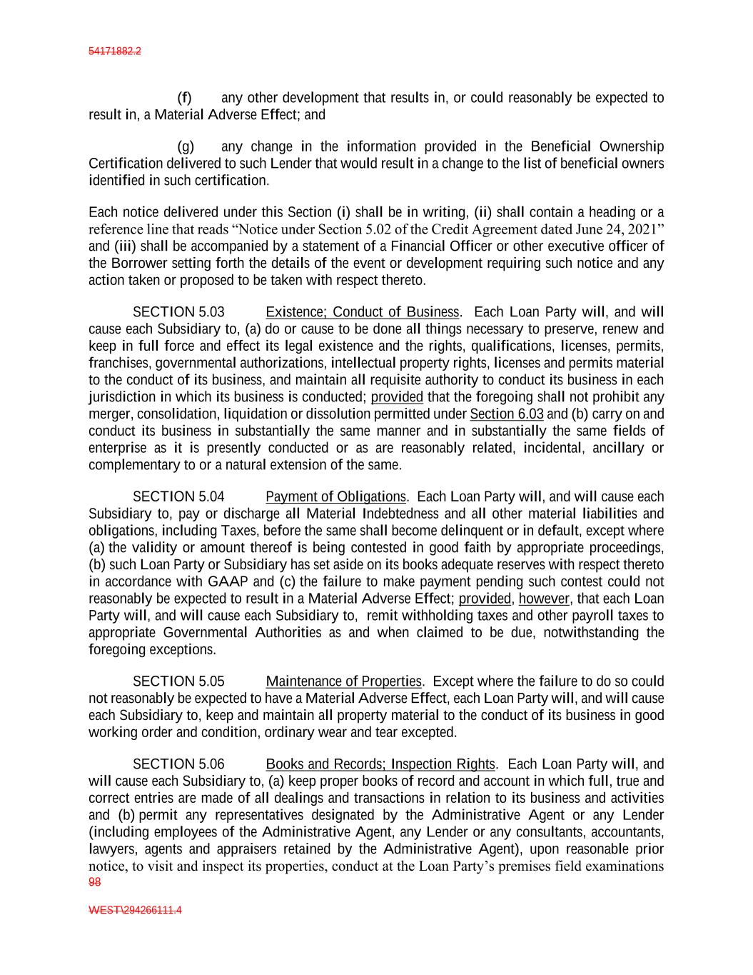 54171882.2 98 WEST\294266111.4 (f) any other development that results in, or could reasonably be expected to result in, a Material Adverse Effect; and (g) any change in the information provided in the Beneficial Ownership Certification delivered to such Lender that would result in a change to the list of beneficial owners identified in such certification. Each notice delivered under this Section (i) shall be in writing, (ii) shall contain a heading or a reference line that reads “Notice under Section 5.02 of the Credit Agreement dated June 24, 2021” and (iii) shall be accompanied by a statement of a Financial Officer or other executive officer of the Borrower setting forth the details of the event or development requiring such notice and any action taken or proposed to be taken with respect thereto. SECTION 5.03 Existence; Conduct of Business. Each Loan Party will, and will cause each Subsidiary to, (a) do or cause to be done all things necessary to preserve, renew and keep in full force and effect its legal existence and the rights, qualifications, licenses, permits, franchises, governmental authorizations, intellectual property rights, licenses and permits material to the conduct of its business, and maintain all requisite authority to conduct its business in each jurisdiction in which its business is conducted; provided that the foregoing shall not prohibit any merger, consolidation, liquidation or dissolution permitted under Section 6.03 and (b) carry on and conduct its business in substantially the same manner and in substantially the same fields of enterprise as it is presently conducted or as are reasonably related, incidental, ancillary or complementary to or a natural extension of the same. SECTION 5.04 Payment of Obligations. Each Loan Party will, and will cause each Subsidiary to, pay or discharge all Material Indebtedness and all other material liabilities and obligations, including Taxes, before the same shall become delinquent or in default, except where (a) the validity or amount thereof is being contested in good faith by appropriate proceedings, (b) such Loan Party or Subsidiary has set aside on its books adequate reserves with respect thereto in accordance with GAAP and (c) the failure to make payment pending such contest could not reasonably be expected to result in a Material Adverse Effect; provided, however, that each Loan Party will, and will cause each Subsidiary to, remit withholding taxes and other payroll taxes to appropriate Governmental Authorities as and when claimed to be due, notwithstanding the foregoing exceptions. SECTION 5.05 Maintenance of Properties. Except where the failure to do so could not reasonably be expected to have a Material Adverse Effect, each Loan Party will, and will cause each Subsidiary to, keep and maintain all property material to the conduct of its business in good working order and condition, ordinary wear and tear excepted. SECTION 5.06 Books and Records; Inspection Rights. Each Loan Party will, and will cause each Subsidiary to, (a) keep proper books of record and account in which full, true and correct entries are made of all dealings and transactions in relation to its business and activities and (b) permit any representatives designated by the Administrative Agent or any Lender (including employees of the Administrative Agent, any Lender or any consultants, accountants, lawyers, agents and appraisers retained by the Administrative Agent), upon reasonable prior notice, to visit and inspect its properties, conduct at the Loan Party’s premises field examinations