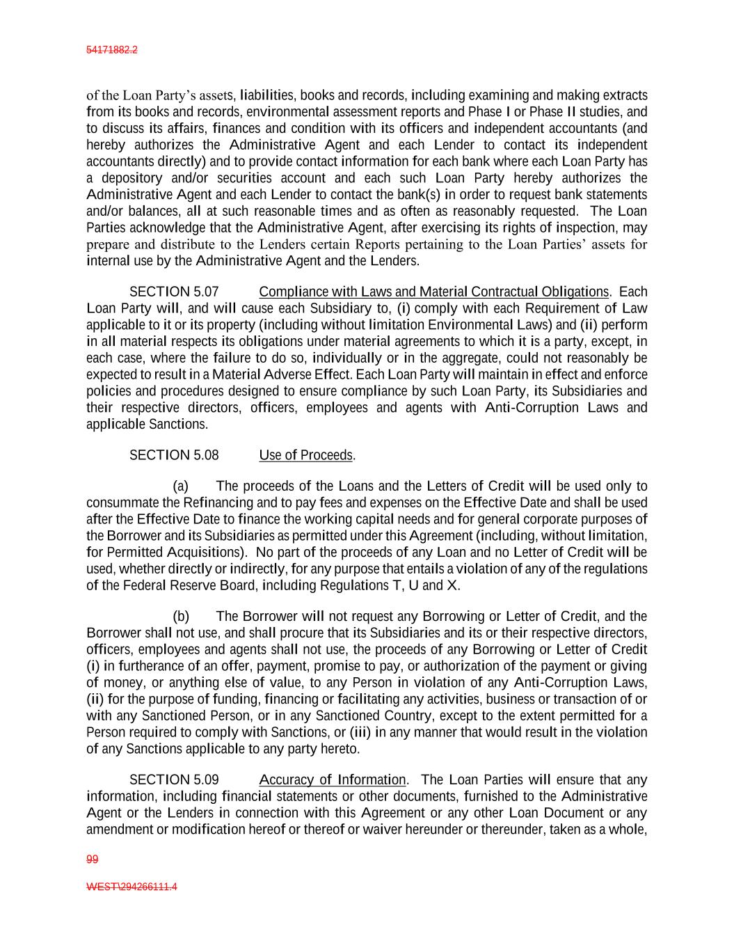 54171882.2 99 WEST\294266111.4 of the Loan Party’s assets, liabilities, books and records, including examining and making extracts from its books and records, environmental assessment reports and Phase I or Phase II studies, and to discuss its affairs, finances and condition with its officers and independent accountants (and hereby authorizes the Administrative Agent and each Lender to contact its independent accountants directly) and to provide contact information for each bank where each Loan Party has a depository and/or securities account and each such Loan Party hereby authorizes the Administrative Agent and each Lender to contact the bank(s) in order to request bank statements and/or balances, all at such reasonable times and as often as reasonably requested. The Loan Parties acknowledge that the Administrative Agent, after exercising its rights of inspection, may prepare and distribute to the Lenders certain Reports pertaining to the Loan Parties’ assets for internal use by the Administrative Agent and the Lenders. SECTION 5.07 Compliance with Laws and Material Contractual Obligations. Each Loan Party will, and will cause each Subsidiary to, (i) comply with each Requirement of Law applicable to it or its property (including without limitation Environmental Laws) and (ii) perform in all material respects its obligations under material agreements to which it is a party, except, in each case, where the failure to do so, individually or in the aggregate, could not reasonably be expected to result in a Material Adverse Effect. Each Loan Party will maintain in effect and enforce policies and procedures designed to ensure compliance by such Loan Party, its Subsidiaries and their respective directors, officers, employees and agents with Anti-Corruption Laws and applicable Sanctions. SECTION 5.08 Use of Proceeds. (a) The proceeds of the Loans and the Letters of Credit will be used only to consummate the Refinancing and to pay fees and expenses on the Effective Date and shall be used after the Effective Date to finance the working capital needs and for general corporate purposes of the Borrower and its Subsidiaries as permitted under this Agreement (including, without limitation, for Permitted Acquisitions). No part of the proceeds of any Loan and no Letter of Credit will be used, whether directly or indirectly, for any purpose that entails a violation of any of the regulations of the Federal Reserve Board, including Regulations T, U and X. (b) The Borrower will not request any Borrowing or Letter of Credit, and the Borrower shall not use, and shall procure that its Subsidiaries and its or their respective directors, officers, employees and agents shall not use, the proceeds of any Borrowing or Letter of Credit (i) in furtherance of an offer, payment, promise to pay, or authorization of the payment or giving of money, or anything else of value, to any Person in violation of any Anti-Corruption Laws, (ii) for the purpose of funding, financing or facilitating any activities, business or transaction of or with any Sanctioned Person, or in any Sanctioned Country, except to the extent permitted for a Person required to comply with Sanctions, or (iii) in any manner that would result in the violation of any Sanctions applicable to any party hereto. SECTION 5.09 Accuracy of Information. The Loan Parties will ensure that any information, including financial statements or other documents, furnished to the Administrative Agent or the Lenders in connection with this Agreement or any other Loan Document or any amendment or modification hereof or thereof or waiver hereunder or thereunder, taken as a whole,