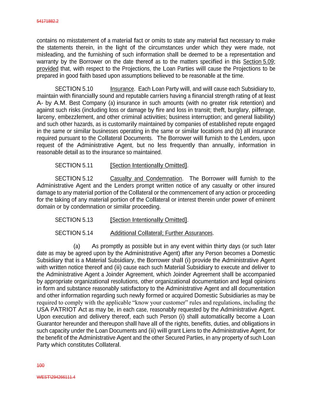 54171882.2 100 WEST\294266111.4 contains no misstatement of a material fact or omits to state any material fact necessary to make the statements therein, in the light of the circumstances under which they were made, not misleading, and the furnishing of such information shall be deemed to be a representation and warranty by the Borrower on the date thereof as to the matters specified in this Section 5.09; provided that, with respect to the Projections, the Loan Parties will cause the Projections to be prepared in good faith based upon assumptions believed to be reasonable at the time. SECTION 5.10 Insurance. Each Loan Party will, and will cause each Subsidiary to, maintain with financially sound and reputable carriers having a financial strength rating of at least A- by A.M. Best Company (a) insurance in such amounts (with no greater risk retention) and against such risks (including loss or damage by fire and loss in transit; theft, burglary, pilferage, larceny, embezzlement, and other criminal activities; business interruption; and general liability) and such other hazards, as is customarily maintained by companies of established repute engaged in the same or similar businesses operating in the same or similar locations and (b) all insurance required pursuant to the Collateral Documents. The Borrower will furnish to the Lenders, upon request of the Administrative Agent, but no less frequently than annually, information in reasonable detail as to the insurance so maintained. SECTION 5.11 [Section Intentionally Omitted]. SECTION 5.12 Casualty and Condemnation. The Borrower will furnish to the Administrative Agent and the Lenders prompt written notice of any casualty or other insured damage to any material portion of the Collateral or the commencement of any action or proceeding for the taking of any material portion of the Collateral or interest therein under power of eminent domain or by condemnation or similar proceeding. SECTION 5.13 [Section Intentionally Omitted]. SECTION 5.14 Additional Collateral; Further Assurances. (a) As promptly as possible but in any event within thirty days (or such later date as may be agreed upon by the Administrative Agent) after any Person becomes a Domestic Subsidiary that is a Material Subsidiary, the Borrower shall (i) provide the Administrative Agent with written notice thereof and (ii) cause each such Material Subsidiary to execute and deliver to the Administrative Agent a Joinder Agreement, which Joinder Agreement shall be accompanied by appropriate organizational resolutions, other organizational documentation and legal opinions in form and substance reasonably satisfactory to the Administrative Agent and all documentation and other information regarding such newly formed or acquired Domestic Subsidiaries as may be required to comply with the applicable “know your customer” rules and regulations, including the USA PATRIOT Act as may be, in each case, reasonably requested by the Administrative Agent. Upon execution and delivery thereof, each such Person (i) shall automatically become a Loan Guarantor hereunder and thereupon shall have all of the rights, benefits, duties, and obligations in such capacity under the Loan Documents and (ii) will grant Liens to the Administrative Agent, for the benefit of the Administrative Agent and the other Secured Parties, in any property of such Loan Party which constitutes Collateral.
