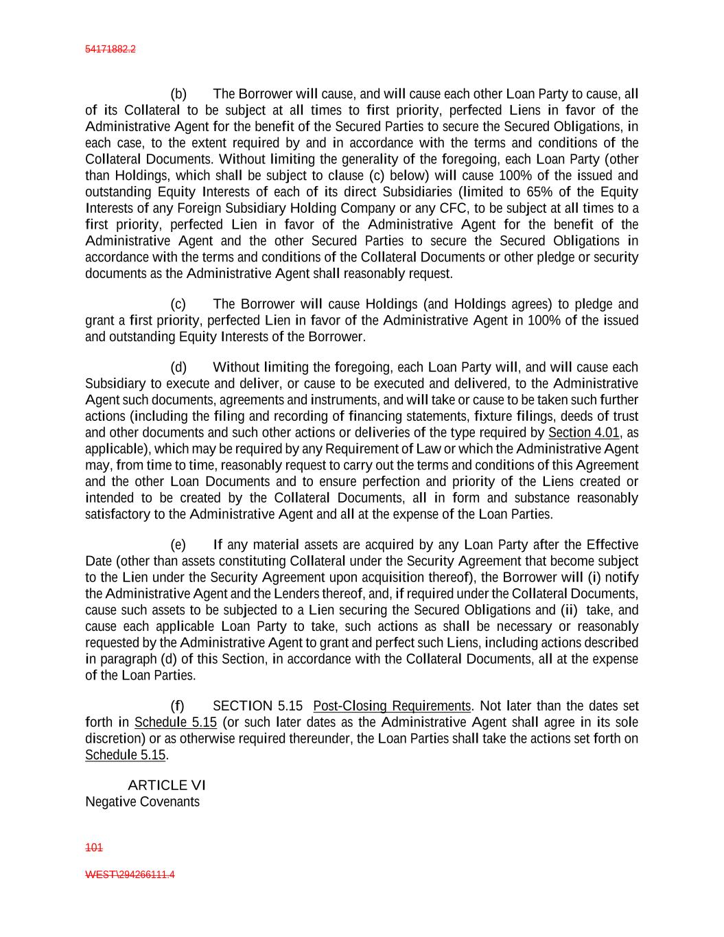 54171882.2 101 WEST\294266111.4 (b) The Borrower will cause, and will cause each other Loan Party to cause, all of its Collateral to be subject at all times to first priority, perfected Liens in favor of the Administrative Agent for the benefit of the Secured Parties to secure the Secured Obligations, in each case, to the extent required by and in accordance with the terms and conditions of the Collateral Documents. Without limiting the generality of the foregoing, each Loan Party (other than Holdings, which shall be subject to clause (c) below) will cause 100% of the issued and outstanding Equity Interests of each of its direct Subsidiaries (limited to 65% of the Equity Interests of any Foreign Subsidiary Holding Company or any CFC, to be subject at all times to a first priority, perfected Lien in favor of the Administrative Agent for the benefit of the Administrative Agent and the other Secured Parties to secure the Secured Obligations in accordance with the terms and conditions of the Collateral Documents or other pledge or security documents as the Administrative Agent shall reasonably request. (c) The Borrower will cause Holdings (and Holdings agrees) to pledge and grant a first priority, perfected Lien in favor of the Administrative Agent in 100% of the issued and outstanding Equity Interests of the Borrower. (d) Without limiting the foregoing, each Loan Party will, and will cause each Subsidiary to execute and deliver, or cause to be executed and delivered, to the Administrative Agent such documents, agreements and instruments, and will take or cause to be taken such further actions (including the filing and recording of financing statements, fixture filings, deeds of trust and other documents and such other actions or deliveries of the type required by Section 4.01, as applicable), which may be required by any Requirement of Law or which the Administrative Agent may, from time to time, reasonably request to carry out the terms and conditions of this Agreement and the other Loan Documents and to ensure perfection and priority of the Liens created or intended to be created by the Collateral Documents, all in form and substance reasonably satisfactory to the Administrative Agent and all at the expense of the Loan Parties. (e) If any material assets are acquired by any Loan Party after the Effective Date (other than assets constituting Collateral under the Security Agreement that become subject to the Lien under the Security Agreement upon acquisition thereof), the Borrower will (i) notify the Administrative Agent and the Lenders thereof, and, if required under the Collateral Documents, cause such assets to be subjected to a Lien securing the Secured Obligations and (ii) take, and cause each applicable Loan Party to take, such actions as shall be necessary or reasonably requested by the Administrative Agent to grant and perfect such Liens, including actions described in paragraph (d) of this Section, in accordance with the Collateral Documents, all at the expense of the Loan Parties. (f) SECTION 5.15 Post-Closing Requirements. Not later than the dates set forth in Schedule 5.15 (or such later dates as the Administrative Agent shall agree in its sole discretion) or as otherwise required thereunder, the Loan Parties shall take the actions set forth on Schedule 5.15. ARTICLE VI Negative Covenants