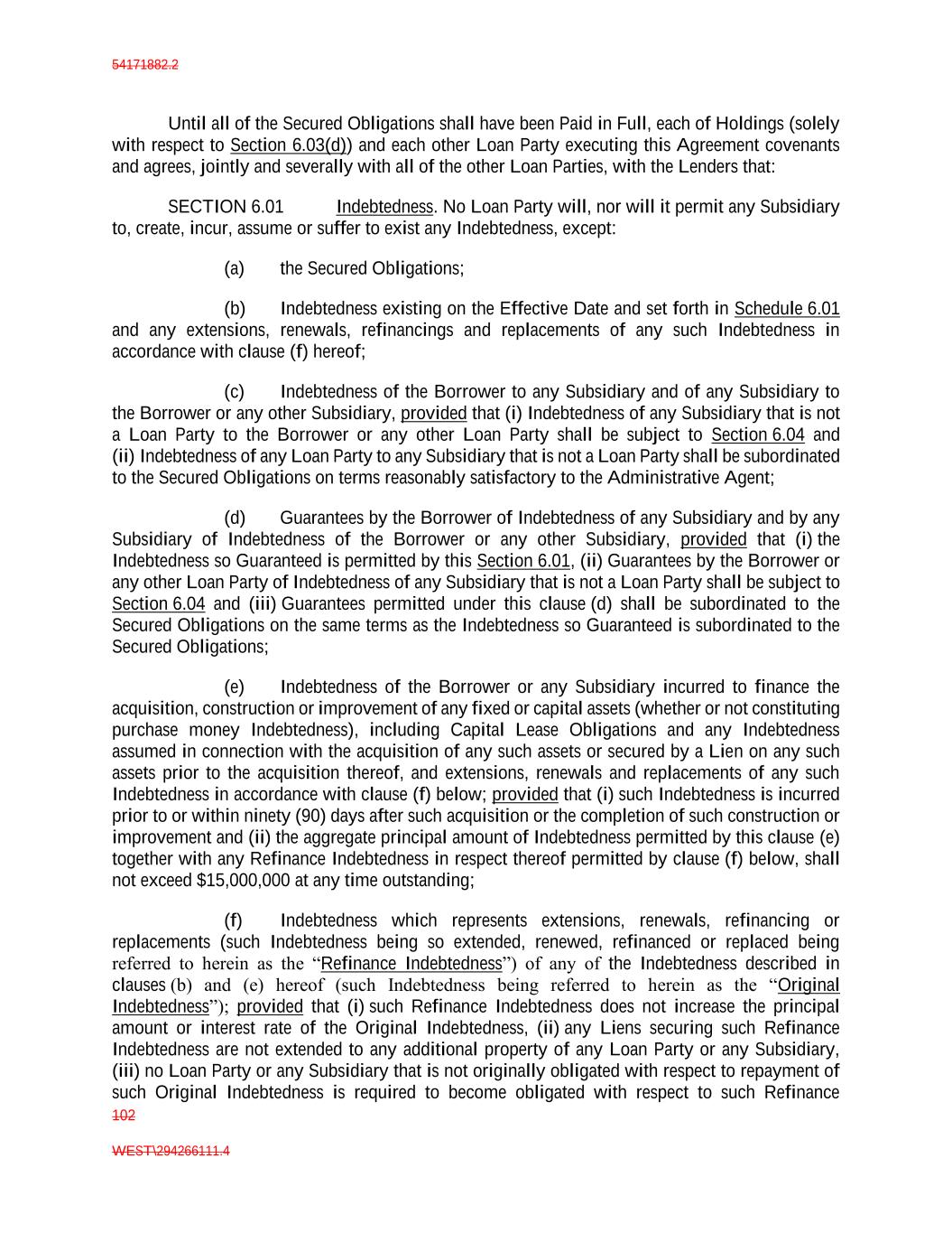 54171882.2 102 WEST\294266111.4 Until all of the Secured Obligations shall have been Paid in Full, each of Holdings (solely with respect to Section 6.03(d)) and each other Loan Party executing this Agreement covenants and agrees, jointly and severally with all of the other Loan Parties, with the Lenders that: SECTION 6.01 Indebtedness. No Loan Party will, nor will it permit any Subsidiary to, create, incur, assume or suffer to exist any Indebtedness, except: (a) the Secured Obligations; (b) Indebtedness existing on the Effective Date and set forth in Schedule 6.01 and any extensions, renewals, refinancings and replacements of any such Indebtedness in accordance with clause (f) hereof; (c) Indebtedness of the Borrower to any Subsidiary and of any Subsidiary to the Borrower or any other Subsidiary, provided that (i) Indebtedness of any Subsidiary that is not a Loan Party to the Borrower or any other Loan Party shall be subject to Section 6.04 and (ii) Indebtedness of any Loan Party to any Subsidiary that is not a Loan Party shall be subordinated to the Secured Obligations on terms reasonably satisfactory to the Administrative Agent; (d) Guarantees by the Borrower of Indebtedness of any Subsidiary and by any Subsidiary of Indebtedness of the Borrower or any other Subsidiary, provided that (i) the Indebtedness so Guaranteed is permitted by this Section 6.01, (ii) Guarantees by the Borrower or any other Loan Party of Indebtedness of any Subsidiary that is not a Loan Party shall be subject to Section 6.04 and (iii) Guarantees permitted under this clause (d) shall be subordinated to the Secured Obligations on the same terms as the Indebtedness so Guaranteed is subordinated to the Secured Obligations; (e) Indebtedness of the Borrower or any Subsidiary incurred to finance the acquisition, construction or improvement of any fixed or capital assets (whether or not constituting purchase money Indebtedness), including Capital Lease Obligations and any Indebtedness assumed in connection with the acquisition of any such assets or secured by a Lien on any such assets prior to the acquisition thereof, and extensions, renewals and replacements of any such Indebtedness in accordance with clause (f) below; provided that (i) such Indebtedness is incurred prior to or within ninety (90) days after such acquisition or the completion of such construction or improvement and (ii) the aggregate principal amount of Indebtedness permitted by this clause (e) together with any Refinance Indebtedness in respect thereof permitted by clause (f) below, shall not exceed $15,000,000 at any time outstanding; (f) Indebtedness which represents extensions, renewals, refinancing or replacements (such Indebtedness being so extended, renewed, refinanced or replaced being referred to herein as the “Refinance Indebtedness”) of any of the Indebtedness described in clauses (b) and (e) hereof (such Indebtedness being referred to herein as the “Original Indebtedness”); provided that (i) such Refinance Indebtedness does not increase the principal amount or interest rate of the Original Indebtedness, (ii) any Liens securing such Refinance Indebtedness are not extended to any additional property of any Loan Party or any Subsidiary, (iii) no Loan Party or any Subsidiary that is not originally obligated with respect to repayment of such Original Indebtedness is required to become obligated with respect to such Refinance