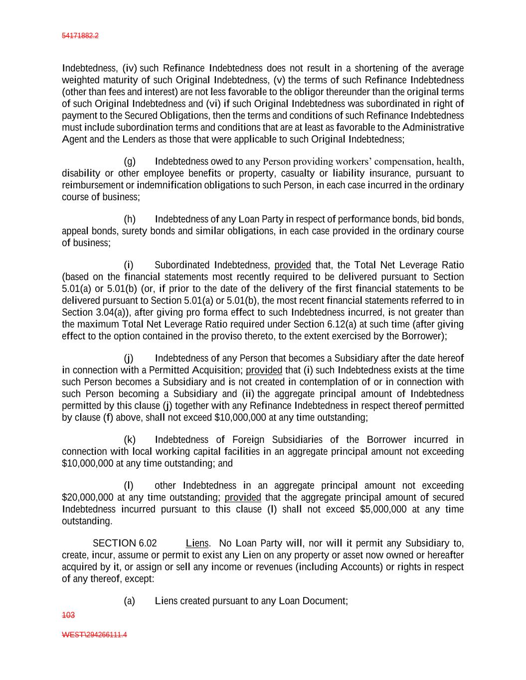 54171882.2 103 WEST\294266111.4 Indebtedness, (iv) such Refinance Indebtedness does not result in a shortening of the average weighted maturity of such Original Indebtedness, (v) the terms of such Refinance Indebtedness (other than fees and interest) are not less favorable to the obligor thereunder than the original terms of such Original Indebtedness and (vi) if such Original Indebtedness was subordinated in right of payment to the Secured Obligations, then the terms and conditions of such Refinance Indebtedness must include subordination terms and conditions that are at least as favorable to the Administrative Agent and the Lenders as those that were applicable to such Original Indebtedness; (g) Indebtedness owed to any Person providing workers’ compensation, health, disability or other employee benefits or property, casualty or liability insurance, pursuant to reimbursement or indemnification obligations to such Person, in each case incurred in the ordinary course of business; (h) Indebtedness of any Loan Party in respect of performance bonds, bid bonds, appeal bonds, surety bonds and similar obligations, in each case provided in the ordinary course of business; (i) Subordinated Indebtedness, provided that, the Total Net Leverage Ratio (based on the financial statements most recently required to be delivered pursuant to Section 5.01(a) or 5.01(b) (or, if prior to the date of the delivery of the first financial statements to be delivered pursuant to Section 5.01(a) or 5.01(b), the most recent financial statements referred to in Section 3.04(a)), after giving pro forma effect to such Indebtedness incurred, is not greater than the maximum Total Net Leverage Ratio required under Section 6.12(a) at such time (after giving effect to the option contained in the proviso thereto, to the extent exercised by the Borrower); (j) Indebtedness of any Person that becomes a Subsidiary after the date hereof in connection with a Permitted Acquisition; provided that (i) such Indebtedness exists at the time such Person becomes a Subsidiary and is not created in contemplation of or in connection with such Person becoming a Subsidiary and (ii) the aggregate principal amount of Indebtedness permitted by this clause (j) together with any Refinance Indebtedness in respect thereof permitted by clause (f) above, shall not exceed $10,000,000 at any time outstanding; (k) Indebtedness of Foreign Subsidiaries of the Borrower incurred in connection with local working capital facilities in an aggregate principal amount not exceeding $10,000,000 at any time outstanding; and (l) other Indebtedness in an aggregate principal amount not exceeding $20,000,000 at any time outstanding; provided that the aggregate principal amount of secured Indebtedness incurred pursuant to this clause (l) shall not exceed $5,000,000 at any time outstanding. SECTION 6.02 Liens. No Loan Party will, nor will it permit any Subsidiary to, create, incur, assume or permit to exist any Lien on any property or asset now owned or hereafter acquired by it, or assign or sell any income or revenues (including Accounts) or rights in respect of any thereof, except: (a) Liens created pursuant to any Loan Document;