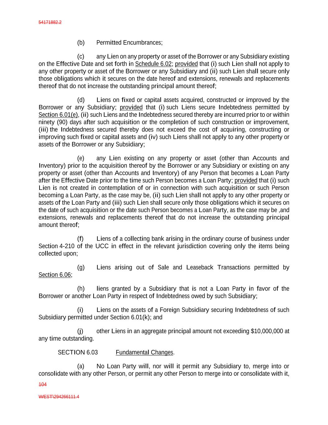 54171882.2 104 WEST\294266111.4 (b) Permitted Encumbrances; (c) any Lien on any property or asset of the Borrower or any Subsidiary existing on the Effective Date and set forth in Schedule 6.02; provided that (i) such Lien shall not apply to any other property or asset of the Borrower or any Subsidiary and (ii) such Lien shall secure only those obligations which it secures on the date hereof and extensions, renewals and replacements thereof that do not increase the outstanding principal amount thereof; (d) Liens on fixed or capital assets acquired, constructed or improved by the Borrower or any Subsidiary; provided that (i) such Liens secure Indebtedness permitted by Section 6.01(e), (ii) such Liens and the Indebtedness secured thereby are incurred prior to or within ninety (90) days after such acquisition or the completion of such construction or improvement, (iii) the Indebtedness secured thereby does not exceed the cost of acquiring, constructing or improving such fixed or capital assets and (iv) such Liens shall not apply to any other property or assets of the Borrower or any Subsidiary; (e) any Lien existing on any property or asset (other than Accounts and Inventory) prior to the acquisition thereof by the Borrower or any Subsidiary or existing on any property or asset (other than Accounts and Inventory) of any Person that becomes a Loan Party after the Effective Date prior to the time such Person becomes a Loan Party; provided that (i) such Lien is not created in contemplation of or in connection with such acquisition or such Person becoming a Loan Party, as the case may be, (ii) such Lien shall not apply to any other property or assets of the Loan Party and (iii) such Lien shall secure only those obligations which it secures on the date of such acquisition or the date such Person becomes a Loan Party, as the case may be ,and extensions, renewals and replacements thereof that do not increase the outstanding principal amount thereof; (f) Liens of a collecting bank arising in the ordinary course of business under Section 4-210 of the UCC in effect in the relevant jurisdiction covering only the items being collected upon; (g) Liens arising out of Sale and Leaseback Transactions permitted by Section 6.06; (h) liens granted by a Subsidiary that is not a Loan Party in favor of the Borrower or another Loan Party in respect of Indebtedness owed by such Subsidiary; (i) Liens on the assets of a Foreign Subsidiary securing Indebtedness of such Subsidiary permitted under Section 6.01(k); and (j) other Liens in an aggregate principal amount not exceeding $10,000,000 at any time outstanding. SECTION 6.03 Fundamental Changes. (a) No Loan Party will, nor will it permit any Subsidiary to, merge into or consolidate with any other Person, or permit any other Person to merge into or consolidate with it,