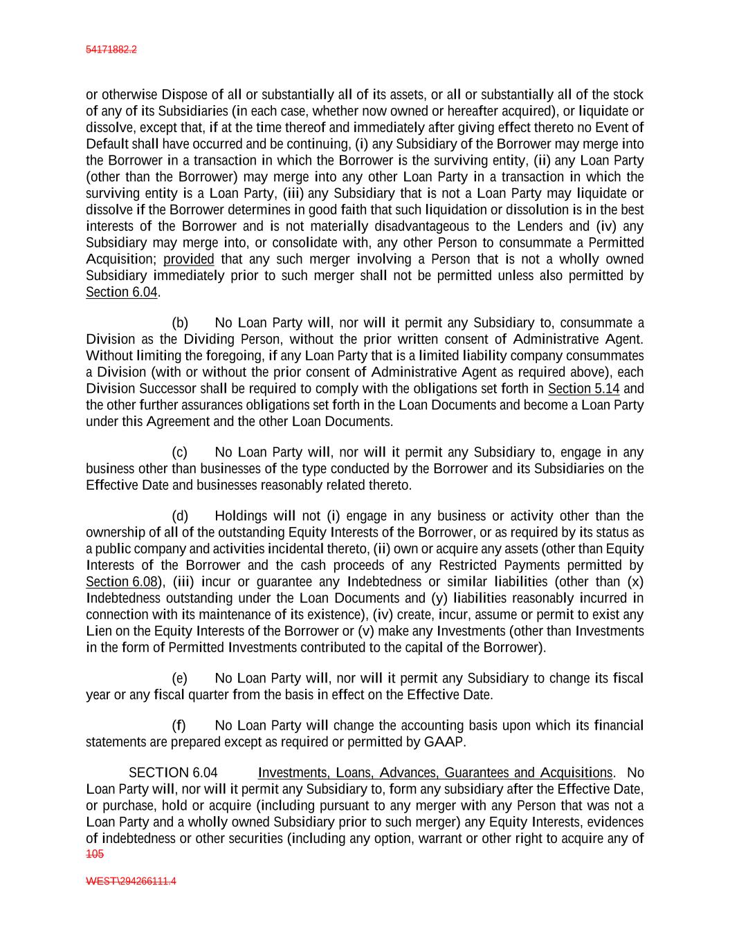 54171882.2 105 WEST\294266111.4 or otherwise Dispose of all or substantially all of its assets, or all or substantially all of the stock of any of its Subsidiaries (in each case, whether now owned or hereafter acquired), or liquidate or dissolve, except that, if at the time thereof and immediately after giving effect thereto no Event of Default shall have occurred and be continuing, (i) any Subsidiary of the Borrower may merge into the Borrower in a transaction in which the Borrower is the surviving entity, (ii) any Loan Party (other than the Borrower) may merge into any other Loan Party in a transaction in which the surviving entity is a Loan Party, (iii) any Subsidiary that is not a Loan Party may liquidate or dissolve if the Borrower determines in good faith that such liquidation or dissolution is in the best interests of the Borrower and is not materially disadvantageous to the Lenders and (iv) any Subsidiary may merge into, or consolidate with, any other Person to consummate a Permitted Acquisition; provided that any such merger involving a Person that is not a wholly owned Subsidiary immediately prior to such merger shall not be permitted unless also permitted by Section 6.04. (b) No Loan Party will, nor will it permit any Subsidiary to, consummate a Division as the Dividing Person, without the prior written consent of Administrative Agent. Without limiting the foregoing, if any Loan Party that is a limited liability company consummates a Division (with or without the prior consent of Administrative Agent as required above), each Division Successor shall be required to comply with the obligations set forth in Section 5.14 and the other further assurances obligations set forth in the Loan Documents and become a Loan Party under this Agreement and the other Loan Documents. (c) No Loan Party will, nor will it permit any Subsidiary to, engage in any business other than businesses of the type conducted by the Borrower and its Subsidiaries on the Effective Date and businesses reasonably related thereto. (d) Holdings will not (i) engage in any business or activity other than the ownership of all of the outstanding Equity Interests of the Borrower, or as required by its status as a public company and activities incidental thereto, (ii) own or acquire any assets (other than Equity Interests of the Borrower and the cash proceeds of any Restricted Payments permitted by Section 6.08), (iii) incur or guarantee any Indebtedness or similar liabilities (other than (x) Indebtedness outstanding under the Loan Documents and (y) liabilities reasonably incurred in connection with its maintenance of its existence), (iv) create, incur, assume or permit to exist any Lien on the Equity Interests of the Borrower or (v) make any Investments (other than Investments in the form of Permitted Investments contributed to the capital of the Borrower). (e) No Loan Party will, nor will it permit any Subsidiary to change its fiscal year or any fiscal quarter from the basis in effect on the Effective Date. (f) No Loan Party will change the accounting basis upon which its financial statements are prepared except as required or permitted by GAAP. SECTION 6.04 Investments, Loans, Advances, Guarantees and Acquisitions. No Loan Party will, nor will it permit any Subsidiary to, form any subsidiary after the Effective Date, or purchase, hold or acquire (including pursuant to any merger with any Person that was not a Loan Party and a wholly owned Subsidiary prior to such merger) any Equity Interests, evidences of indebtedness or other securities (including any option, warrant or other right to acquire any of