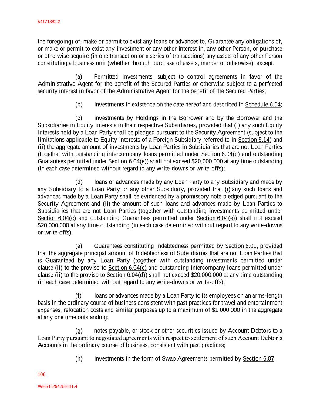 54171882.2 106 WEST\294266111.4 the foregoing) of, make or permit to exist any loans or advances to, Guarantee any obligations of, or make or permit to exist any investment or any other interest in, any other Person, or purchase or otherwise acquire (in one transaction or a series of transactions) any assets of any other Person constituting a business unit (whether through purchase of assets, merger or otherwise), except: (a) Permitted Investments, subject to control agreements in favor of the Administrative Agent for the benefit of the Secured Parties or otherwise subject to a perfected security interest in favor of the Administrative Agent for the benefit of the Secured Parties; (b) investments in existence on the date hereof and described in Schedule 6.04; (c) investments by Holdings in the Borrower and by the Borrower and the Subsidiaries in Equity Interests in their respective Subsidiaries, provided that (i) any such Equity Interests held by a Loan Party shall be pledged pursuant to the Security Agreement (subject to the limitations applicable to Equity Interests of a Foreign Subsidiary referred to in Section 5.14) and (ii) the aggregate amount of investments by Loan Parties in Subsidiaries that are not Loan Parties (together with outstanding intercompany loans permitted under Section 6.04(d) and outstanding Guarantees permitted under Section 6.04(e)) shall not exceed $20,000,000 at any time outstanding (in each case determined without regard to any write-downs or write-offs); (d) loans or advances made by any Loan Party to any Subsidiary and made by any Subsidiary to a Loan Party or any other Subsidiary, provided that (i) any such loans and advances made by a Loan Party shall be evidenced by a promissory note pledged pursuant to the Security Agreement and (ii) the amount of such loans and advances made by Loan Parties to Subsidiaries that are not Loan Parties (together with outstanding investments permitted under Section 6.04(c) and outstanding Guarantees permitted under Section 6.04(e)) shall not exceed $20,000,000 at any time outstanding (in each case determined without regard to any write-downs or write-offs); (e) Guarantees constituting Indebtedness permitted by Section 6.01, provided that the aggregate principal amount of Indebtedness of Subsidiaries that are not Loan Parties that is Guaranteed by any Loan Party (together with outstanding investments permitted under clause (ii) to the proviso to Section 6.04(c) and outstanding intercompany loans permitted under clause (ii) to the proviso to Section 6.04(d)) shall not exceed $20,000,000 at any time outstanding (in each case determined without regard to any write-downs or write-offs); (f) loans or advances made by a Loan Party to its employees on an arms-length basis in the ordinary course of business consistent with past practices for travel and entertainment expenses, relocation costs and similar purposes up to a maximum of $1,000,000 in the aggregate at any one time outstanding; (g) notes payable, or stock or other securities issued by Account Debtors to a Loan Party pursuant to negotiated agreements with respect to settlement of such Account Debtor’s Accounts in the ordinary course of business, consistent with past practices; (h) investments in the form of Swap Agreements permitted by Section 6.07;