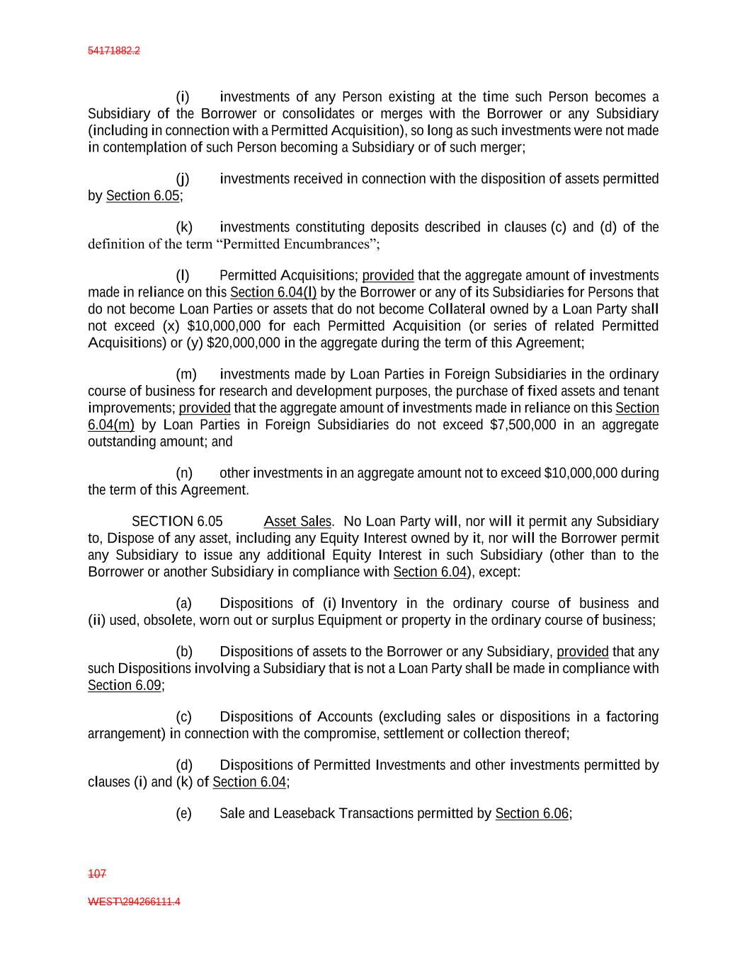 54171882.2 107 WEST\294266111.4 (i) investments of any Person existing at the time such Person becomes a Subsidiary of the Borrower or consolidates or merges with the Borrower or any Subsidiary (including in connection with a Permitted Acquisition), so long as such investments were not made in contemplation of such Person becoming a Subsidiary or of such merger; (j) investments received in connection with the disposition of assets permitted by Section 6.05; (k) investments constituting deposits described in clauses (c) and (d) of the definition of the term “Permitted Encumbrances”; (l) Permitted Acquisitions; provided that the aggregate amount of investments made in reliance on this Section 6.04(l) by the Borrower or any of its Subsidiaries for Persons that do not become Loan Parties or assets that do not become Collateral owned by a Loan Party shall not exceed (x) $10,000,000 for each Permitted Acquisition (or series of related Permitted Acquisitions) or (y) $20,000,000 in the aggregate during the term of this Agreement; (m) investments made by Loan Parties in Foreign Subsidiaries in the ordinary course of business for research and development purposes, the purchase of fixed assets and tenant improvements; provided that the aggregate amount of investments made in reliance on this Section 6.04(m) by Loan Parties in Foreign Subsidiaries do not exceed $7,500,000 in an aggregate outstanding amount; and (n) other investments in an aggregate amount not to exceed $10,000,000 during the term of this Agreement. SECTION 6.05 Asset Sales. No Loan Party will, nor will it permit any Subsidiary to, Dispose of any asset, including any Equity Interest owned by it, nor will the Borrower permit any Subsidiary to issue any additional Equity Interest in such Subsidiary (other than to the Borrower or another Subsidiary in compliance with Section 6.04), except: (a) Dispositions of (i) Inventory in the ordinary course of business and (ii) used, obsolete, worn out or surplus Equipment or property in the ordinary course of business; (b) Dispositions of assets to the Borrower or any Subsidiary, provided that any such Dispositions involving a Subsidiary that is not a Loan Party shall be made in compliance with Section 6.09; (c) Dispositions of Accounts (excluding sales or dispositions in a factoring arrangement) in connection with the compromise, settlement or collection thereof; (d) Dispositions of Permitted Investments and other investments permitted by clauses (i) and (k) of Section 6.04; (e) Sale and Leaseback Transactions permitted by Section 6.06;