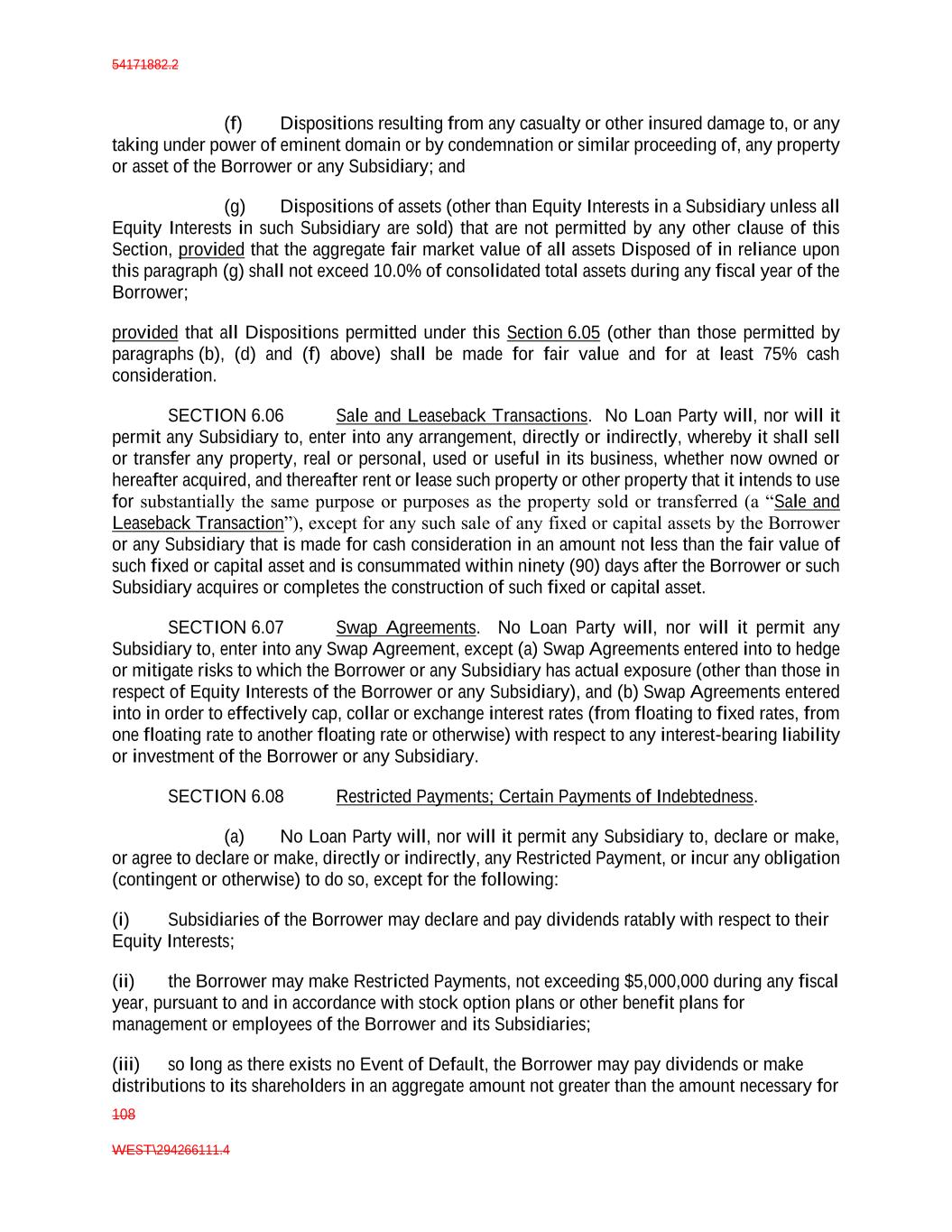 54171882.2 108 WEST\294266111.4 (f) Dispositions resulting from any casualty or other insured damage to, or any taking under power of eminent domain or by condemnation or similar proceeding of, any property or asset of the Borrower or any Subsidiary; and (g) Dispositions of assets (other than Equity Interests in a Subsidiary unless all Equity Interests in such Subsidiary are sold) that are not permitted by any other clause of this Section, provided that the aggregate fair market value of all assets Disposed of in reliance upon this paragraph (g) shall not exceed 10.0% of consolidated total assets during any fiscal year of the Borrower; provided that all Dispositions permitted under this Section 6.05 (other than those permitted by paragraphs (b), (d) and (f) above) shall be made for fair value and for at least 75% cash consideration. SECTION 6.06 Sale and Leaseback Transactions. No Loan Party will, nor will it permit any Subsidiary to, enter into any arrangement, directly or indirectly, whereby it shall sell or transfer any property, real or personal, used or useful in its business, whether now owned or hereafter acquired, and thereafter rent or lease such property or other property that it intends to use for substantially the same purpose or purposes as the property sold or transferred (a “Sale and Leaseback Transaction”), except for any such sale of any fixed or capital assets by the Borrower or any Subsidiary that is made for cash consideration in an amount not less than the fair value of such fixed or capital asset and is consummated within ninety (90) days after the Borrower or such Subsidiary acquires or completes the construction of such fixed or capital asset. SECTION 6.07 Swap Agreements. No Loan Party will, nor will it permit any Subsidiary to, enter into any Swap Agreement, except (a) Swap Agreements entered into to hedge or mitigate risks to which the Borrower or any Subsidiary has actual exposure (other than those in respect of Equity Interests of the Borrower or any Subsidiary), and (b) Swap Agreements entered into in order to effectively cap, collar or exchange interest rates (from floating to fixed rates, from one floating rate to another floating rate or otherwise) with respect to any interest-bearing liability or investment of the Borrower or any Subsidiary. SECTION 6.08 Restricted Payments; Certain Payments of Indebtedness. (a) No Loan Party will, nor will it permit any Subsidiary to, declare or make, or agree to declare or make, directly or indirectly, any Restricted Payment, or incur any obligation (contingent or otherwise) to do so, except for the following: (i) Subsidiaries of the Borrower may declare and pay dividends ratably with respect to their Equity Interests; (ii) the Borrower may make Restricted Payments, not exceeding $5,000,000 during any fiscal year, pursuant to and in accordance with stock option plans or other benefit plans for management or employees of the Borrower and its Subsidiaries; (iii) so long as there exists no Event of Default, the Borrower may pay dividends or make distributions to its shareholders in an aggregate amount not greater than the amount necessary for