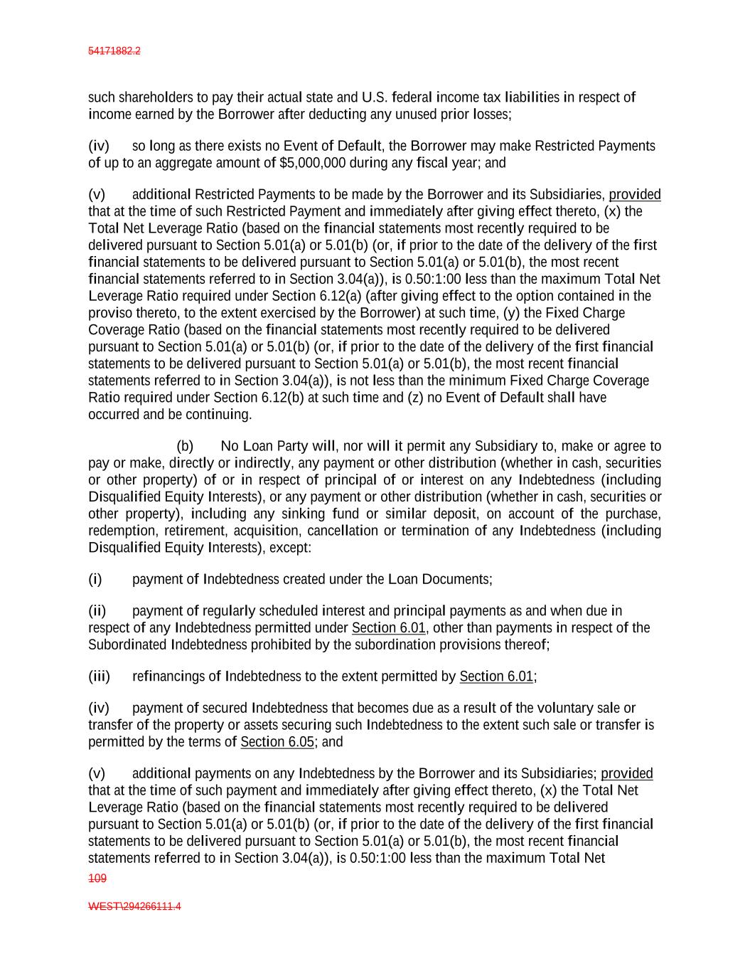 54171882.2 109 WEST\294266111.4 such shareholders to pay their actual state and U.S. federal income tax liabilities in respect of income earned by the Borrower after deducting any unused prior losses; (iv) so long as there exists no Event of Default, the Borrower may make Restricted Payments of up to an aggregate amount of $5,000,000 during any fiscal year; and (v) additional Restricted Payments to be made by the Borrower and its Subsidiaries, provided that at the time of such Restricted Payment and immediately after giving effect thereto, (x) the Total Net Leverage Ratio (based on the financial statements most recently required to be delivered pursuant to Section 5.01(a) or 5.01(b) (or, if prior to the date of the delivery of the first financial statements to be delivered pursuant to Section 5.01(a) or 5.01(b), the most recent financial statements referred to in Section 3.04(a)), is 0.50:1:00 less than the maximum Total Net Leverage Ratio required under Section 6.12(a) (after giving effect to the option contained in the proviso thereto, to the extent exercised by the Borrower) at such time, (y) the Fixed Charge Coverage Ratio (based on the financial statements most recently required to be delivered pursuant to Section 5.01(a) or 5.01(b) (or, if prior to the date of the delivery of the first financial statements to be delivered pursuant to Section 5.01(a) or 5.01(b), the most recent financial statements referred to in Section 3.04(a)), is not less than the minimum Fixed Charge Coverage Ratio required under Section 6.12(b) at such time and (z) no Event of Default shall have occurred and be continuing. (b) No Loan Party will, nor will it permit any Subsidiary to, make or agree to pay or make, directly or indirectly, any payment or other distribution (whether in cash, securities or other property) of or in respect of principal of or interest on any Indebtedness (including Disqualified Equity Interests), or any payment or other distribution (whether in cash, securities or other property), including any sinking fund or similar deposit, on account of the purchase, redemption, retirement, acquisition, cancellation or termination of any Indebtedness (including Disqualified Equity Interests), except: (i) payment of Indebtedness created under the Loan Documents; (ii) payment of regularly scheduled interest and principal payments as and when due in respect of any Indebtedness permitted under Section 6.01, other than payments in respect of the Subordinated Indebtedness prohibited by the subordination provisions thereof; (iii) refinancings of Indebtedness to the extent permitted by Section 6.01; (iv) payment of secured Indebtedness that becomes due as a result of the voluntary sale or transfer of the property or assets securing such Indebtedness to the extent such sale or transfer is permitted by the terms of Section 6.05; and (v) additional payments on any Indebtedness by the Borrower and its Subsidiaries; provided that at the time of such payment and immediately after giving effect thereto, (x) the Total Net Leverage Ratio (based on the financial statements most recently required to be delivered pursuant to Section 5.01(a) or 5.01(b) (or, if prior to the date of the delivery of the first financial statements to be delivered pursuant to Section 5.01(a) or 5.01(b), the most recent financial statements referred to in Section 3.04(a)), is 0.50:1:00 less than the maximum Total Net