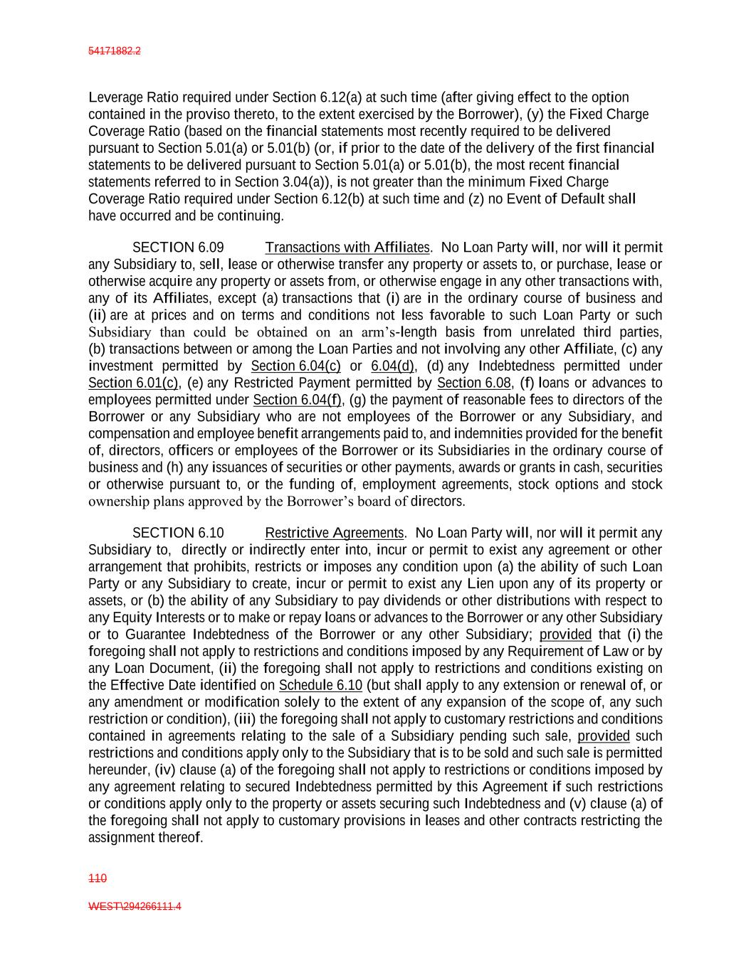 54171882.2 110 WEST\294266111.4 Leverage Ratio required under Section 6.12(a) at such time (after giving effect to the option contained in the proviso thereto, to the extent exercised by the Borrower), (y) the Fixed Charge Coverage Ratio (based on the financial statements most recently required to be delivered pursuant to Section 5.01(a) or 5.01(b) (or, if prior to the date of the delivery of the first financial statements to be delivered pursuant to Section 5.01(a) or 5.01(b), the most recent financial statements referred to in Section 3.04(a)), is not greater than the minimum Fixed Charge Coverage Ratio required under Section 6.12(b) at such time and (z) no Event of Default shall have occurred and be continuing. SECTION 6.09 Transactions with Affiliates. No Loan Party will, nor will it permit any Subsidiary to, sell, lease or otherwise transfer any property or assets to, or purchase, lease or otherwise acquire any property or assets from, or otherwise engage in any other transactions with, any of its Affiliates, except (a) transactions that (i) are in the ordinary course of business and (ii) are at prices and on terms and conditions not less favorable to such Loan Party or such Subsidiary than could be obtained on an arm’s-length basis from unrelated third parties, (b) transactions between or among the Loan Parties and not involving any other Affiliate, (c) any investment permitted by Section 6.04(c) or 6.04(d), (d) any Indebtedness permitted under Section 6.01(c), (e) any Restricted Payment permitted by Section 6.08, (f) loans or advances to employees permitted under Section 6.04(f), (g) the payment of reasonable fees to directors of the Borrower or any Subsidiary who are not employees of the Borrower or any Subsidiary, and compensation and employee benefit arrangements paid to, and indemnities provided for the benefit of, directors, officers or employees of the Borrower or its Subsidiaries in the ordinary course of business and (h) any issuances of securities or other payments, awards or grants in cash, securities or otherwise pursuant to, or the funding of, employment agreements, stock options and stock ownership plans approved by the Borrower’s board of directors. SECTION 6.10 Restrictive Agreements. No Loan Party will, nor will it permit any Subsidiary to, directly or indirectly enter into, incur or permit to exist any agreement or other arrangement that prohibits, restricts or imposes any condition upon (a) the ability of such Loan Party or any Subsidiary to create, incur or permit to exist any Lien upon any of its property or assets, or (b) the ability of any Subsidiary to pay dividends or other distributions with respect to any Equity Interests or to make or repay loans or advances to the Borrower or any other Subsidiary or to Guarantee Indebtedness of the Borrower or any other Subsidiary; provided that (i) the foregoing shall not apply to restrictions and conditions imposed by any Requirement of Law or by any Loan Document, (ii) the foregoing shall not apply to restrictions and conditions existing on the Effective Date identified on Schedule 6.10 (but shall apply to any extension or renewal of, or any amendment or modification solely to the extent of any expansion of the scope of, any such restriction or condition), (iii) the foregoing shall not apply to customary restrictions and conditions contained in agreements relating to the sale of a Subsidiary pending such sale, provided such restrictions and conditions apply only to the Subsidiary that is to be sold and such sale is permitted hereunder, (iv) clause (a) of the foregoing shall not apply to restrictions or conditions imposed by any agreement relating to secured Indebtedness permitted by this Agreement if such restrictions or conditions apply only to the property or assets securing such Indebtedness and (v) clause (a) of the foregoing shall not apply to customary provisions in leases and other contracts restricting the assignment thereof.