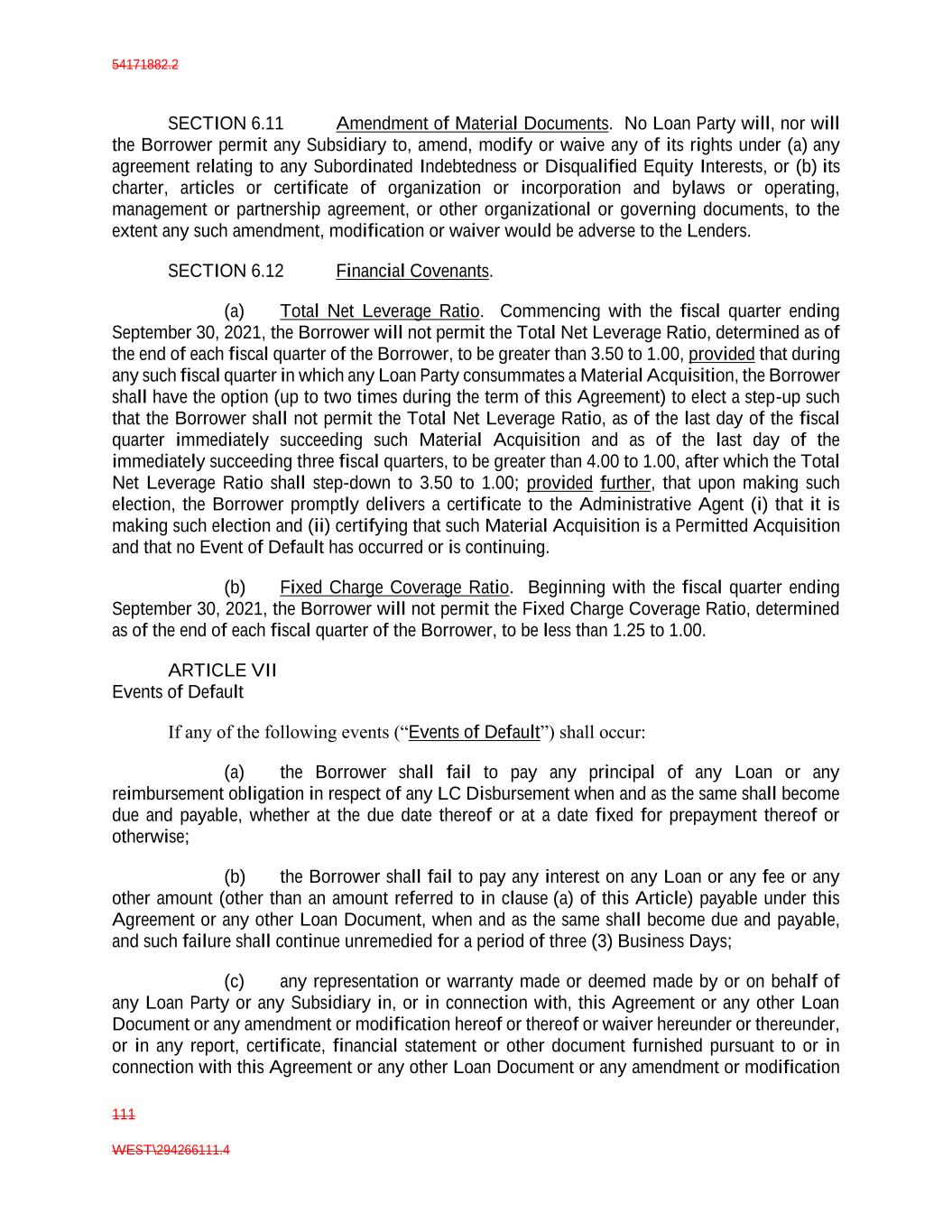 54171882.2 111 WEST\294266111.4 SECTION 6.11 Amendment of Material Documents. No Loan Party will, nor will the Borrower permit any Subsidiary to, amend, modify or waive any of its rights under (a) any agreement relating to any Subordinated Indebtedness or Disqualified Equity Interests, or (b) its charter, articles or certificate of organization or incorporation and bylaws or operating, management or partnership agreement, or other organizational or governing documents, to the extent any such amendment, modification or waiver would be adverse to the Lenders. SECTION 6.12 Financial Covenants. (a) Total Net Leverage Ratio. Commencing with the fiscal quarter ending September 30, 2021, the Borrower will not permit the Total Net Leverage Ratio, determined as of the end of each fiscal quarter of the Borrower, to be greater than 3.50 to 1.00, provided that during any such fiscal quarter in which any Loan Party consummates a Material Acquisition, the Borrower shall have the option (up to two times during the term of this Agreement) to elect a step-up such that the Borrower shall not permit the Total Net Leverage Ratio, as of the last day of the fiscal quarter immediately succeeding such Material Acquisition and as of the last day of the immediately succeeding three fiscal quarters, to be greater than 4.00 to 1.00, after which the Total Net Leverage Ratio shall step-down to 3.50 to 1.00; provided further, that upon making such election, the Borrower promptly delivers a certificate to the Administrative Agent (i) that it is making such election and (ii) certifying that such Material Acquisition is a Permitted Acquisition and that no Event of Default has occurred or is continuing. (b) Fixed Charge Coverage Ratio. Beginning with the fiscal quarter ending September 30, 2021, the Borrower will not permit the Fixed Charge Coverage Ratio, determined as of the end of each fiscal quarter of the Borrower, to be less than 1.25 to 1.00. ARTICLE VII Events of Default If any of the following events (“Events of Default”) shall occur: (a) the Borrower shall fail to pay any principal of any Loan or any reimbursement obligation in respect of any LC Disbursement when and as the same shall become due and payable, whether at the due date thereof or at a date fixed for prepayment thereof or otherwise; (b) the Borrower shall fail to pay any interest on any Loan or any fee or any other amount (other than an amount referred to in clause (a) of this Article) payable under this Agreement or any other Loan Document, when and as the same shall become due and payable, and such failure shall continue unremedied for a period of three (3) Business Days; (c) any representation or warranty made or deemed made by or on behalf of any Loan Party or any Subsidiary in, or in connection with, this Agreement or any other Loan Document or any amendment or modification hereof or thereof or waiver hereunder or thereunder, or in any report, certificate, financial statement or other document furnished pursuant to or in connection with this Agreement or any other Loan Document or any amendment or modification