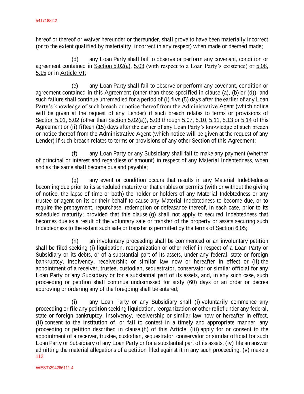 54171882.2 112 WEST\294266111.4 hereof or thereof or waiver hereunder or thereunder, shall prove to have been materially incorrect (or to the extent qualified by materiality, incorrect in any respect) when made or deemed made; (d) any Loan Party shall fail to observe or perform any covenant, condition or agreement contained in Section 5.02(a), 5.03 (with respect to a Loan Party’s existence) or 5.08, 5.15 or in Article VI; (e) any Loan Party shall fail to observe or perform any covenant, condition or agreement contained in this Agreement (other than those specified in clause (a), (b) or (d)), and such failure shall continue unremedied for a period of (i) five (5) days after the earlier of any Loan Party’s knowledge of such breach or notice thereof from the Administrative Agent (which notice will be given at the request of any Lender) if such breach relates to terms or provisions of Section 5.01, 5.02 (other than Section 5.02(a)), 5.03 through 5.07, 5.10, 5.11, 5.13 or 5.14 of this Agreement or (ii) fifteen (15) days after the earlier of any Loan Party’s knowledge of such breach or notice thereof from the Administrative Agent (which notice will be given at the request of any Lender) if such breach relates to terms or provisions of any other Section of this Agreement; (f) any Loan Party or any Subsidiary shall fail to make any payment (whether of principal or interest and regardless of amount) in respect of any Material Indebtedness, when and as the same shall become due and payable; (g) any event or condition occurs that results in any Material Indebtedness becoming due prior to its scheduled maturity or that enables or permits (with or without the giving of notice, the lapse of time or both) the holder or holders of any Material Indebtedness or any trustee or agent on its or their behalf to cause any Material Indebtedness to become due, or to require the prepayment, repurchase, redemption or defeasance thereof, in each case, prior to its scheduled maturity; provided that this clause (g) shall not apply to secured Indebtedness that becomes due as a result of the voluntary sale or transfer of the property or assets securing such Indebtedness to the extent such sale or transfer is permitted by the terms of Section 6.05; (h) an involuntary proceeding shall be commenced or an involuntary petition shall be filed seeking (i) liquidation, reorganization or other relief in respect of a Loan Party or Subsidiary or its debts, or of a substantial part of its assets, under any federal, state or foreign bankruptcy, insolvency, receivership or similar law now or hereafter in effect or (ii) the appointment of a receiver, trustee, custodian, sequestrator, conservator or similar official for any Loan Party or any Subsidiary or for a substantial part of its assets, and, in any such case, such proceeding or petition shall continue undismissed for sixty (60) days or an order or decree approving or ordering any of the foregoing shall be entered; (i) any Loan Party or any Subsidiary shall (i) voluntarily commence any proceeding or file any petition seeking liquidation, reorganization or other relief under any federal, state or foreign bankruptcy, insolvency, receivership or similar law now or hereafter in effect, (ii) consent to the institution of, or fail to contest in a timely and appropriate manner, any proceeding or petition described in clause (h) of this Article, (iii) apply for or consent to the appointment of a receiver, trustee, custodian, sequestrator, conservator or similar official for such Loan Party or Subsidiary of any Loan Party or for a substantial part of its assets, (iv) file an answer admitting the material allegations of a petition filed against it in any such proceeding, (v) make a