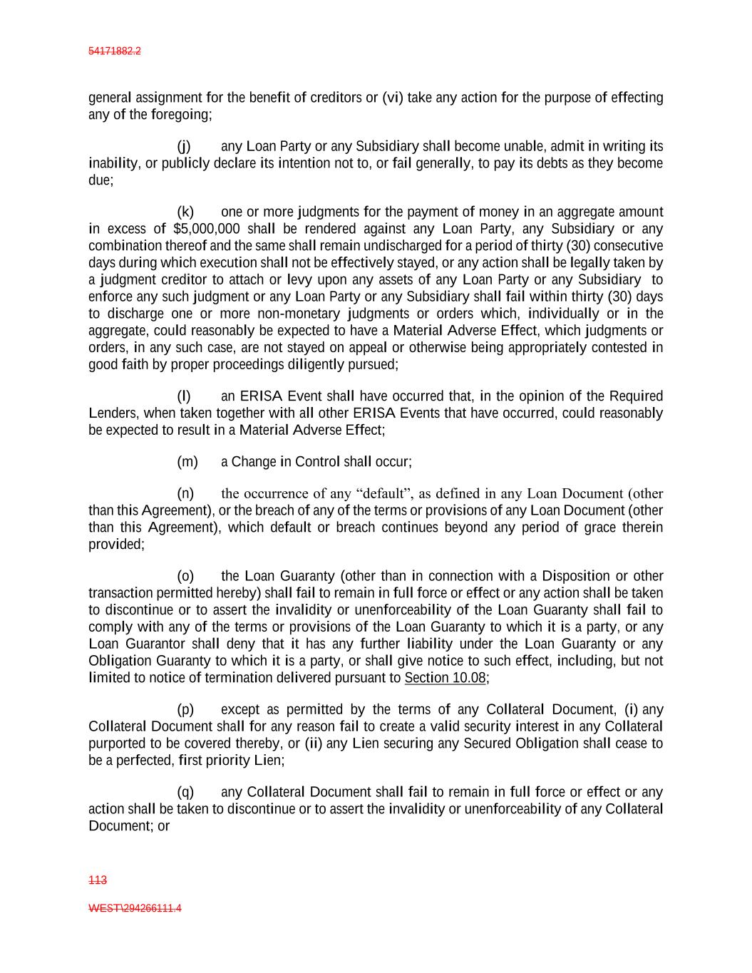 54171882.2 113 WEST\294266111.4 general assignment for the benefit of creditors or (vi) take any action for the purpose of effecting any of the foregoing; (j) any Loan Party or any Subsidiary shall become unable, admit in writing its inability, or publicly declare its intention not to, or fail generally, to pay its debts as they become due; (k) one or more judgments for the payment of money in an aggregate amount in excess of $5,000,000 shall be rendered against any Loan Party, any Subsidiary or any combination thereof and the same shall remain undischarged for a period of thirty (30) consecutive days during which execution shall not be effectively stayed, or any action shall be legally taken by a judgment creditor to attach or levy upon any assets of any Loan Party or any Subsidiary to enforce any such judgment or any Loan Party or any Subsidiary shall fail within thirty (30) days to discharge one or more non-monetary judgments or orders which, individually or in the aggregate, could reasonably be expected to have a Material Adverse Effect, which judgments or orders, in any such case, are not stayed on appeal or otherwise being appropriately contested in good faith by proper proceedings diligently pursued; (l) an ERISA Event shall have occurred that, in the opinion of the Required Lenders, when taken together with all other ERISA Events that have occurred, could reasonably be expected to result in a Material Adverse Effect; (m) a Change in Control shall occur; (n) the occurrence of any “default”, as defined in any Loan Document (other than this Agreement), or the breach of any of the terms or provisions of any Loan Document (other than this Agreement), which default or breach continues beyond any period of grace therein provided; (o) the Loan Guaranty (other than in connection with a Disposition or other transaction permitted hereby) shall fail to remain in full force or effect or any action shall be taken to discontinue or to assert the invalidity or unenforceability of the Loan Guaranty shall fail to comply with any of the terms or provisions of the Loan Guaranty to which it is a party, or any Loan Guarantor shall deny that it has any further liability under the Loan Guaranty or any Obligation Guaranty to which it is a party, or shall give notice to such effect, including, but not limited to notice of termination delivered pursuant to Section 10.08; (p) except as permitted by the terms of any Collateral Document, (i) any Collateral Document shall for any reason fail to create a valid security interest in any Collateral purported to be covered thereby, or (ii) any Lien securing any Secured Obligation shall cease to be a perfected, first priority Lien; (q) any Collateral Document shall fail to remain in full force or effect or any action shall be taken to discontinue or to assert the invalidity or unenforceability of any Collateral Document; or