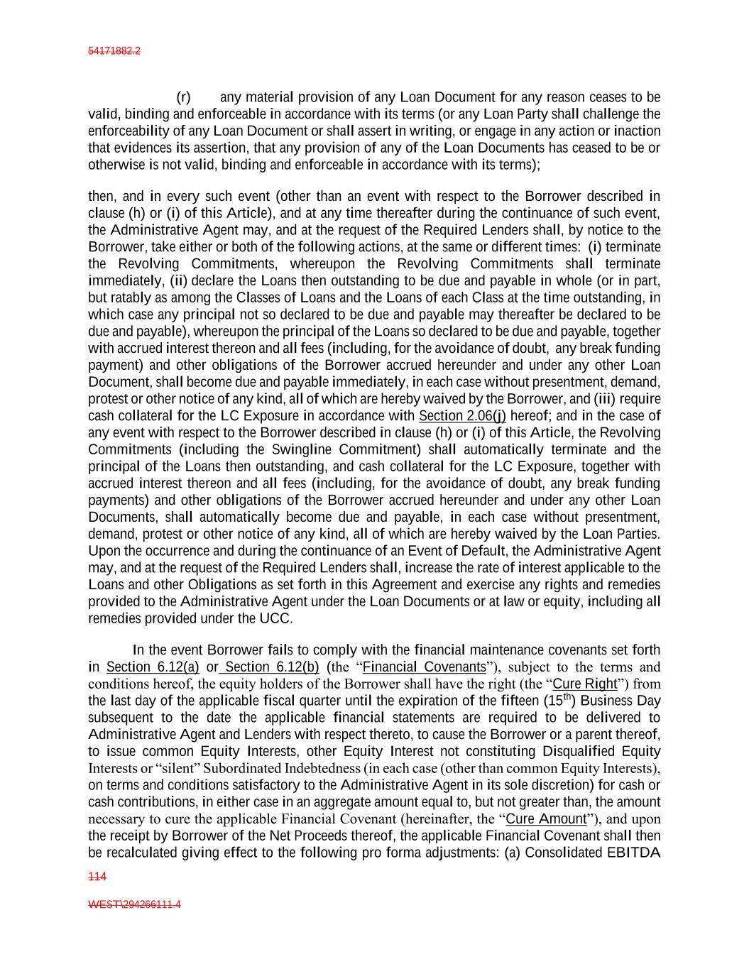 54171882.2 114 WEST\294266111.4 (r) any material provision of any Loan Document for any reason ceases to be valid, binding and enforceable in accordance with its terms (or any Loan Party shall challenge the enforceability of any Loan Document or shall assert in writing, or engage in any action or inaction that evidences its assertion, that any provision of any of the Loan Documents has ceased to be or otherwise is not valid, binding and enforceable in accordance with its terms); then, and in every such event (other than an event with respect to the Borrower described in clause (h) or (i) of this Article), and at any time thereafter during the continuance of such event, the Administrative Agent may, and at the request of the Required Lenders shall, by notice to the Borrower, take either or both of the following actions, at the same or different times: (i) terminate the Revolving Commitments, whereupon the Revolving Commitments shall terminate immediately, (ii) declare the Loans then outstanding to be due and payable in whole (or in part, but ratably as among the Classes of Loans and the Loans of each Class at the time outstanding, in which case any principal not so declared to be due and payable may thereafter be declared to be due and payable), whereupon the principal of the Loans so declared to be due and payable, together with accrued interest thereon and all fees (including, for the avoidance of doubt, any break funding payment) and other obligations of the Borrower accrued hereunder and under any other Loan Document, shall become due and payable immediately, in each case without presentment, demand, protest or other notice of any kind, all of which are hereby waived by the Borrower, and (iii) require cash collateral for the LC Exposure in accordance with Section 2.06(j) hereof; and in the case of any event with respect to the Borrower described in clause (h) or (i) of this Article, the Revolving Commitments (including the Swingline Commitment) shall automatically terminate and the principal of the Loans then outstanding, and cash collateral for the LC Exposure, together with accrued interest thereon and all fees (including, for the avoidance of doubt, any break funding payments) and other obligations of the Borrower accrued hereunder and under any other Loan Documents, shall automatically become due and payable, in each case without presentment, demand, protest or other notice of any kind, all of which are hereby waived by the Loan Parties. Upon the occurrence and during the continuance of an Event of Default, the Administrative Agent may, and at the request of the Required Lenders shall, increase the rate of interest applicable to the Loans and other Obligations as set forth in this Agreement and exercise any rights and remedies provided to the Administrative Agent under the Loan Documents or at law or equity, including all remedies provided under the UCC. In the event Borrower fails to comply with the financial maintenance covenants set forth in Section 6.12(a) or Section 6.12(b) (the “Financial Covenants”), subject to the terms and conditions hereof, the equity holders of the Borrower shall have the right (the “Cure Right”) from the last day of the applicable fiscal quarter until the expiration of the fifteen (15th) Business Day subsequent to the date the applicable financial statements are required to be delivered to Administrative Agent and Lenders with respect thereto, to cause the Borrower or a parent thereof, to issue common Equity Interests, other Equity Interest not constituting Disqualified Equity Interests or “silent” Subordinated Indebtedness (in each case (other than common Equity Interests), on terms and conditions satisfactory to the Administrative Agent in its sole discretion) for cash or cash contributions, in either case in an aggregate amount equal to, but not greater than, the amount necessary to cure the applicable Financial Covenant (hereinafter, the “Cure Amount”), and upon the receipt by Borrower of the Net Proceeds thereof, the applicable Financial Covenant shall then be recalculated giving effect to the following pro forma adjustments: (a) Consolidated EBITDA