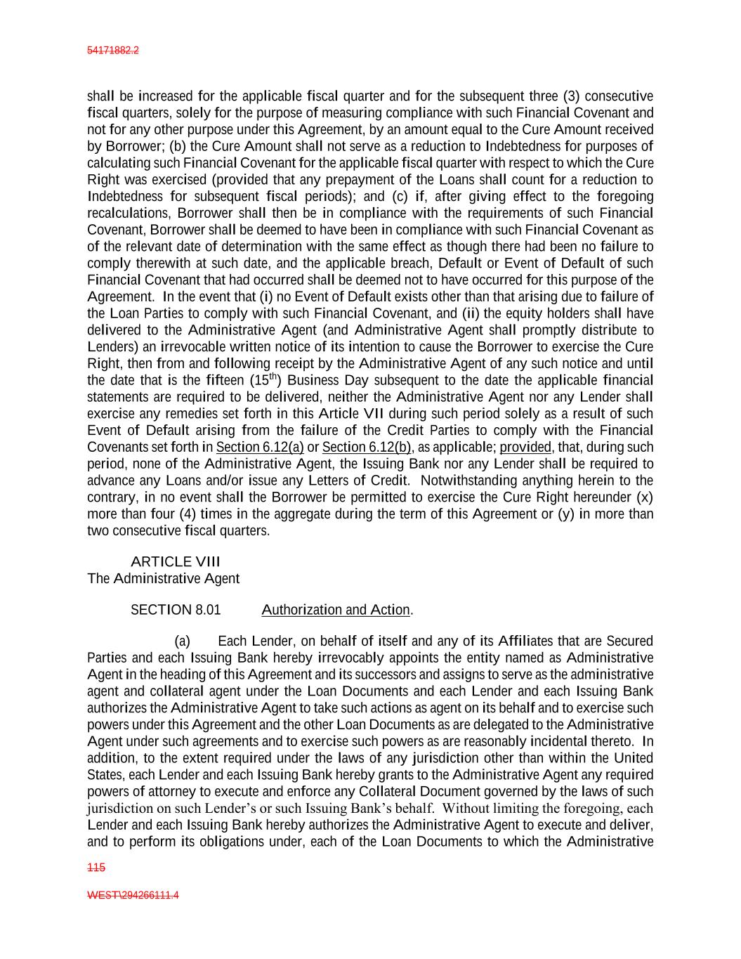 54171882.2 115 WEST\294266111.4 shall be increased for the applicable fiscal quarter and for the subsequent three (3) consecutive fiscal quarters, solely for the purpose of measuring compliance with such Financial Covenant and not for any other purpose under this Agreement, by an amount equal to the Cure Amount received by Borrower; (b) the Cure Amount shall not serve as a reduction to Indebtedness for purposes of calculating such Financial Covenant for the applicable fiscal quarter with respect to which the Cure Right was exercised (provided that any prepayment of the Loans shall count for a reduction to Indebtedness for subsequent fiscal periods); and (c) if, after giving effect to the foregoing recalculations, Borrower shall then be in compliance with the requirements of such Financial Covenant, Borrower shall be deemed to have been in compliance with such Financial Covenant as of the relevant date of determination with the same effect as though there had been no failure to comply therewith at such date, and the applicable breach, Default or Event of Default of such Financial Covenant that had occurred shall be deemed not to have occurred for this purpose of the Agreement. In the event that (i) no Event of Default exists other than that arising due to failure of the Loan Parties to comply with such Financial Covenant, and (ii) the equity holders shall have delivered to the Administrative Agent (and Administrative Agent shall promptly distribute to Lenders) an irrevocable written notice of its intention to cause the Borrower to exercise the Cure Right, then from and following receipt by the Administrative Agent of any such notice and until the date that is the fifteen (15th) Business Day subsequent to the date the applicable financial statements are required to be delivered, neither the Administrative Agent nor any Lender shall exercise any remedies set forth in this Article VII during such period solely as a result of such Event of Default arising from the failure of the Credit Parties to comply with the Financial Covenants set forth in Section 6.12(a) or Section 6.12(b), as applicable; provided, that, during such period, none of the Administrative Agent, the Issuing Bank nor any Lender shall be required to advance any Loans and/or issue any Letters of Credit. Notwithstanding anything herein to the contrary, in no event shall the Borrower be permitted to exercise the Cure Right hereunder (x) more than four (4) times in the aggregate during the term of this Agreement or (y) in more than two consecutive fiscal quarters. ARTICLE VIII The Administrative Agent SECTION 8.01 Authorization and Action. (a) Each Lender, on behalf of itself and any of its Affiliates that are Secured Parties and each Issuing Bank hereby irrevocably appoints the entity named as Administrative Agent in the heading of this Agreement and its successors and assigns to serve as the administrative agent and collateral agent under the Loan Documents and each Lender and each Issuing Bank authorizes the Administrative Agent to take such actions as agent on its behalf and to exercise such powers under this Agreement and the other Loan Documents as are delegated to the Administrative Agent under such agreements and to exercise such powers as are reasonably incidental thereto. In addition, to the extent required under the laws of any jurisdiction other than within the United States, each Lender and each Issuing Bank hereby grants to the Administrative Agent any required powers of attorney to execute and enforce any Collateral Document governed by the laws of such jurisdiction on such Lender’s or such Issuing Bank’s behalf. Without limiting the foregoing, each Lender and each Issuing Bank hereby authorizes the Administrative Agent to execute and deliver, and to perform its obligations under, each of the Loan Documents to which the Administrative