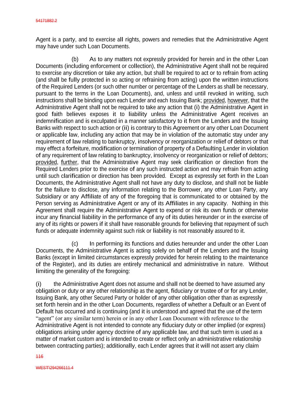 54171882.2 116 WEST\294266111.4 Agent is a party, and to exercise all rights, powers and remedies that the Administrative Agent may have under such Loan Documents. (b) As to any matters not expressly provided for herein and in the other Loan Documents (including enforcement or collection), the Administrative Agent shall not be required to exercise any discretion or take any action, but shall be required to act or to refrain from acting (and shall be fully protected in so acting or refraining from acting) upon the written instructions of the Required Lenders (or such other number or percentage of the Lenders as shall be necessary, pursuant to the terms in the Loan Documents), and, unless and until revoked in writing, such instructions shall be binding upon each Lender and each Issuing Bank; provided, however, that the Administrative Agent shall not be required to take any action that (i) the Administrative Agent in good faith believes exposes it to liability unless the Administrative Agent receives an indemnification and is exculpated in a manner satisfactory to it from the Lenders and the Issuing Banks with respect to such action or (ii) is contrary to this Agreement or any other Loan Document or applicable law, including any action that may be in violation of the automatic stay under any requirement of law relating to bankruptcy, insolvency or reorganization or relief of debtors or that may effect a forfeiture, modification or termination of property of a Defaulting Lender in violation of any requirement of law relating to bankruptcy, insolvency or reorganization or relief of debtors; provided, further, that the Administrative Agent may seek clarification or direction from the Required Lenders prior to the exercise of any such instructed action and may refrain from acting until such clarification or direction has been provided. Except as expressly set forth in the Loan Documents, the Administrative Agent shall not have any duty to disclose, and shall not be liable for the failure to disclose, any information relating to the Borrower, any other Loan Party, any Subsidiary or any Affiliate of any of the foregoing that is communicated to or obtained by the Person serving as Administrative Agent or any of its Affiliates in any capacity. Nothing in this Agreement shall require the Administrative Agent to expend or risk its own funds or otherwise incur any financial liability in the performance of any of its duties hereunder or in the exercise of any of its rights or powers if it shall have reasonable grounds for believing that repayment of such funds or adequate indemnity against such risk or liability is not reasonably assured to it. (c) In performing its functions and duties hereunder and under the other Loan Documents, the Administrative Agent is acting solely on behalf of the Lenders and the Issuing Banks (except in limited circumstances expressly provided for herein relating to the maintenance of the Register), and its duties are entirely mechanical and administrative in nature. Without limiting the generality of the foregoing: (i) the Administrative Agent does not assume and shall not be deemed to have assumed any obligation or duty or any other relationship as the agent, fiduciary or trustee of or for any Lender, Issuing Bank, any other Secured Party or holder of any other obligation other than as expressly set forth herein and in the other Loan Documents, regardless of whether a Default or an Event of Default has occurred and is continuing (and it is understood and agreed that the use of the term “agent” (or any similar term) herein or in any other Loan Document with reference to the Administrative Agent is not intended to connote any fiduciary duty or other implied (or express) obligations arising under agency doctrine of any applicable law, and that such term is used as a matter of market custom and is intended to create or reflect only an administrative relationship between contracting parties); additionally, each Lender agrees that it will not assert any claim