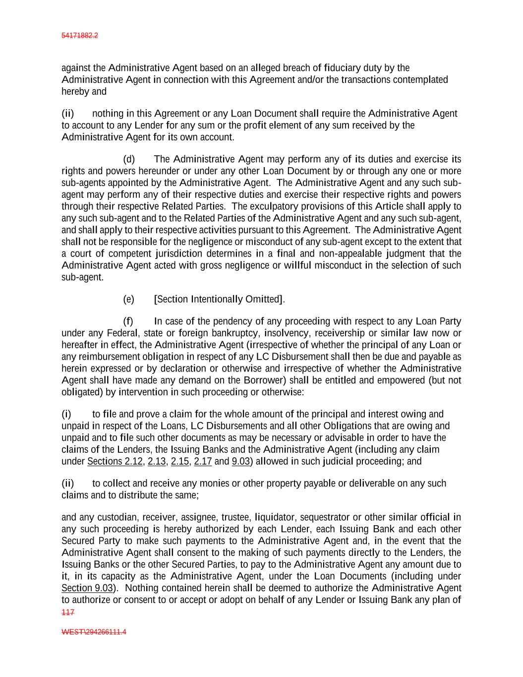 54171882.2 117 WEST\294266111.4 against the Administrative Agent based on an alleged breach of fiduciary duty by the Administrative Agent in connection with this Agreement and/or the transactions contemplated hereby and (ii) nothing in this Agreement or any Loan Document shall require the Administrative Agent to account to any Lender for any sum or the profit element of any sum received by the Administrative Agent for its own account. (d) The Administrative Agent may perform any of its duties and exercise its rights and powers hereunder or under any other Loan Document by or through any one or more sub-agents appointed by the Administrative Agent. The Administrative Agent and any such sub- agent may perform any of their respective duties and exercise their respective rights and powers through their respective Related Parties. The exculpatory provisions of this Article shall apply to any such sub-agent and to the Related Parties of the Administrative Agent and any such sub-agent, and shall apply to their respective activities pursuant to this Agreement. The Administrative Agent shall not be responsible for the negligence or misconduct of any sub-agent except to the extent that a court of competent jurisdiction determines in a final and non-appealable judgment that the Administrative Agent acted with gross negligence or willful misconduct in the selection of such sub-agent. (e) [Section Intentionally Omitted]. (f) In case of the pendency of any proceeding with respect to any Loan Party under any Federal, state or foreign bankruptcy, insolvency, receivership or similar law now or hereafter in effect, the Administrative Agent (irrespective of whether the principal of any Loan or any reimbursement obligation in respect of any LC Disbursement shall then be due and payable as herein expressed or by declaration or otherwise and irrespective of whether the Administrative Agent shall have made any demand on the Borrower) shall be entitled and empowered (but not obligated) by intervention in such proceeding or otherwise: (i) to file and prove a claim for the whole amount of the principal and interest owing and unpaid in respect of the Loans, LC Disbursements and all other Obligations that are owing and unpaid and to file such other documents as may be necessary or advisable in order to have the claims of the Lenders, the Issuing Banks and the Administrative Agent (including any claim under Sections 2.12, 2.13, 2.15, 2.17 and 9.03) allowed in such judicial proceeding; and (ii) to collect and receive any monies or other property payable or deliverable on any such claims and to distribute the same; and any custodian, receiver, assignee, trustee, liquidator, sequestrator or other similar official in any such proceeding is hereby authorized by each Lender, each Issuing Bank and each other Secured Party to make such payments to the Administrative Agent and, in the event that the Administrative Agent shall consent to the making of such payments directly to the Lenders, the Issuing Banks or the other Secured Parties, to pay to the Administrative Agent any amount due to it, in its capacity as the Administrative Agent, under the Loan Documents (including under Section 9.03). Nothing contained herein shall be deemed to authorize the Administrative Agent to authorize or consent to or accept or adopt on behalf of any Lender or Issuing Bank any plan of