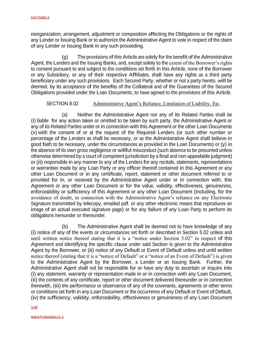 54171882.2 118 WEST\294266111.4 reorganization, arrangement, adjustment or composition affecting the Obligations or the rights of any Lender or Issuing Bank or to authorize the Administrative Agent to vote in respect of the claim of any Lender or Issuing Bank in any such proceeding. (g) The provisions of this Article are solely for the benefit of the Administrative Agent, the Lenders and the Issuing Banks, and, except solely to the extent of the Borrower’s rights to consent pursuant to and subject to the conditions set forth in this Article, none of the Borrower or any Subsidiary, or any of their respective Affiliates, shall have any rights as a third party beneficiary under any such provisions. Each Secured Party, whether or not a party hereto, will be deemed, by its acceptance of the benefits of the Collateral and of the Guarantees of the Secured Obligations provided under the Loan Documents, to have agreed to the provisions of this Article. SECTION 8.02 Administrative Agent’s Reliance, Limitation of Liability, Etc. (a) Neither the Administrative Agent nor any of its Related Parties shall be (i) liable for any action taken or omitted to be taken by such party, the Administrative Agent or any of its Related Parties under or in connection with this Agreement or the other Loan Documents (x) with the consent of or at the request of the Required Lenders (or such other number or percentage of the Lenders as shall be necessary, or as the Administrative Agent shall believe in good faith to be necessary, under the circumstances as provided in the Loan Documents) or (y) in the absence of its own gross negligence or willful misconduct (such absence to be presumed unless otherwise determined by a court of competent jurisdiction by a final and non-appealable judgment) or (ii) responsible in any manner to any of the Lenders for any recitals, statements, representations or warranties made by any Loan Party or any officer thereof contained in this Agreement or any other Loan Document or in any certificate, report, statement or other document referred to or provided for in, or received by the Administrative Agent under or in connection with, this Agreement or any other Loan Document or for the value, validity, effectiveness, genuineness, enforceability or sufficiency of this Agreement or any other Loan Document (including, for the avoidance of doubt, in connection with the Administrative Agent’s reliance on any Electronic Signature transmitted by telecopy, emailed pdf. or any other electronic means that reproduces an image of an actual executed signature page) or for any failure of any Loan Party to perform its obligations hereunder or thereunder. (b) The Administrative Agent shall be deemed not to have knowledge of any (i) notice of any of the events or circumstances set forth or described in Section 5.02 unless and until written notice thereof stating that it is a “notice under Section 5.02” in respect of this Agreement and identifying the specific clause under said Section is given to the Administrative Agent by the Borrower, or (ii) notice of any Default or Event of Default unless and until written notice thereof (stating that it is a “notice of Default” or a “notice of an Event of Default”) is given to the Administrative Agent by the Borrower, a Lender or an Issuing Bank. Further, the Administrative Agent shall not be responsible for or have any duty to ascertain or inquire into (i) any statement, warranty or representation made in or in connection with any Loan Document, (ii) the contents of any certificate, report or other document delivered thereunder or in connection therewith, (iii) the performance or observance of any of the covenants, agreements or other terms or conditions set forth in any Loan Document or the occurrence of any Default or Event of Default, (iv) the sufficiency, validity, enforceability, effectiveness or genuineness of any Loan Document