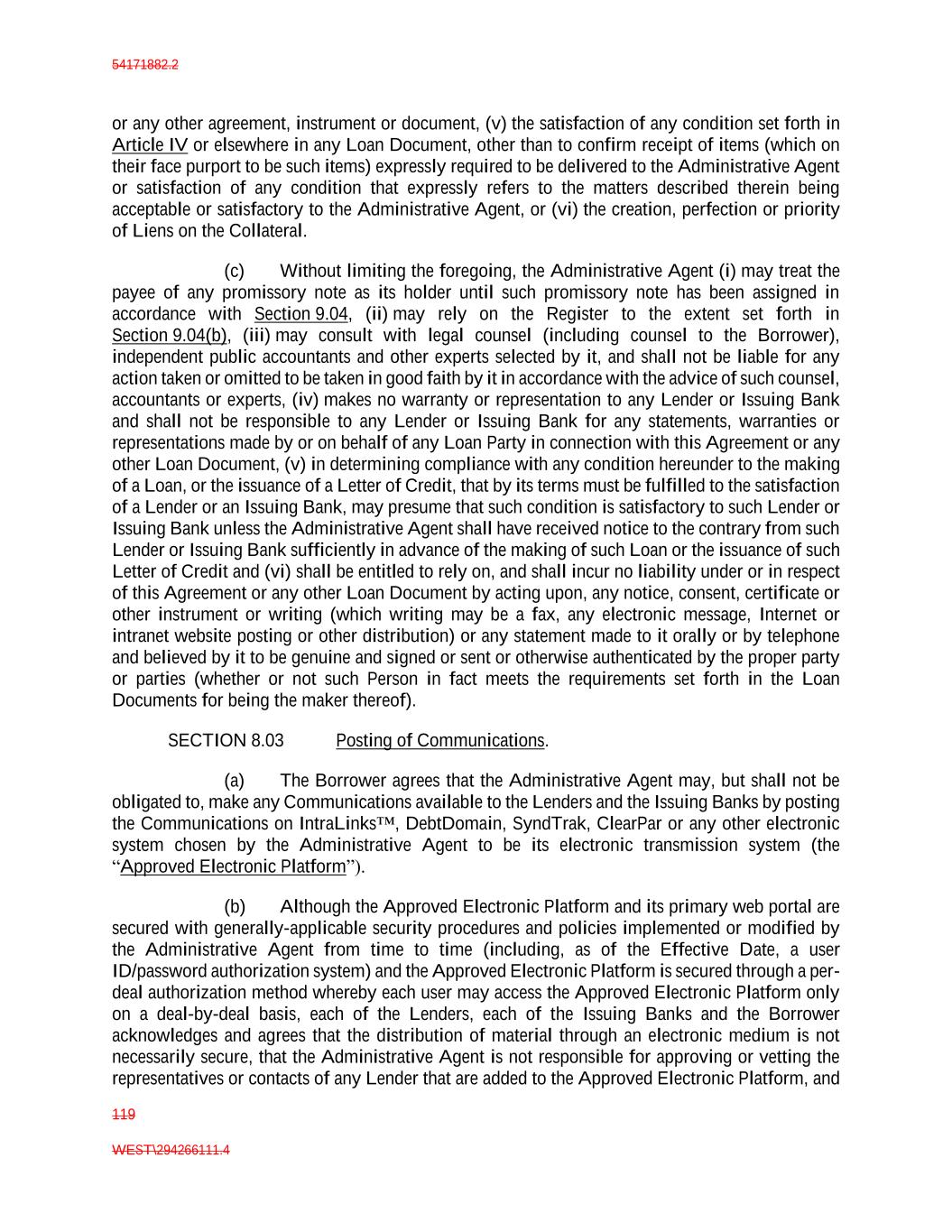 54171882.2 119 WEST\294266111.4 or any other agreement, instrument or document, (v) the satisfaction of any condition set forth in Article IV or elsewhere in any Loan Document, other than to confirm receipt of items (which on their face purport to be such items) expressly required to be delivered to the Administrative Agent or satisfaction of any condition that expressly refers to the matters described therein being acceptable or satisfactory to the Administrative Agent, or (vi) the creation, perfection or priority of Liens on the Collateral. (c) Without limiting the foregoing, the Administrative Agent (i) may treat the payee of any promissory note as its holder until such promissory note has been assigned in accordance with Section 9.04, (ii) may rely on the Register to the extent set forth in Section 9.04(b), (iii) may consult with legal counsel (including counsel to the Borrower), independent public accountants and other experts selected by it, and shall not be liable for any action taken or omitted to be taken in good faith by it in accordance with the advice of such counsel, accountants or experts, (iv) makes no warranty or representation to any Lender or Issuing Bank and shall not be responsible to any Lender or Issuing Bank for any statements, warranties or representations made by or on behalf of any Loan Party in connection with this Agreement or any other Loan Document, (v) in determining compliance with any condition hereunder to the making of a Loan, or the issuance of a Letter of Credit, that by its terms must be fulfilled to the satisfaction of a Lender or an Issuing Bank, may presume that such condition is satisfactory to such Lender or Issuing Bank unless the Administrative Agent shall have received notice to the contrary from such Lender or Issuing Bank sufficiently in advance of the making of such Loan or the issuance of such Letter of Credit and (vi) shall be entitled to rely on, and shall incur no liability under or in respect of this Agreement or any other Loan Document by acting upon, any notice, consent, certificate or other instrument or writing (which writing may be a fax, any electronic message, Internet or intranet website posting or other distribution) or any statement made to it orally or by telephone and believed by it to be genuine and signed or sent or otherwise authenticated by the proper party or parties (whether or not such Person in fact meets the requirements set forth in the Loan Documents for being the maker thereof). SECTION 8.03 Posting of Communications. (a) The Borrower agrees that the Administrative Agent may, but shall not be obligated to, make any Communications available to the Lenders and the Issuing Banks by posting the Communications on IntraLinks™, DebtDomain, SyndTrak, ClearPar or any other electronic system chosen by the Administrative Agent to be its electronic transmission system (the “Approved Electronic Platform”). (b) Although the Approved Electronic Platform and its primary web portal are secured with generally-applicable security procedures and policies implemented or modified by the Administrative Agent from time to time (including, as of the Effective Date, a user ID/password authorization system) and the Approved Electronic Platform is secured through a per- deal authorization method whereby each user may access the Approved Electronic Platform only on a deal-by-deal basis, each of the Lenders, each of the Issuing Banks and the Borrower acknowledges and agrees that the distribution of material through an electronic medium is not necessarily secure, that the Administrative Agent is not responsible for approving or vetting the representatives or contacts of any Lender that are added to the Approved Electronic Platform, and