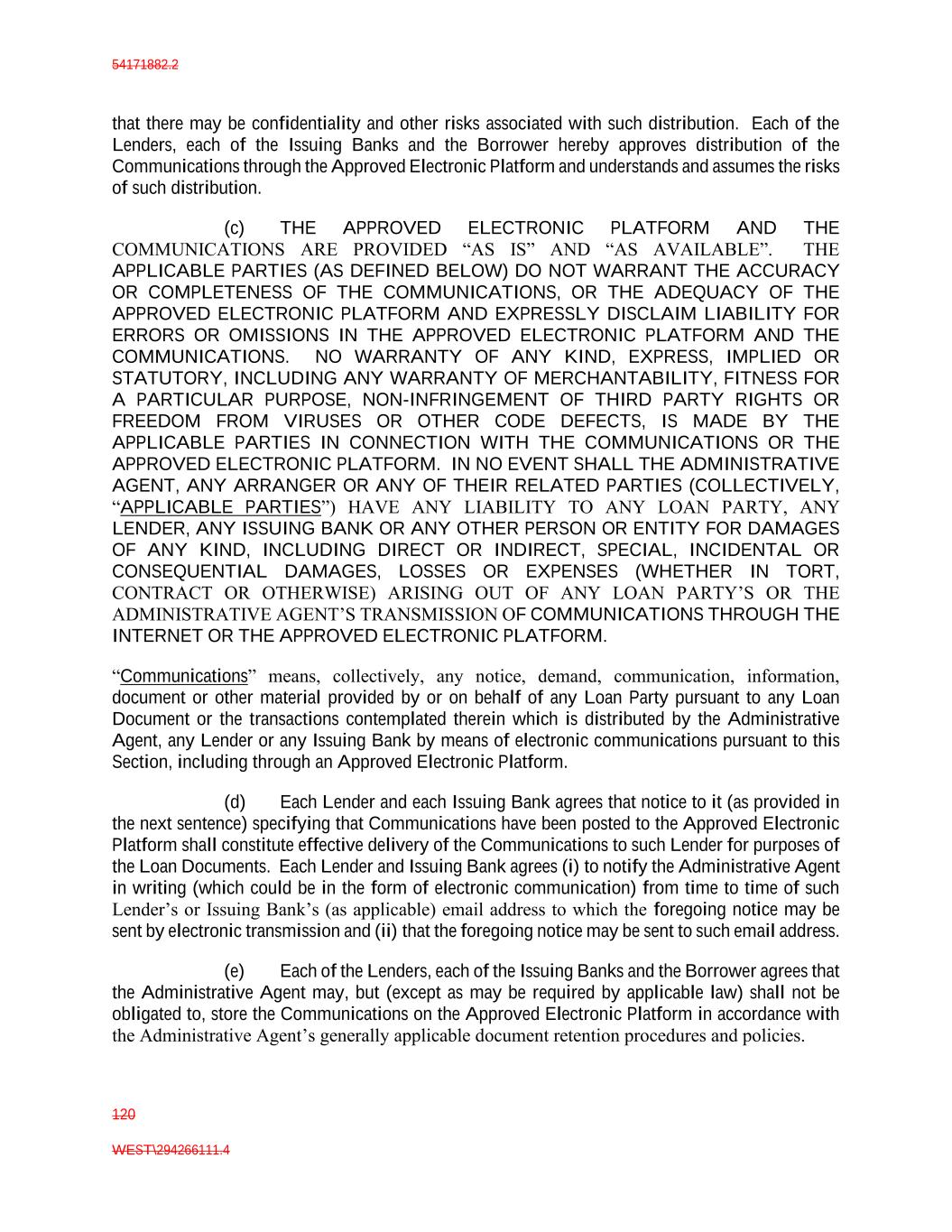 54171882.2 120 WEST\294266111.4 that there may be confidentiality and other risks associated with such distribution. Each of the Lenders, each of the Issuing Banks and the Borrower hereby approves distribution of the Communications through the Approved Electronic Platform and understands and assumes the risks of such distribution. (c) THE APPROVED ELECTRONIC PLATFORM AND THE COMMUNICATIONS ARE PROVIDED “AS IS” AND “AS AVAILABLE”. THE APPLICABLE PARTIES (AS DEFINED BELOW) DO NOT WARRANT THE ACCURACY OR COMPLETENESS OF THE COMMUNICATIONS, OR THE ADEQUACY OF THE APPROVED ELECTRONIC PLATFORM AND EXPRESSLY DISCLAIM LIABILITY FOR ERRORS OR OMISSIONS IN THE APPROVED ELECTRONIC PLATFORM AND THE COMMUNICATIONS. NO WARRANTY OF ANY KIND, EXPRESS, IMPLIED OR STATUTORY, INCLUDING ANY WARRANTY OF MERCHANTABILITY, FITNESS FOR A PARTICULAR PURPOSE, NON-INFRINGEMENT OF THIRD PARTY RIGHTS OR FREEDOM FROM VIRUSES OR OTHER CODE DEFECTS, IS MADE BY THE APPLICABLE PARTIES IN CONNECTION WITH THE COMMUNICATIONS OR THE APPROVED ELECTRONIC PLATFORM. IN NO EVENT SHALL THE ADMINISTRATIVE AGENT, ANY ARRANGER OR ANY OF THEIR RELATED PARTIES (COLLECTIVELY, “APPLICABLE PARTIES”) HAVE ANY LIABILITY TO ANY LOAN PARTY, ANY LENDER, ANY ISSUING BANK OR ANY OTHER PERSON OR ENTITY FOR DAMAGES OF ANY KIND, INCLUDING DIRECT OR INDIRECT, SPECIAL, INCIDENTAL OR CONSEQUENTIAL DAMAGES, LOSSES OR EXPENSES (WHETHER IN TORT, CONTRACT OR OTHERWISE) ARISING OUT OF ANY LOAN PARTY’S OR THE ADMINISTRATIVE AGENT’S TRANSMISSION OF COMMUNICATIONS THROUGH THE INTERNET OR THE APPROVED ELECTRONIC PLATFORM. “Communications” means, collectively, any notice, demand, communication, information, document or other material provided by or on behalf of any Loan Party pursuant to any Loan Document or the transactions contemplated therein which is distributed by the Administrative Agent, any Lender or any Issuing Bank by means of electronic communications pursuant to this Section, including through an Approved Electronic Platform. (d) Each Lender and each Issuing Bank agrees that notice to it (as provided in the next sentence) specifying that Communications have been posted to the Approved Electronic Platform shall constitute effective delivery of the Communications to such Lender for purposes of the Loan Documents. Each Lender and Issuing Bank agrees (i) to notify the Administrative Agent in writing (which could be in the form of electronic communication) from time to time of such Lender’s or Issuing Bank’s (as applicable) email address to which the foregoing notice may be sent by electronic transmission and (ii) that the foregoing notice may be sent to such email address. (e) Each of the Lenders, each of the Issuing Banks and the Borrower agrees that the Administrative Agent may, but (except as may be required by applicable law) shall not be obligated to, store the Communications on the Approved Electronic Platform in accordance with the Administrative Agent’s generally applicable document retention procedures and policies.