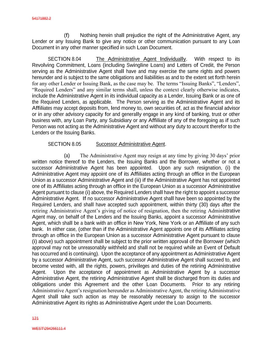 54171882.2 121 WEST\294266111.4 (f) Nothing herein shall prejudice the right of the Administrative Agent, any Lender or any Issuing Bank to give any notice or other communication pursuant to any Loan Document in any other manner specified in such Loan Document. SECTION 8.04 The Administrative Agent Individually. With respect to its Revolving Commitment, Loans (including Swingline Loans) and Letters of Credit, the Person serving as the Administrative Agent shall have and may exercise the same rights and powers hereunder and is subject to the same obligations and liabilities as and to the extent set forth herein for any other Lender or Issuing Bank, as the case may be. The terms “Issuing Banks”, “Lenders”, “Required Lenders” and any similar terms shall, unless the context clearly otherwise indicates, include the Administrative Agent in its individual capacity as a Lender, Issuing Bank or as one of the Required Lenders, as applicable. The Person serving as the Administrative Agent and its Affiliates may accept deposits from, lend money to, own securities of, act as the financial advisor or in any other advisory capacity for and generally engage in any kind of banking, trust or other business with, any Loan Party, any Subsidiary or any Affiliate of any of the foregoing as if such Person was not acting as the Administrative Agent and without any duty to account therefor to the Lenders or the Issuing Banks. SECTION 8.05 Successor Administrative Agent. (a) The Administrative Agent may resign at any time by giving 30 days’ prior written notice thereof to the Lenders, the Issuing Banks and the Borrower, whether or not a successor Administrative Agent has been appointed. Upon any such resignation, (i) the Administrative Agent may appoint one of its Affiliates acting through an office in the European Union as a successor Administrative Agent and (ii) if the Administrative Agent has not appointed one of its Affiliates acting through an office in the European Union as a successor Administrative Agent pursuant to clause (i) above, the Required Lenders shall have the right to appoint a successor Administrative Agent. If no successor Administrative Agent shall have been so appointed by the Required Lenders, and shall have accepted such appointment, within thirty (30) days after the retiring Administrative Agent’s giving of notice of resignation, then the retiring Administrative Agent may, on behalf of the Lenders and the Issuing Banks, appoint a successor Administrative Agent, which shall be a bank with an office in New York, New York or an Affiliate of any such bank. In either case, (other than if the Administrative Agent appoints one of its Affiliates acting through an office in the European Union as a successor Administrative Agent pursuant to clause (i) above) such appointment shall be subject to the prior written approval of the Borrower (which approval may not be unreasonably withheld and shall not be required while an Event of Default has occurred and is continuing). Upon the acceptance of any appointment as Administrative Agent by a successor Administrative Agent, such successor Administrative Agent shall succeed to, and become vested with, all the rights, powers, privileges and duties of the retiring Administrative Agent. Upon the acceptance of appointment as Administrative Agent by a successor Administrative Agent, the retiring Administrative Agent shall be discharged from its duties and obligations under this Agreement and the other Loan Documents. Prior to any retiring Administrative Agent’s resignation hereunder as Administrative Agent, the retiring Administrative Agent shall take such action as may be reasonably necessary to assign to the successor Administrative Agent its rights as Administrative Agent under the Loan Documents.