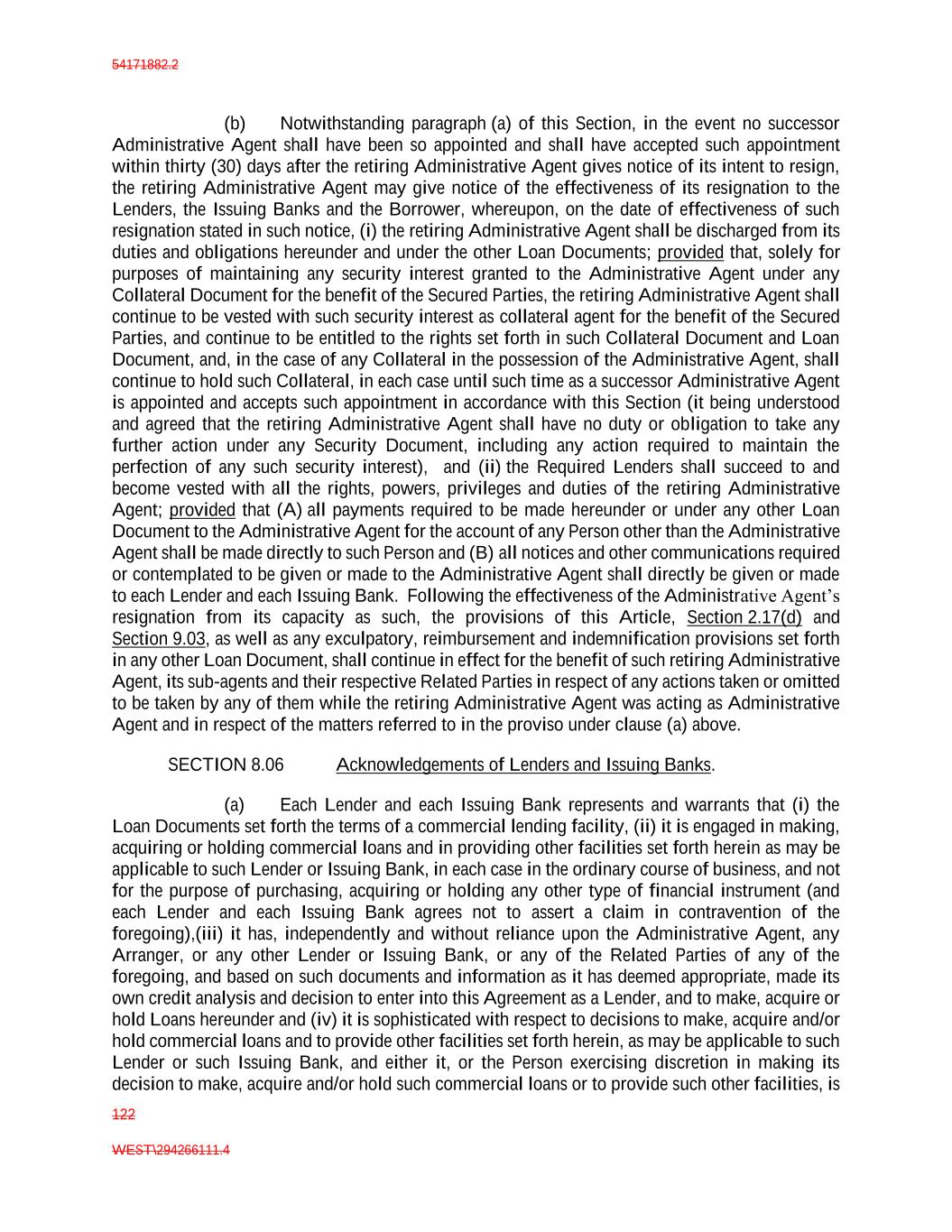 54171882.2 122 WEST\294266111.4 (b) Notwithstanding paragraph (a) of this Section, in the event no successor Administrative Agent shall have been so appointed and shall have accepted such appointment within thirty (30) days after the retiring Administrative Agent gives notice of its intent to resign, the retiring Administrative Agent may give notice of the effectiveness of its resignation to the Lenders, the Issuing Banks and the Borrower, whereupon, on the date of effectiveness of such resignation stated in such notice, (i) the retiring Administrative Agent shall be discharged from its duties and obligations hereunder and under the other Loan Documents; provided that, solely for purposes of maintaining any security interest granted to the Administrative Agent under any Collateral Document for the benefit of the Secured Parties, the retiring Administrative Agent shall continue to be vested with such security interest as collateral agent for the benefit of the Secured Parties, and continue to be entitled to the rights set forth in such Collateral Document and Loan Document, and, in the case of any Collateral in the possession of the Administrative Agent, shall continue to hold such Collateral, in each case until such time as a successor Administrative Agent is appointed and accepts such appointment in accordance with this Section (it being understood and agreed that the retiring Administrative Agent shall have no duty or obligation to take any further action under any Security Document, including any action required to maintain the perfection of any such security interest), and (ii) the Required Lenders shall succeed to and become vested with all the rights, powers, privileges and duties of the retiring Administrative Agent; provided that (A) all payments required to be made hereunder or under any other Loan Document to the Administrative Agent for the account of any Person other than the Administrative Agent shall be made directly to such Person and (B) all notices and other communications required or contemplated to be given or made to the Administrative Agent shall directly be given or made to each Lender and each Issuing Bank. Following the effectiveness of the Administrative Agent’s resignation from its capacity as such, the provisions of this Article, Section 2.17(d) and Section 9.03, as well as any exculpatory, reimbursement and indemnification provisions set forth in any other Loan Document, shall continue in effect for the benefit of such retiring Administrative Agent, its sub-agents and their respective Related Parties in respect of any actions taken or omitted to be taken by any of them while the retiring Administrative Agent was acting as Administrative Agent and in respect of the matters referred to in the proviso under clause (a) above. SECTION 8.06 Acknowledgements of Lenders and Issuing Banks. (a) Each Lender and each Issuing Bank represents and warrants that (i) the Loan Documents set forth the terms of a commercial lending facility, (ii) it is engaged in making, acquiring or holding commercial loans and in providing other facilities set forth herein as may be applicable to such Lender or Issuing Bank, in each case in the ordinary course of business, and not for the purpose of purchasing, acquiring or holding any other type of financial instrument (and each Lender and each Issuing Bank agrees not to assert a claim in contravention of the foregoing),(iii) it has, independently and without reliance upon the Administrative Agent, any Arranger, or any other Lender or Issuing Bank, or any of the Related Parties of any of the foregoing, and based on such documents and information as it has deemed appropriate, made its own credit analysis and decision to enter into this Agreement as a Lender, and to make, acquire or hold Loans hereunder and (iv) it is sophisticated with respect to decisions to make, acquire and/or hold commercial loans and to provide other facilities set forth herein, as may be applicable to such Lender or such Issuing Bank, and either it, or the Person exercising discretion in making its decision to make, acquire and/or hold such commercial loans or to provide such other facilities, is