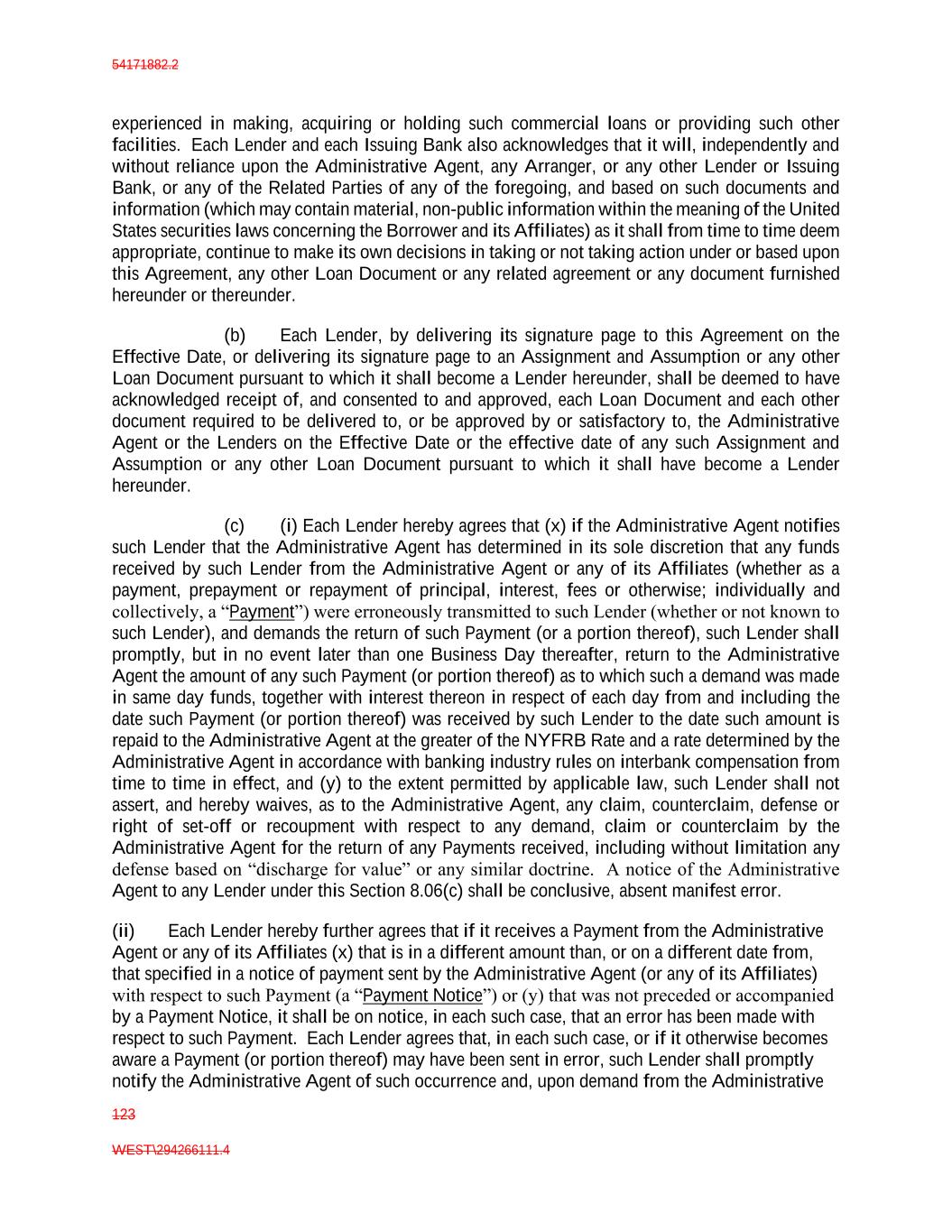 54171882.2 123 WEST\294266111.4 experienced in making, acquiring or holding such commercial loans or providing such other facilities. Each Lender and each Issuing Bank also acknowledges that it will, independently and without reliance upon the Administrative Agent, any Arranger, or any other Lender or Issuing Bank, or any of the Related Parties of any of the foregoing, and based on such documents and information (which may contain material, non-public information within the meaning of the United States securities laws concerning the Borrower and its Affiliates) as it shall from time to time deem appropriate, continue to make its own decisions in taking or not taking action under or based upon this Agreement, any other Loan Document or any related agreement or any document furnished hereunder or thereunder. (b) Each Lender, by delivering its signature page to this Agreement on the Effective Date, or delivering its signature page to an Assignment and Assumption or any other Loan Document pursuant to which it shall become a Lender hereunder, shall be deemed to have acknowledged receipt of, and consented to and approved, each Loan Document and each other document required to be delivered to, or be approved by or satisfactory to, the Administrative Agent or the Lenders on the Effective Date or the effective date of any such Assignment and Assumption or any other Loan Document pursuant to which it shall have become a Lender hereunder. (c) (i) Each Lender hereby agrees that (x) if the Administrative Agent notifies such Lender that the Administrative Agent has determined in its sole discretion that any funds received by such Lender from the Administrative Agent or any of its Affiliates (whether as a payment, prepayment or repayment of principal, interest, fees or otherwise; individually and collectively, a “Payment”) were erroneously transmitted to such Lender (whether or not known to such Lender), and demands the return of such Payment (or a portion thereof), such Lender shall promptly, but in no event later than one Business Day thereafter, return to the Administrative Agent the amount of any such Payment (or portion thereof) as to which such a demand was made in same day funds, together with interest thereon in respect of each day from and including the date such Payment (or portion thereof) was received by such Lender to the date such amount is repaid to the Administrative Agent at the greater of the NYFRB Rate and a rate determined by the Administrative Agent in accordance with banking industry rules on interbank compensation from time to time in effect, and (y) to the extent permitted by applicable law, such Lender shall not assert, and hereby waives, as to the Administrative Agent, any claim, counterclaim, defense or right of set-off or recoupment with respect to any demand, claim or counterclaim by the Administrative Agent for the return of any Payments received, including without limitation any defense based on “discharge for value” or any similar doctrine. A notice of the Administrative Agent to any Lender under this Section 8.06(c) shall be conclusive, absent manifest error. (ii) Each Lender hereby further agrees that if it receives a Payment from the Administrative Agent or any of its Affiliates (x) that is in a different amount than, or on a different date from, that specified in a notice of payment sent by the Administrative Agent (or any of its Affiliates) with respect to such Payment (a “Payment Notice”) or (y) that was not preceded or accompanied by a Payment Notice, it shall be on notice, in each such case, that an error has been made with respect to such Payment. Each Lender agrees that, in each such case, or if it otherwise becomes aware a Payment (or portion thereof) may have been sent in error, such Lender shall promptly notify the Administrative Agent of such occurrence and, upon demand from the Administrative