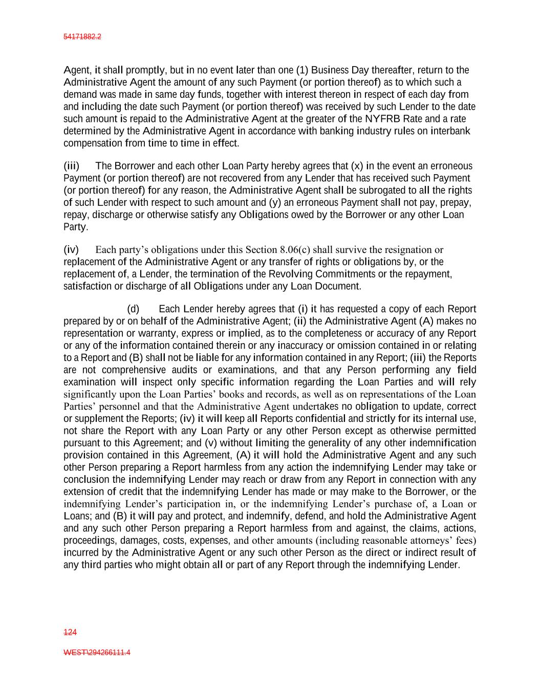 54171882.2 124 WEST\294266111.4 Agent, it shall promptly, but in no event later than one (1) Business Day thereafter, return to the Administrative Agent the amount of any such Payment (or portion thereof) as to which such a demand was made in same day funds, together with interest thereon in respect of each day from and including the date such Payment (or portion thereof) was received by such Lender to the date such amount is repaid to the Administrative Agent at the greater of the NYFRB Rate and a rate determined by the Administrative Agent in accordance with banking industry rules on interbank compensation from time to time in effect. (iii) The Borrower and each other Loan Party hereby agrees that (x) in the event an erroneous Payment (or portion thereof) are not recovered from any Lender that has received such Payment (or portion thereof) for any reason, the Administrative Agent shall be subrogated to all the rights of such Lender with respect to such amount and (y) an erroneous Payment shall not pay, prepay, repay, discharge or otherwise satisfy any Obligations owed by the Borrower or any other Loan Party. (iv) Each party’s obligations under this Section 8.06(c) shall survive the resignation or replacement of the Administrative Agent or any transfer of rights or obligations by, or the replacement of, a Lender, the termination of the Revolving Commitments or the repayment, satisfaction or discharge of all Obligations under any Loan Document. (d) Each Lender hereby agrees that (i) it has requested a copy of each Report prepared by or on behalf of the Administrative Agent; (ii) the Administrative Agent (A) makes no representation or warranty, express or implied, as to the completeness or accuracy of any Report or any of the information contained therein or any inaccuracy or omission contained in or relating to a Report and (B) shall not be liable for any information contained in any Report; (iii) the Reports are not comprehensive audits or examinations, and that any Person performing any field examination will inspect only specific information regarding the Loan Parties and will rely significantly upon the Loan Parties’ books and records, as well as on representations of the Loan Parties’ personnel and that the Administrative Agent undertakes no obligation to update, correct or supplement the Reports; (iv) it will keep all Reports confidential and strictly for its internal use, not share the Report with any Loan Party or any other Person except as otherwise permitted pursuant to this Agreement; and (v) without limiting the generality of any other indemnification provision contained in this Agreement, (A) it will hold the Administrative Agent and any such other Person preparing a Report harmless from any action the indemnifying Lender may take or conclusion the indemnifying Lender may reach or draw from any Report in connection with any extension of credit that the indemnifying Lender has made or may make to the Borrower, or the indemnifying Lender’s participation in, or the indemnifying Lender’s purchase of, a Loan or Loans; and (B) it will pay and protect, and indemnify, defend, and hold the Administrative Agent and any such other Person preparing a Report harmless from and against, the claims, actions, proceedings, damages, costs, expenses, and other amounts (including reasonable attorneys’ fees) incurred by the Administrative Agent or any such other Person as the direct or indirect result of any third parties who might obtain all or part of any Report through the indemnifying Lender.