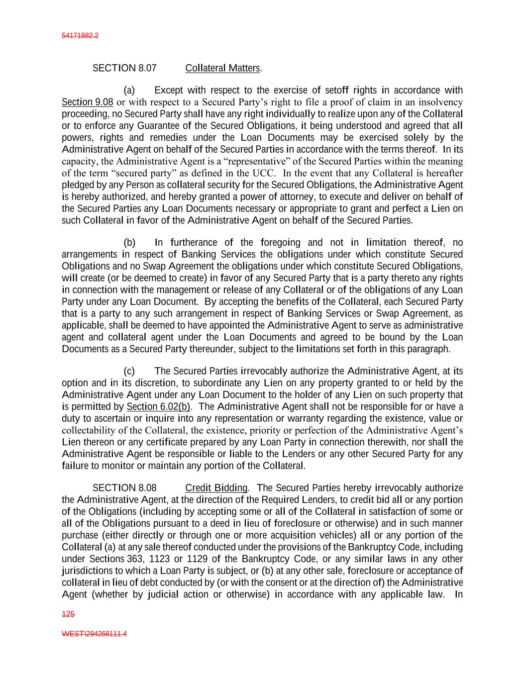 54171882.2 125 WEST\294266111.4 SECTION 8.07 Collateral Matters. (a) Except with respect to the exercise of setoff rights in accordance with Section 9.08 or with respect to a Secured Party’s right to file a proof of claim in an insolvency proceeding, no Secured Party shall have any right individually to realize upon any of the Collateral or to enforce any Guarantee of the Secured Obligations, it being understood and agreed that all powers, rights and remedies under the Loan Documents may be exercised solely by the Administrative Agent on behalf of the Secured Parties in accordance with the terms thereof. In its capacity, the Administrative Agent is a “representative” of the Secured Parties within the meaning of the term “secured party” as defined in the UCC. In the event that any Collateral is hereafter pledged by any Person as collateral security for the Secured Obligations, the Administrative Agent is hereby authorized, and hereby granted a power of attorney, to execute and deliver on behalf of the Secured Parties any Loan Documents necessary or appropriate to grant and perfect a Lien on such Collateral in favor of the Administrative Agent on behalf of the Secured Parties. (b) In furtherance of the foregoing and not in limitation thereof, no arrangements in respect of Banking Services the obligations under which constitute Secured Obligations and no Swap Agreement the obligations under which constitute Secured Obligations, will create (or be deemed to create) in favor of any Secured Party that is a party thereto any rights in connection with the management or release of any Collateral or of the obligations of any Loan Party under any Loan Document. By accepting the benefits of the Collateral, each Secured Party that is a party to any such arrangement in respect of Banking Services or Swap Agreement, as applicable, shall be deemed to have appointed the Administrative Agent to serve as administrative agent and collateral agent under the Loan Documents and agreed to be bound by the Loan Documents as a Secured Party thereunder, subject to the limitations set forth in this paragraph. (c) The Secured Parties irrevocably authorize the Administrative Agent, at its option and in its discretion, to subordinate any Lien on any property granted to or held by the Administrative Agent under any Loan Document to the holder of any Lien on such property that is permitted by Section 6.02(b). The Administrative Agent shall not be responsible for or have a duty to ascertain or inquire into any representation or warranty regarding the existence, value or collectability of the Collateral, the existence, priority or perfection of the Administrative Agent’s Lien thereon or any certificate prepared by any Loan Party in connection therewith, nor shall the Administrative Agent be responsible or liable to the Lenders or any other Secured Party for any failure to monitor or maintain any portion of the Collateral. SECTION 8.08 Credit Bidding. The Secured Parties hereby irrevocably authorize the Administrative Agent, at the direction of the Required Lenders, to credit bid all or any portion of the Obligations (including by accepting some or all of the Collateral in satisfaction of some or all of the Obligations pursuant to a deed in lieu of foreclosure or otherwise) and in such manner purchase (either directly or through one or more acquisition vehicles) all or any portion of the Collateral (a) at any sale thereof conducted under the provisions of the Bankruptcy Code, including under Sections 363, 1123 or 1129 of the Bankruptcy Code, or any similar laws in any other jurisdictions to which a Loan Party is subject, or (b) at any other sale, foreclosure or acceptance of collateral in lieu of debt conducted by (or with the consent or at the direction of) the Administrative Agent (whether by judicial action or otherwise) in accordance with any applicable law. In