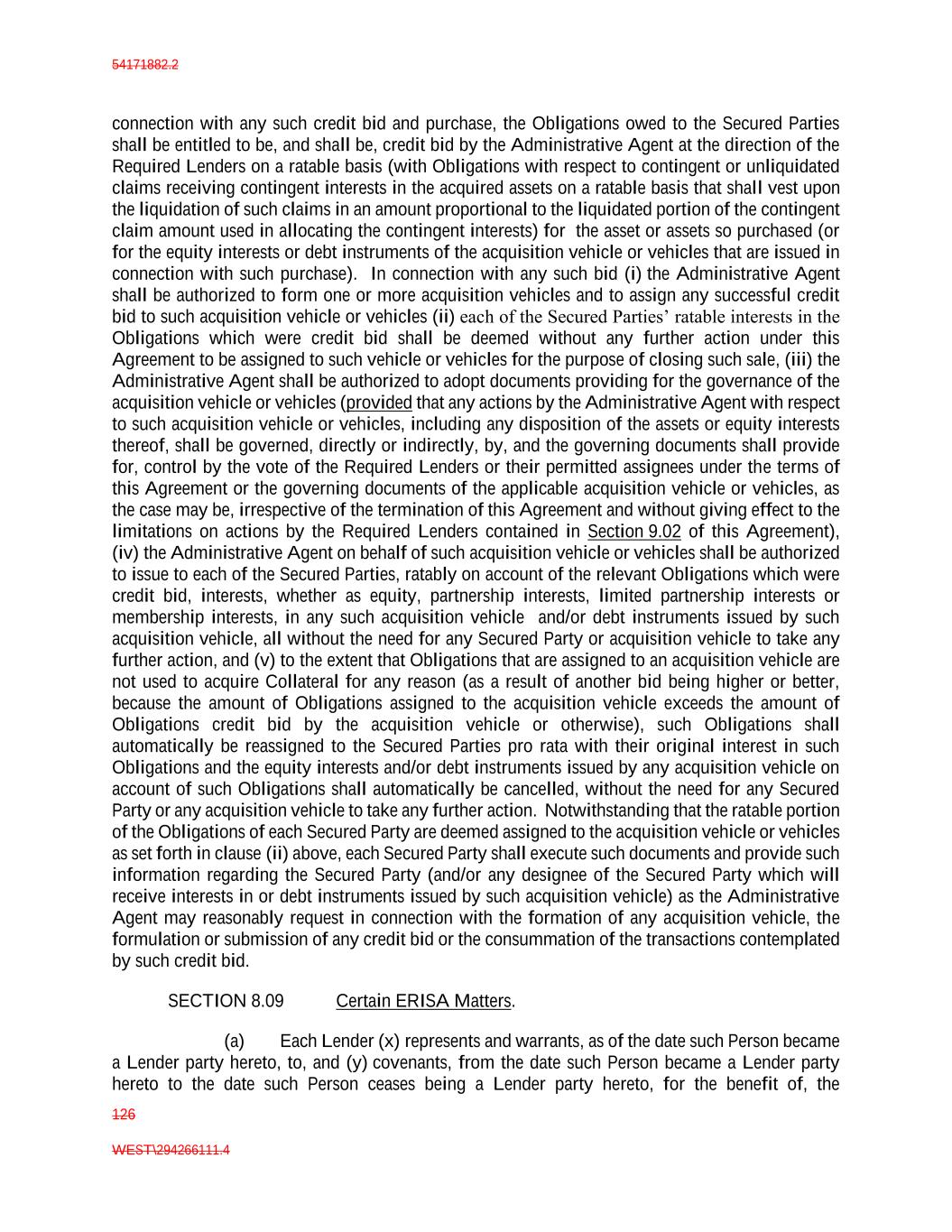 54171882.2 126 WEST\294266111.4 connection with any such credit bid and purchase, the Obligations owed to the Secured Parties shall be entitled to be, and shall be, credit bid by the Administrative Agent at the direction of the Required Lenders on a ratable basis (with Obligations with respect to contingent or unliquidated claims receiving contingent interests in the acquired assets on a ratable basis that shall vest upon the liquidation of such claims in an amount proportional to the liquidated portion of the contingent claim amount used in allocating the contingent interests) for the asset or assets so purchased (or for the equity interests or debt instruments of the acquisition vehicle or vehicles that are issued in connection with such purchase). In connection with any such bid (i) the Administrative Agent shall be authorized to form one or more acquisition vehicles and to assign any successful credit bid to such acquisition vehicle or vehicles (ii) each of the Secured Parties’ ratable interests in the Obligations which were credit bid shall be deemed without any further action under this Agreement to be assigned to such vehicle or vehicles for the purpose of closing such sale, (iii) the Administrative Agent shall be authorized to adopt documents providing for the governance of the acquisition vehicle or vehicles (provided that any actions by the Administrative Agent with respect to such acquisition vehicle or vehicles, including any disposition of the assets or equity interests thereof, shall be governed, directly or indirectly, by, and the governing documents shall provide for, control by the vote of the Required Lenders or their permitted assignees under the terms of this Agreement or the governing documents of the applicable acquisition vehicle or vehicles, as the case may be, irrespective of the termination of this Agreement and without giving effect to the limitations on actions by the Required Lenders contained in Section 9.02 of this Agreement), (iv) the Administrative Agent on behalf of such acquisition vehicle or vehicles shall be authorized to issue to each of the Secured Parties, ratably on account of the relevant Obligations which were credit bid, interests, whether as equity, partnership interests, limited partnership interests or membership interests, in any such acquisition vehicle and/or debt instruments issued by such acquisition vehicle, all without the need for any Secured Party or acquisition vehicle to take any further action, and (v) to the extent that Obligations that are assigned to an acquisition vehicle are not used to acquire Collateral for any reason (as a result of another bid being higher or better, because the amount of Obligations assigned to the acquisition vehicle exceeds the amount of Obligations credit bid by the acquisition vehicle or otherwise), such Obligations shall automatically be reassigned to the Secured Parties pro rata with their original interest in such Obligations and the equity interests and/or debt instruments issued by any acquisition vehicle on account of such Obligations shall automatically be cancelled, without the need for any Secured Party or any acquisition vehicle to take any further action. Notwithstanding that the ratable portion of the Obligations of each Secured Party are deemed assigned to the acquisition vehicle or vehicles as set forth in clause (ii) above, each Secured Party shall execute such documents and provide such information regarding the Secured Party (and/or any designee of the Secured Party which will receive interests in or debt instruments issued by such acquisition vehicle) as the Administrative Agent may reasonably request in connection with the formation of any acquisition vehicle, the formulation or submission of any credit bid or the consummation of the transactions contemplated by such credit bid. SECTION 8.09 Certain ERISA Matters. (a) Each Lender (x) represents and warrants, as of the date such Person became a Lender party hereto, to, and (y) covenants, from the date such Person became a Lender party hereto to the date such Person ceases being a Lender party hereto, for the benefit of, the