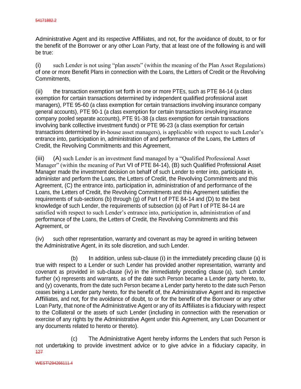 54171882.2 127 WEST\294266111.4 Administrative Agent and its respective Affiliates, and not, for the avoidance of doubt, to or for the benefit of the Borrower or any other Loan Party, that at least one of the following is and will be true: (i) such Lender is not using “plan assets” (within the meaning of the Plan Asset Regulations) of one or more Benefit Plans in connection with the Loans, the Letters of Credit or the Revolving Commitments, (ii) the transaction exemption set forth in one or more PTEs, such as PTE 84-14 (a class exemption for certain transactions determined by independent qualified professional asset managers), PTE 95-60 (a class exemption for certain transactions involving insurance company general accounts), PTE 90-1 (a class exemption for certain transactions involving insurance company pooled separate accounts), PTE 91-38 (a class exemption for certain transactions involving bank collective investment funds) or PTE 96-23 (a class exemption for certain transactions determined by in-house asset managers), is applicable with respect to such Lender’s entrance into, participation in, administration of and performance of the Loans, the Letters of Credit, the Revolving Commitments and this Agreement, (iii) (A) such Lender is an investment fund managed by a “Qualified Professional Asset Manager” (within the meaning of Part VI of PTE 84-14), (B) such Qualified Professional Asset Manager made the investment decision on behalf of such Lender to enter into, participate in, administer and perform the Loans, the Letters of Credit, the Revolving Commitments and this Agreement, (C) the entrance into, participation in, administration of and performance of the Loans, the Letters of Credit, the Revolving Commitments and this Agreement satisfies the requirements of sub-sections (b) through (g) of Part I of PTE 84-14 and (D) to the best knowledge of such Lender, the requirements of subsection (a) of Part I of PTE 84-14 are satisfied with respect to such Lender’s entrance into, participation in, administration of and performance of the Loans, the Letters of Credit, the Revolving Commitments and this Agreement, or (iv) such other representation, warranty and covenant as may be agreed in writing between the Administrative Agent, in its sole discretion, and such Lender. (b) In addition, unless sub-clause (i) in the immediately preceding clause (a) is true with respect to a Lender or such Lender has provided another representation, warranty and covenant as provided in sub-clause (iv) in the immediately preceding clause (a), such Lender further (x) represents and warrants, as of the date such Person became a Lender party hereto, to, and (y) covenants, from the date such Person became a Lender party hereto to the date such Person ceases being a Lender party hereto, for the benefit of, the Administrative Agent and its respective Affiliates, and not, for the avoidance of doubt, to or for the benefit of the Borrower or any other Loan Party, that none of the Administrative Agent or any of its Affiliates is a fiduciary with respect to the Collateral or the assets of such Lender (including in connection with the reservation or exercise of any rights by the Administrative Agent under this Agreement, any Loan Document or any documents related to hereto or thereto). (c) The Administrative Agent hereby informs the Lenders that such Person is not undertaking to provide investment advice or to give advice in a fiduciary capacity, in