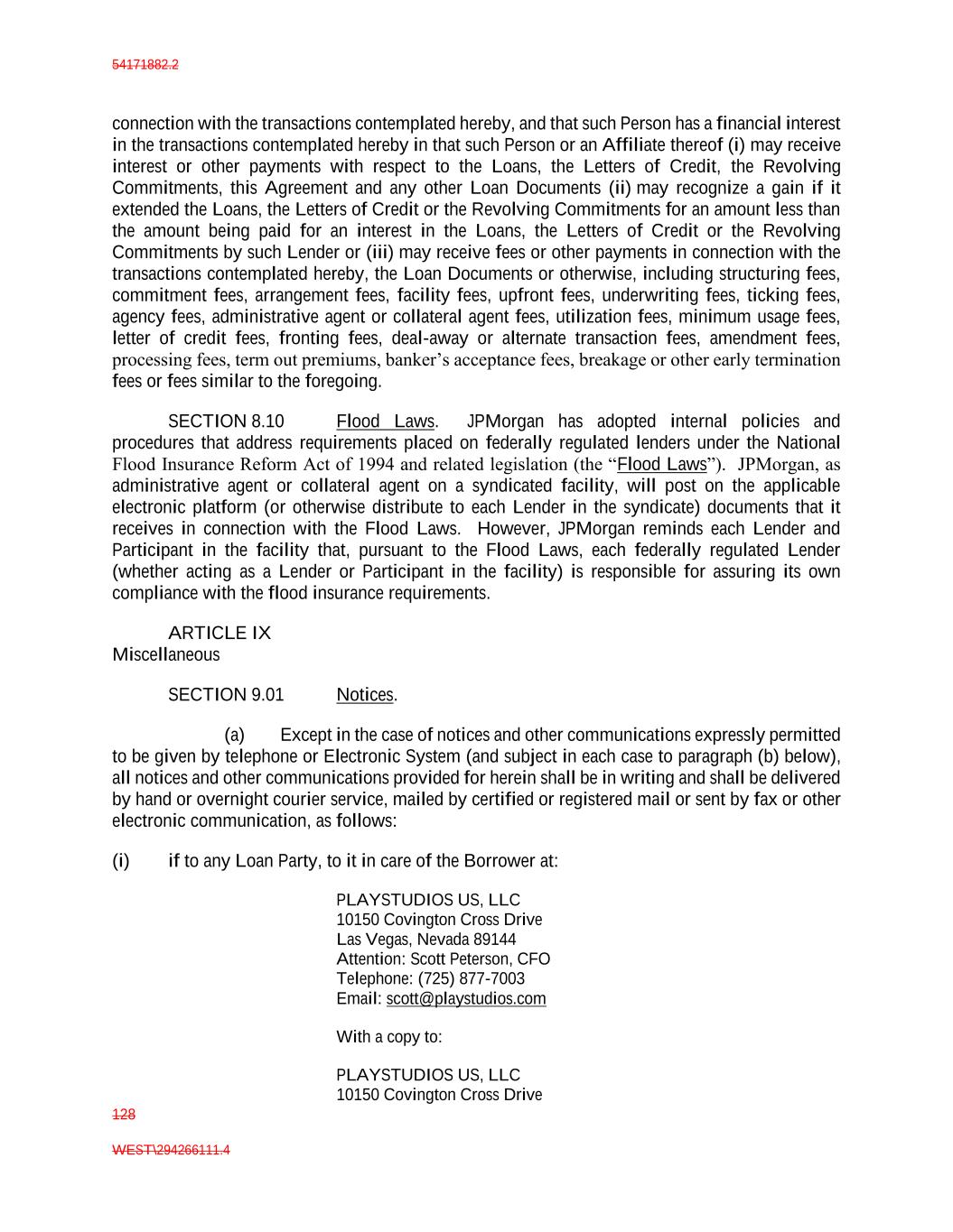 54171882.2 128 WEST\294266111.4 connection with the transactions contemplated hereby, and that such Person has a financial interest in the transactions contemplated hereby in that such Person or an Affiliate thereof (i) may receive interest or other payments with respect to the Loans, the Letters of Credit, the Revolving Commitments, this Agreement and any other Loan Documents (ii) may recognize a gain if it extended the Loans, the Letters of Credit or the Revolving Commitments for an amount less than the amount being paid for an interest in the Loans, the Letters of Credit or the Revolving Commitments by such Lender or (iii) may receive fees or other payments in connection with the transactions contemplated hereby, the Loan Documents or otherwise, including structuring fees, commitment fees, arrangement fees, facility fees, upfront fees, underwriting fees, ticking fees, agency fees, administrative agent or collateral agent fees, utilization fees, minimum usage fees, letter of credit fees, fronting fees, deal-away or alternate transaction fees, amendment fees, processing fees, term out premiums, banker’s acceptance fees, breakage or other early termination fees or fees similar to the foregoing. SECTION 8.10 Flood Laws. JPMorgan has adopted internal policies and procedures that address requirements placed on federally regulated lenders under the National Flood Insurance Reform Act of 1994 and related legislation (the “Flood Laws”). JPMorgan, as administrative agent or collateral agent on a syndicated facility, will post on the applicable electronic platform (or otherwise distribute to each Lender in the syndicate) documents that it receives in connection with the Flood Laws. However, JPMorgan reminds each Lender and Participant in the facility that, pursuant to the Flood Laws, each federally regulated Lender (whether acting as a Lender or Participant in the facility) is responsible for assuring its own compliance with the flood insurance requirements. ARTICLE IX Miscellaneous SECTION 9.01 Notices. (a) Except in the case of notices and other communications expressly permitted to be given by telephone or Electronic System (and subject in each case to paragraph (b) below), all notices and other communications provided for herein shall be in writing and shall be delivered by hand or overnight courier service, mailed by certified or registered mail or sent by fax or other electronic communication, as follows: (i) if to any Loan Party, to it in care of the Borrower at: PLAYSTUDIOS US, LLC 10150 Covington Cross Drive Las Vegas, Nevada 89144 Attention: Scott Peterson, CFO Telephone: (725) 877-7003 Email: scott@playstudios.com With a copy to: PLAYSTUDIOS US, LLC 10150 Covington Cross Drive