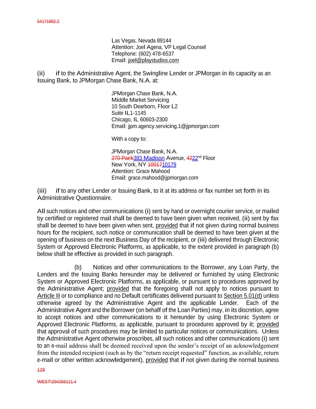 54171882.2 129 WEST\294266111.4 Las Vegas, Nevada 89144 Attention: Joel Agena, VP Legal Counsel Telephone: (602) 478-6537 Email: joel@playstudios.com (ii) if to the Administrative Agent, the Swingline Lender or JPMorgan in its capacity as an Issuing Bank, to JPMorgan Chase Bank, N.A. at: JPMorgan Chase Bank, N.A. Middle Market Servicing 10 South Dearborn, Floor L2 Suite IL1-1145 Chicago, IL 60603-2300 Email: jpm.agency.servicing.1@jpmorgan.com With a copy to: JPMorgan Chase Bank, N.A. 270 Park383 Madison Avenue, 4222nd Floor New York, NY 1001710179 Attention: Grace Mahood Email: grace.mahood@jpmorgan.com (iii) if to any other Lender or Issuing Bank, to it at its address or fax number set forth in its Administrative Questionnaire. All such notices and other communications (i) sent by hand or overnight courier service, or mailed by certified or registered mail shall be deemed to have been given when received, (ii) sent by fax shall be deemed to have been given when sent, provided that if not given during normal business hours for the recipient, such notice or communication shall be deemed to have been given at the opening of business on the next Business Day of the recipient, or (iii) delivered through Electronic System or Approved Electronic Platforms, as applicable, to the extent provided in paragraph (b) below shall be effective as provided in such paragraph. (b) Notices and other communications to the Borrower, any Loan Party, the Lenders and the Issuing Banks hereunder may be delivered or furnished by using Electronic System or Approved Electronic Platforms, as applicable, or pursuant to procedures approved by the Administrative Agent; provided that the foregoing shall not apply to notices pursuant to Article II or to compliance and no Default certificates delivered pursuant to Section 5.01(d) unless otherwise agreed by the Administrative Agent and the applicable Lender. Each of the Administrative Agent and the Borrower (on behalf of the Loan Parties) may, in its discretion, agree to accept notices and other communications to it hereunder by using Electronic System or Approved Electronic Platforms, as applicable, pursuant to procedures approved by it; provided that approval of such procedures may be limited to particular notices or communications. Unless the Administrative Agent otherwise proscribes, all such notices and other communications (i) sent to an e-mail address shall be deemed received upon the sender’s receipt of an acknowledgement from the intended recipient (such as by the “return receipt requested” function, as available, return e-mail or other written acknowledgement), provided that if not given during the normal business