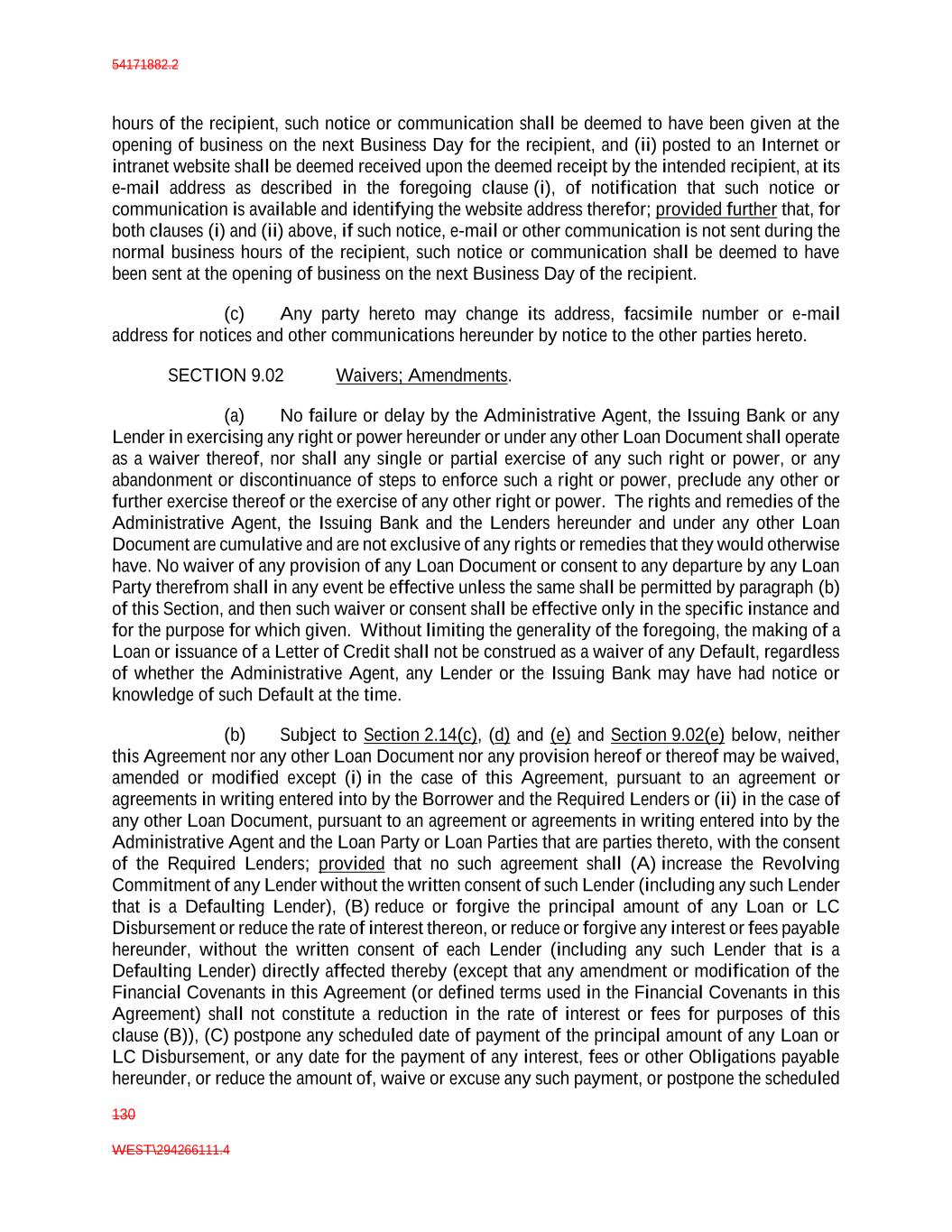54171882.2 130 WEST\294266111.4 hours of the recipient, such notice or communication shall be deemed to have been given at the opening of business on the next Business Day for the recipient, and (ii) posted to an Internet or intranet website shall be deemed received upon the deemed receipt by the intended recipient, at its e-mail address as described in the foregoing clause (i), of notification that such notice or communication is available and identifying the website address therefor; provided further that, for both clauses (i) and (ii) above, if such notice, e-mail or other communication is not sent during the normal business hours of the recipient, such notice or communication shall be deemed to have been sent at the opening of business on the next Business Day of the recipient. (c) Any party hereto may change its address, facsimile number or e-mail address for notices and other communications hereunder by notice to the other parties hereto. SECTION 9.02 Waivers; Amendments. (a) No failure or delay by the Administrative Agent, the Issuing Bank or any Lender in exercising any right or power hereunder or under any other Loan Document shall operate as a waiver thereof, nor shall any single or partial exercise of any such right or power, or any abandonment or discontinuance of steps to enforce such a right or power, preclude any other or further exercise thereof or the exercise of any other right or power. The rights and remedies of the Administrative Agent, the Issuing Bank and the Lenders hereunder and under any other Loan Document are cumulative and are not exclusive of any rights or remedies that they would otherwise have. No waiver of any provision of any Loan Document or consent to any departure by any Loan Party therefrom shall in any event be effective unless the same shall be permitted by paragraph (b) of this Section, and then such waiver or consent shall be effective only in the specific instance and for the purpose for which given. Without limiting the generality of the foregoing, the making of a Loan or issuance of a Letter of Credit shall not be construed as a waiver of any Default, regardless of whether the Administrative Agent, any Lender or the Issuing Bank may have had notice or knowledge of such Default at the time. (b) Subject to Section 2.14(c), (d) and (e) and Section 9.02(e) below, neither this Agreement nor any other Loan Document nor any provision hereof or thereof may be waived, amended or modified except (i) in the case of this Agreement, pursuant to an agreement or agreements in writing entered into by the Borrower and the Required Lenders or (ii) in the case of any other Loan Document, pursuant to an agreement or agreements in writing entered into by the Administrative Agent and the Loan Party or Loan Parties that are parties thereto, with the consent of the Required Lenders; provided that no such agreement shall (A) increase the Revolving Commitment of any Lender without the written consent of such Lender (including any such Lender that is a Defaulting Lender), (B) reduce or forgive the principal amount of any Loan or LC Disbursement or reduce the rate of interest thereon, or reduce or forgive any interest or fees payable hereunder, without the written consent of each Lender (including any such Lender that is a Defaulting Lender) directly affected thereby (except that any amendment or modification of the Financial Covenants in this Agreement (or defined terms used in the Financial Covenants in this Agreement) shall not constitute a reduction in the rate of interest or fees for purposes of this clause (B)), (C) postpone any scheduled date of payment of the principal amount of any Loan or LC Disbursement, or any date for the payment of any interest, fees or other Obligations payable hereunder, or reduce the amount of, waive or excuse any such payment, or postpone the scheduled