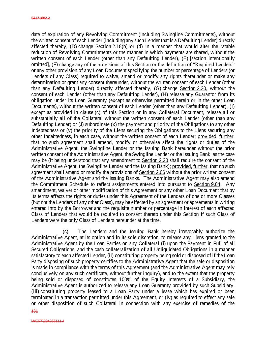 54171882.2 131 WEST\294266111.4 date of expiration of any Revolving Commitment (including Swingline Commitments), without the written consent of each Lender (including any such Lender that is a Defaulting Lender) directly affected thereby, (D) change Section 2.18(b) or (d) in a manner that would alter the ratable reduction of Revolving Commitments or the manner in which payments are shared, without the written consent of each Lender (other than any Defaulting Lender), (E) [section intentionally omitted], (F) change any of the provisions of this Section or the definition of “Required Lenders” or any other provision of any Loan Document specifying the number or percentage of Lenders (or Lenders of any Class) required to waive, amend or modify any rights thereunder or make any determination or grant any consent thereunder, without the written consent of each Lender (other than any Defaulting Lender) directly affected thereby, (G) change Section 2.20, without the consent of each Lender (other than any Defaulting Lender), (H) release any Guarantor from its obligation under its Loan Guaranty (except as otherwise permitted herein or in the other Loan Documents), without the written consent of each Lender (other than any Defaulting Lender), (I) except as provided in clause (c) of this Section or in any Collateral Document, release all or substantially all of the Collateral without the written consent of each Lender (other than any Defaulting Lender) or (J) subordinate (x) the payment and priority of the Obligations to any other Indebtedness or (y) the priority of the Liens securing the Obligations to the Liens securing any other Indebtedness, in each case, without the written consent of each Lender; provided, further, that no such agreement shall amend, modify or otherwise affect the rights or duties of the Administrative Agent, the Swingline Lender or the Issuing Bank hereunder without the prior written consent of the Administrative Agent, the Swingline Lender or the Issuing Bank, as the case may be (it being understood that any amendment to Section 2.20 shall require the consent of the Administrative Agent, the Swingline Lender and the Issuing Bank); provided, further, that no such agreement shall amend or modify the provisions of Section 2.06 without the prior written consent of the Administrative Agent and the Issuing Banks. The Administrative Agent may also amend the Commitment Schedule to reflect assignments entered into pursuant to Section 9.04. Any amendment, waiver or other modification of this Agreement or any other Loan Document that by its terms affects the rights or duties under this Agreement of the Lenders of one or more Classes (but not the Lenders of any other Class), may be effected by an agreement or agreements in writing entered into by the Borrower and the requisite number or percentage in interest of each affected Class of Lenders that would be required to consent thereto under this Section if such Class of Lenders were the only Class of Lenders hereunder at the time. (c) The Lenders and the Issuing Bank hereby irrevocably authorize the Administrative Agent, at its option and in its sole discretion, to release any Liens granted to the Administrative Agent by the Loan Parties on any Collateral (i) upon the Payment in Full of all Secured Obligations, and the cash collateralization of all Unliquidated Obligations in a manner satisfactory to each affected Lender, (ii) constituting property being sold or disposed of if the Loan Party disposing of such property certifies to the Administrative Agent that the sale or disposition is made in compliance with the terms of this Agreement (and the Administrative Agent may rely conclusively on any such certificate, without further inquiry), and to the extent that the property being sold or disposed of constitutes 100% of the Equity Interests of a Subsidiary, the Administrative Agent is authorized to release any Loan Guaranty provided by such Subsidiary, (iii) constituting property leased to a Loan Party under a lease which has expired or been terminated in a transaction permitted under this Agreement, or (iv) as required to effect any sale or other disposition of such Collateral in connection with any exercise of remedies of the